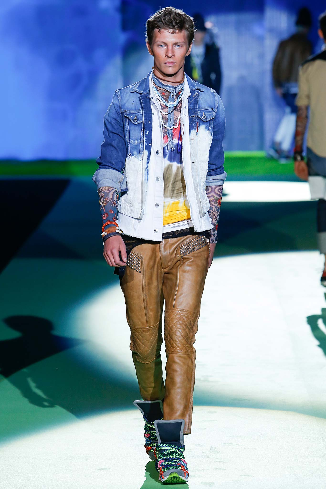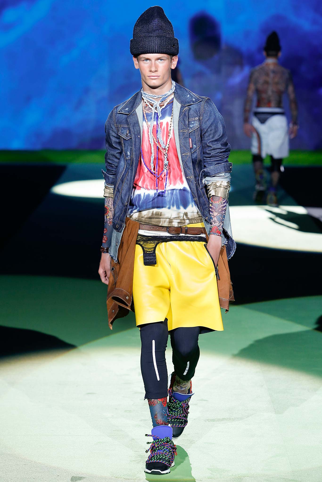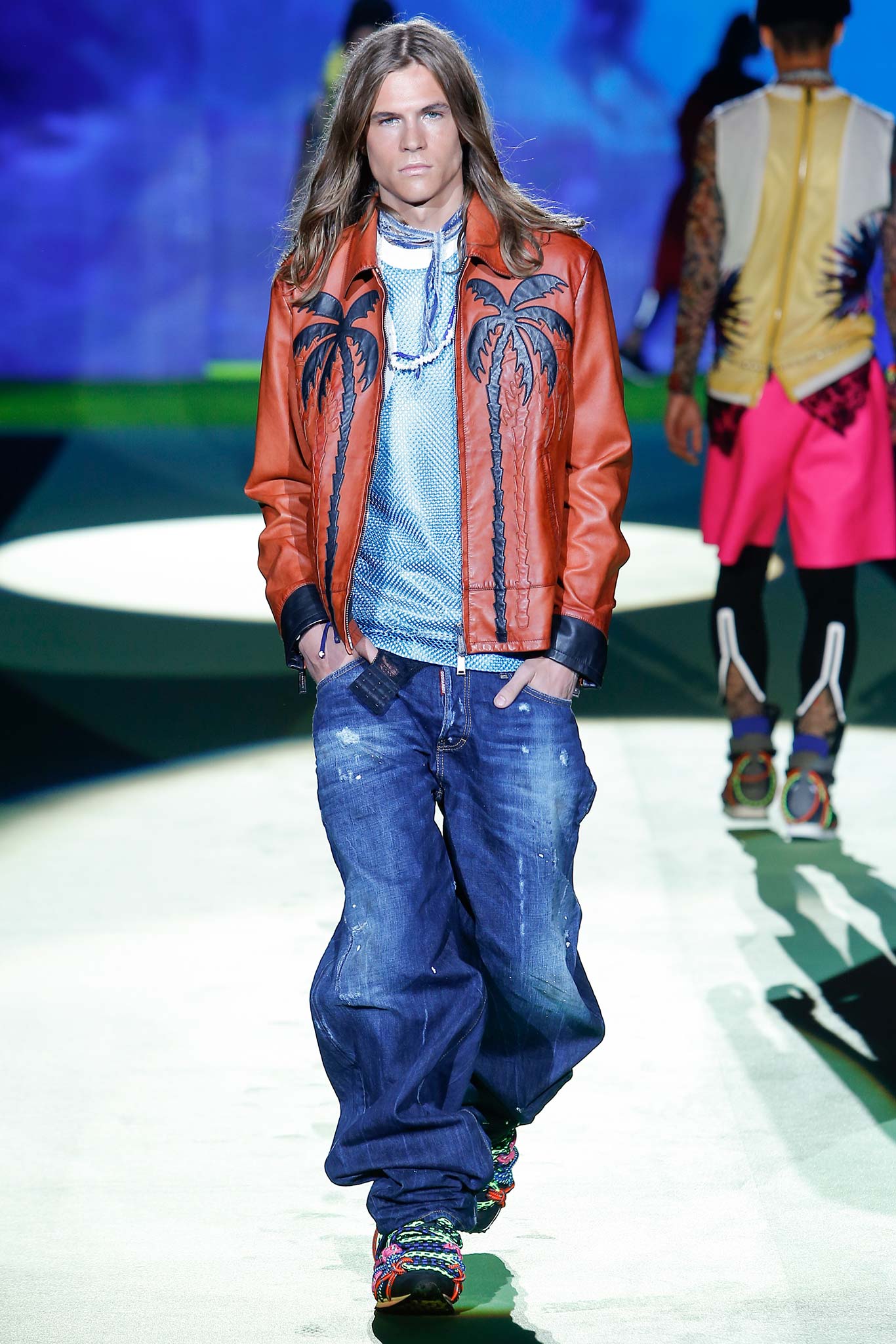 A tidal wave of styling went into Dsquared2’s surf-themed show, the pileups of rugged outerwear and neon-flecked or sparkly tank tops built up from tattoo-print bodysuits – and then stripped off for a racy, nearly nude finale.