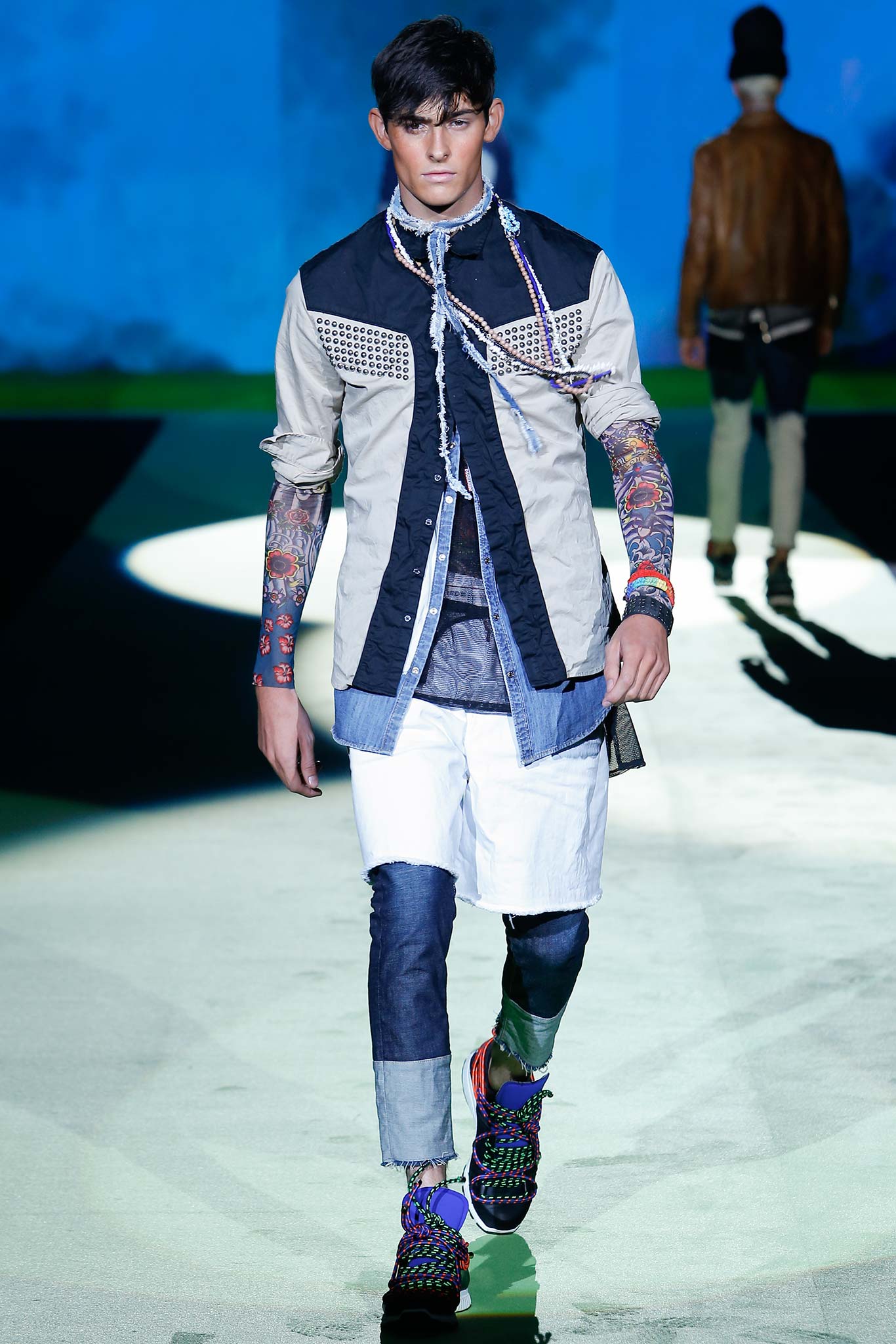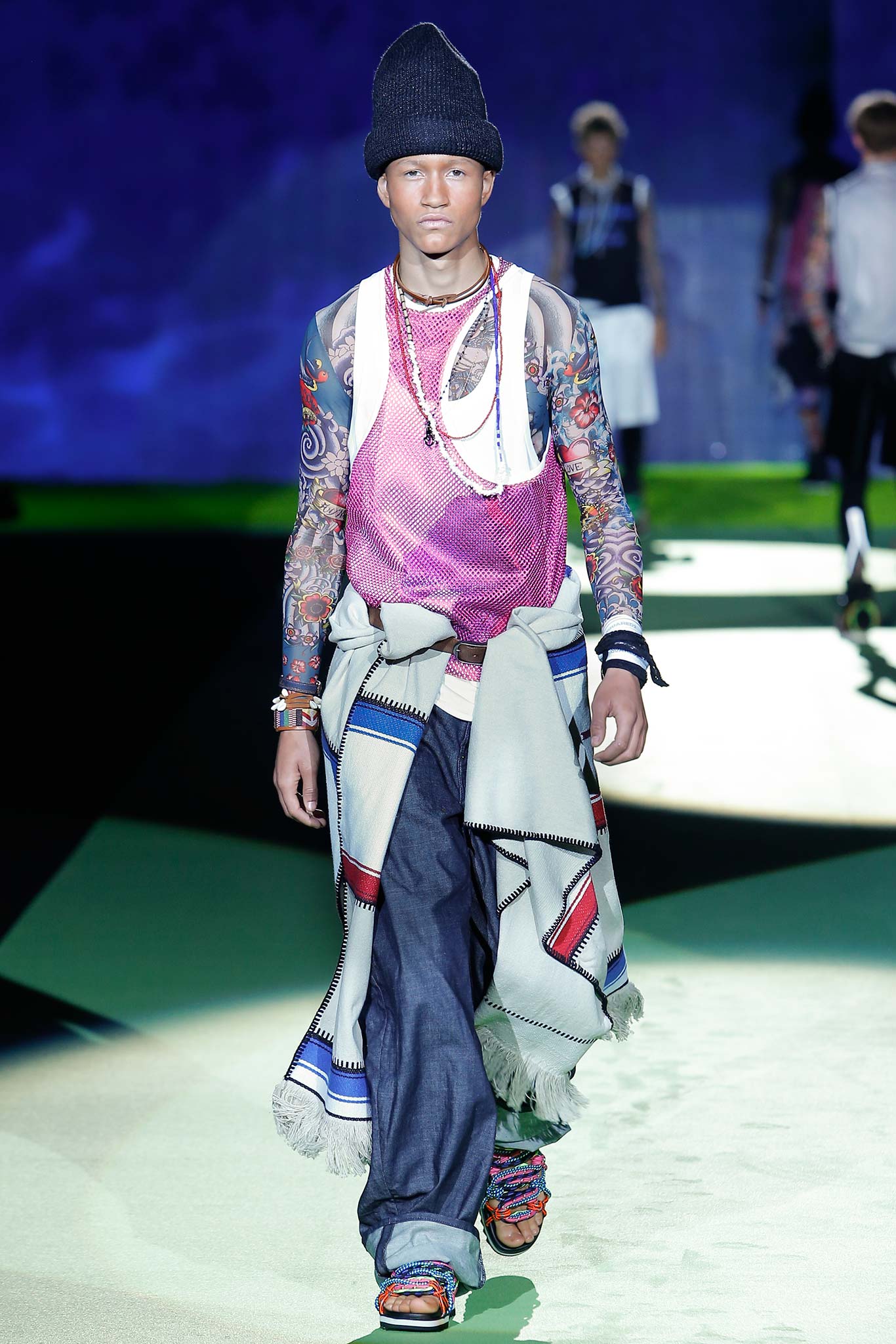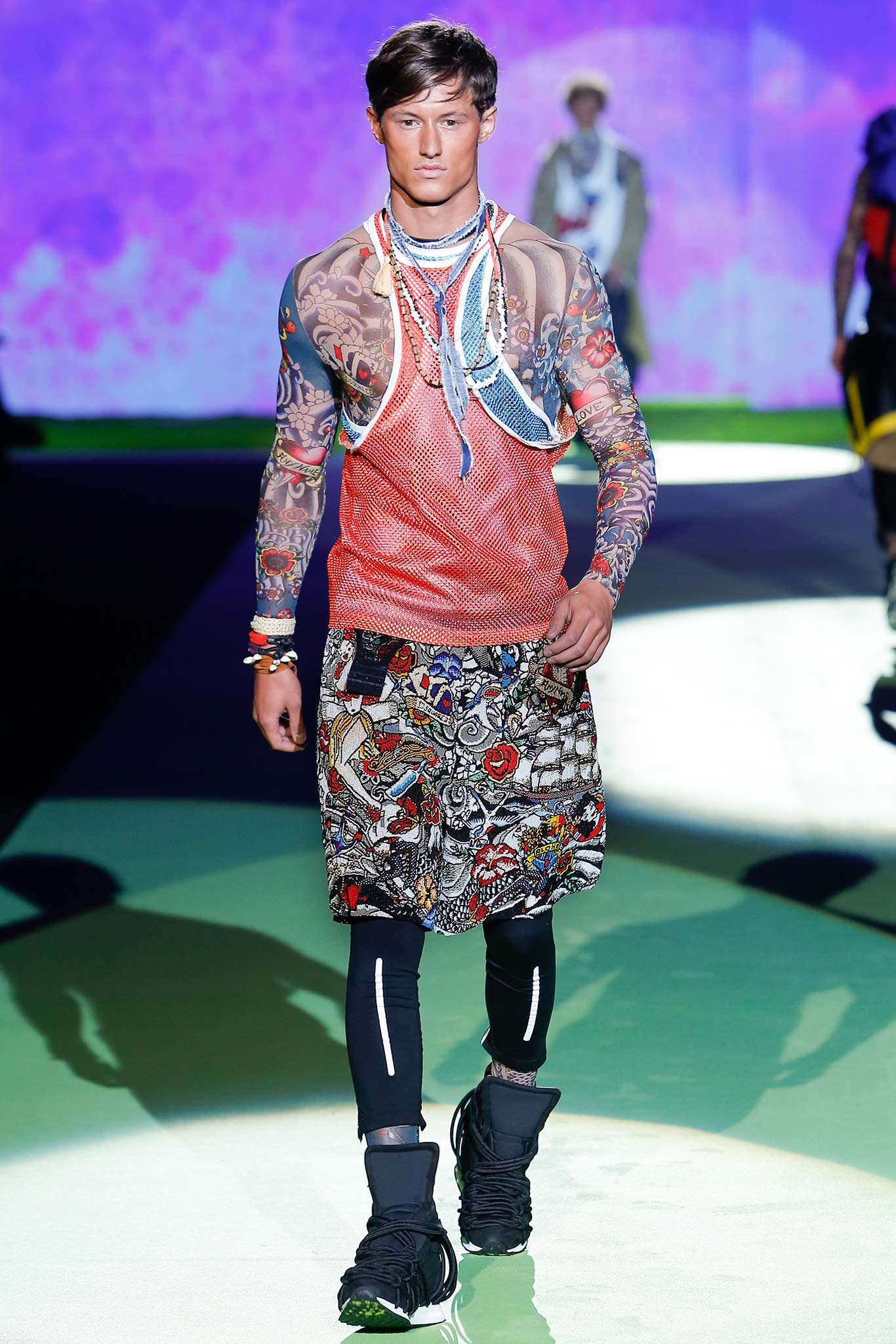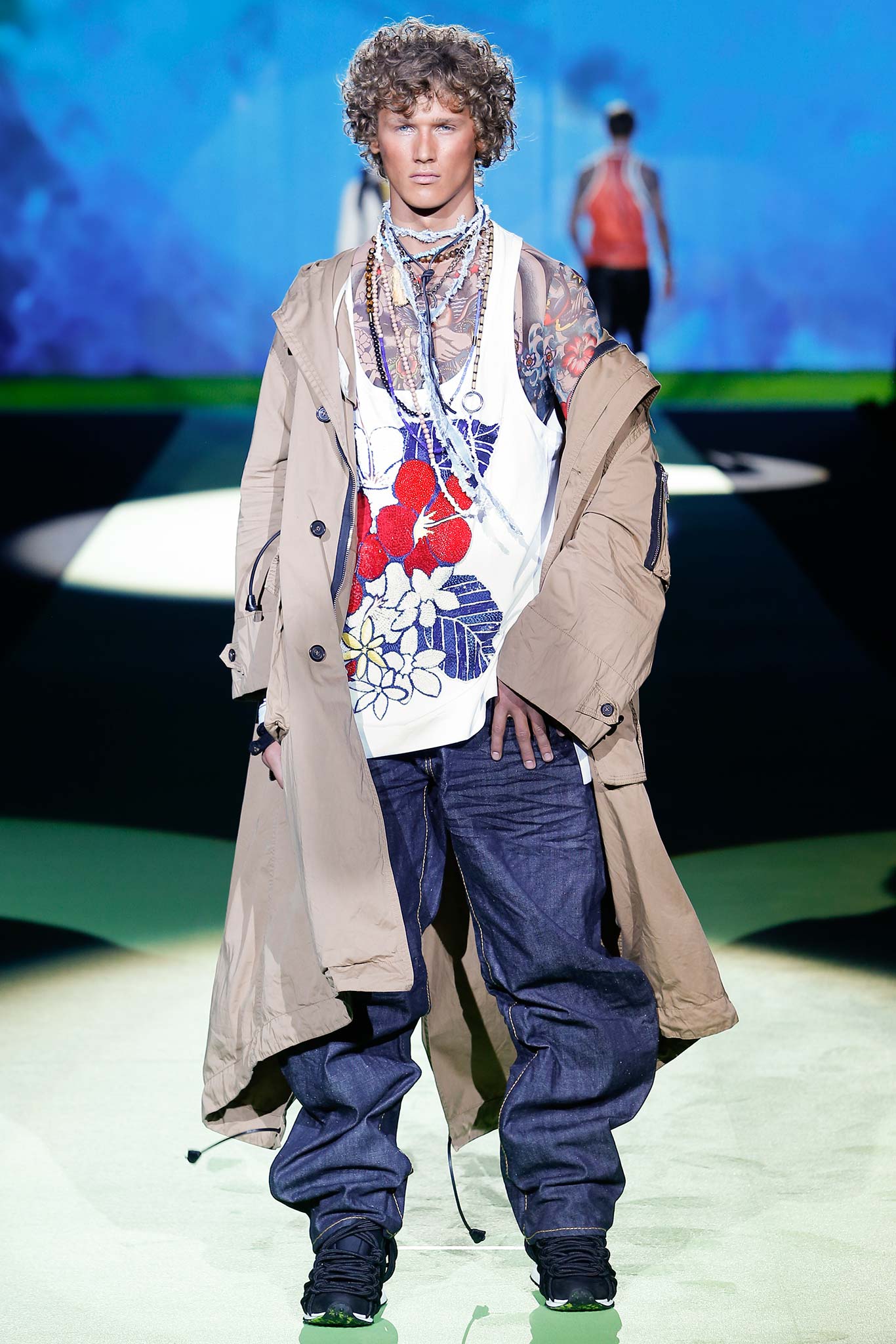 A tidal wave of styling went into Dsquared2’s surf-themed show, the pileups of rugged outerwear and neon-flecked or sparkly tank tops built up from tattoo-print bodysuits – and then stripped off for a racy, nearly nude finale.