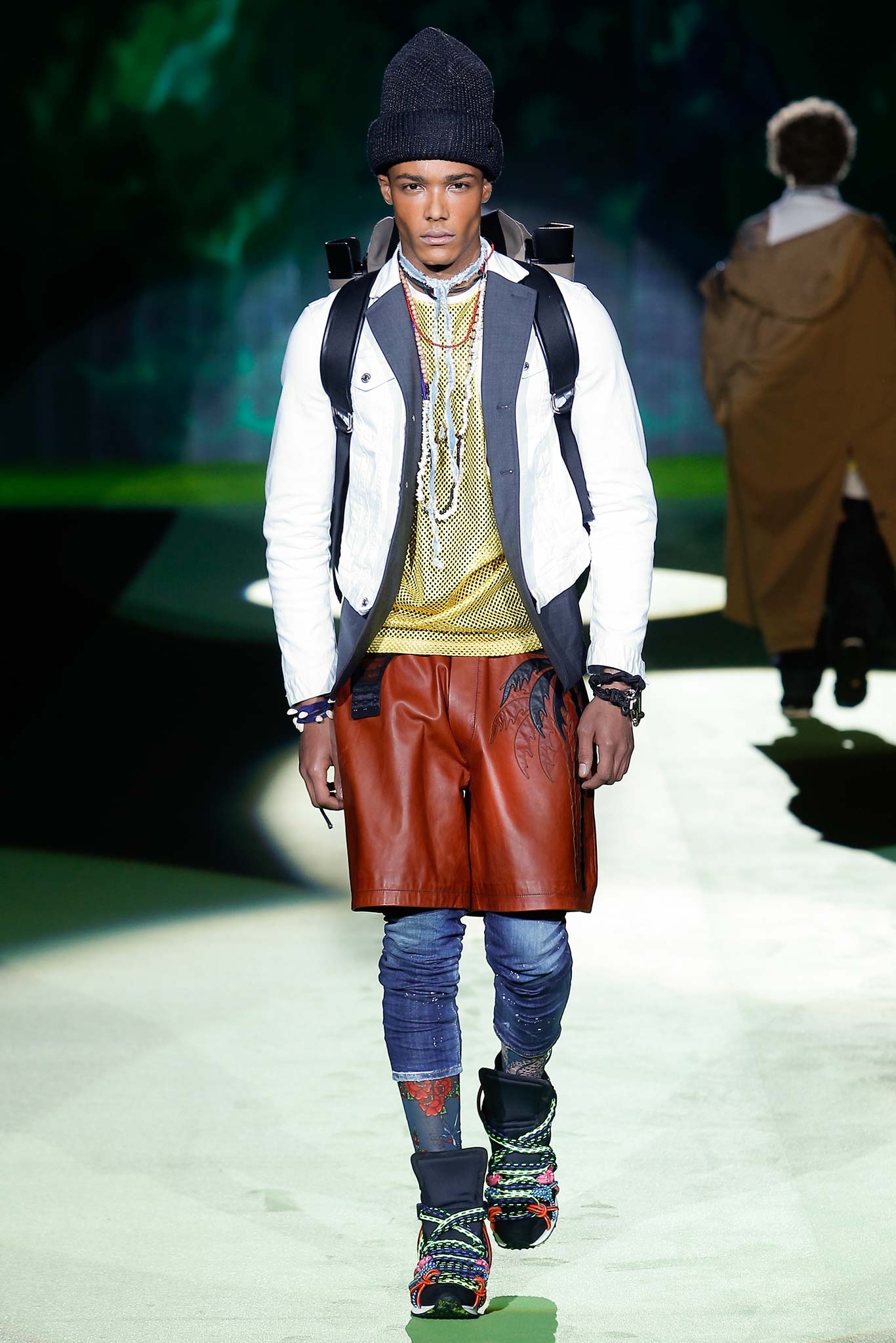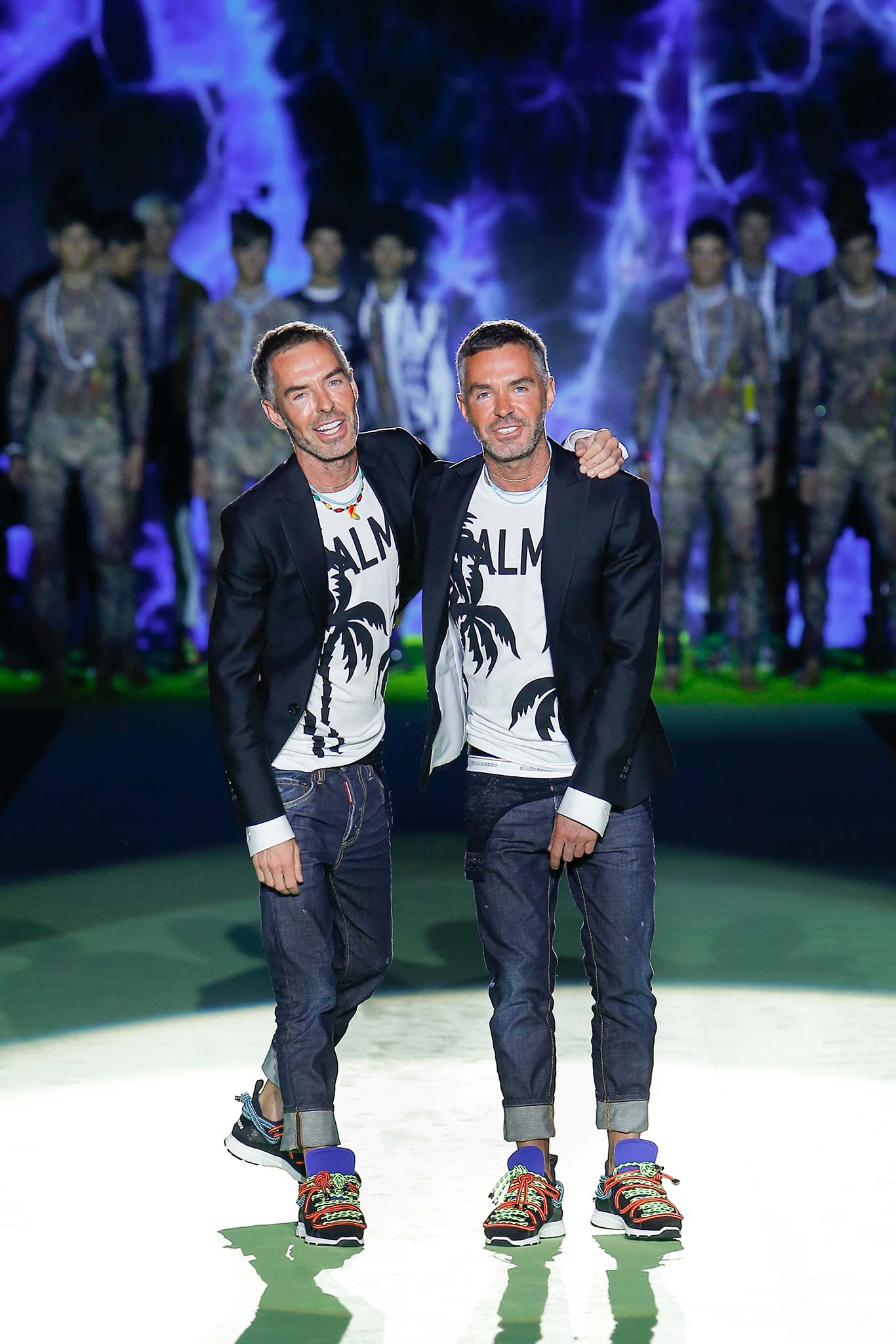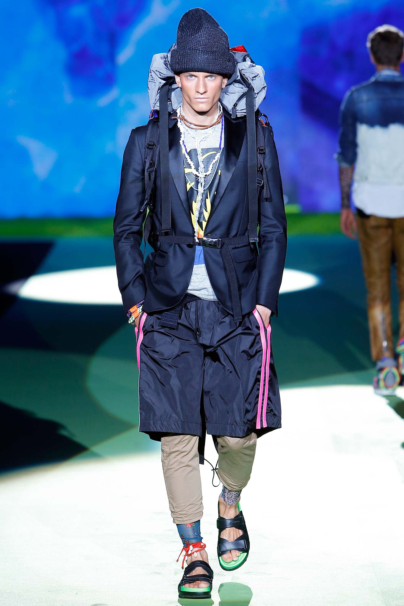 It was hard to tell if Dean and Dan Caten’s beach boys – lugging giant backpacks and shod in bulky, cord-festooned wakeboard sneakers – were going trekking or raving. But does it really matter?