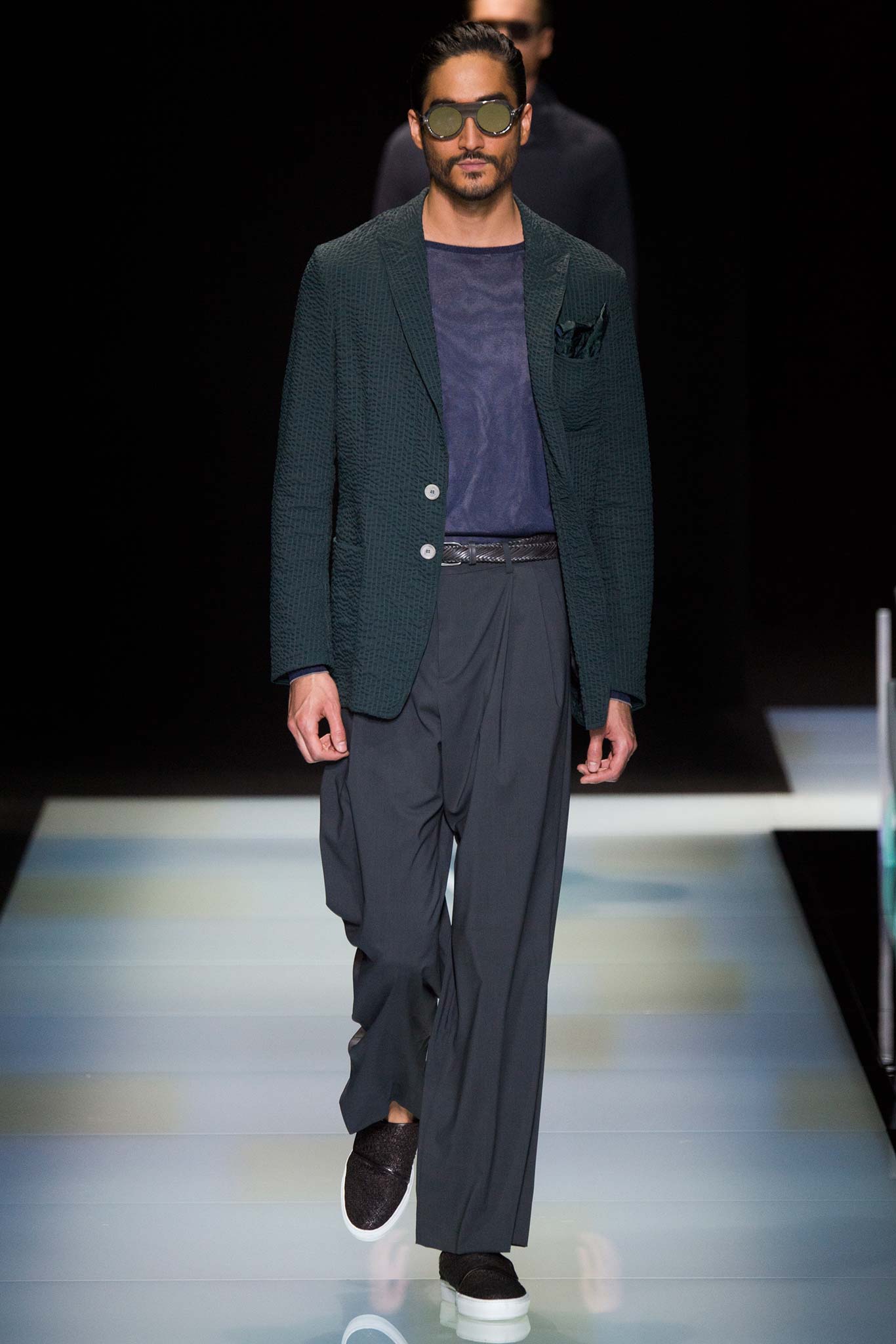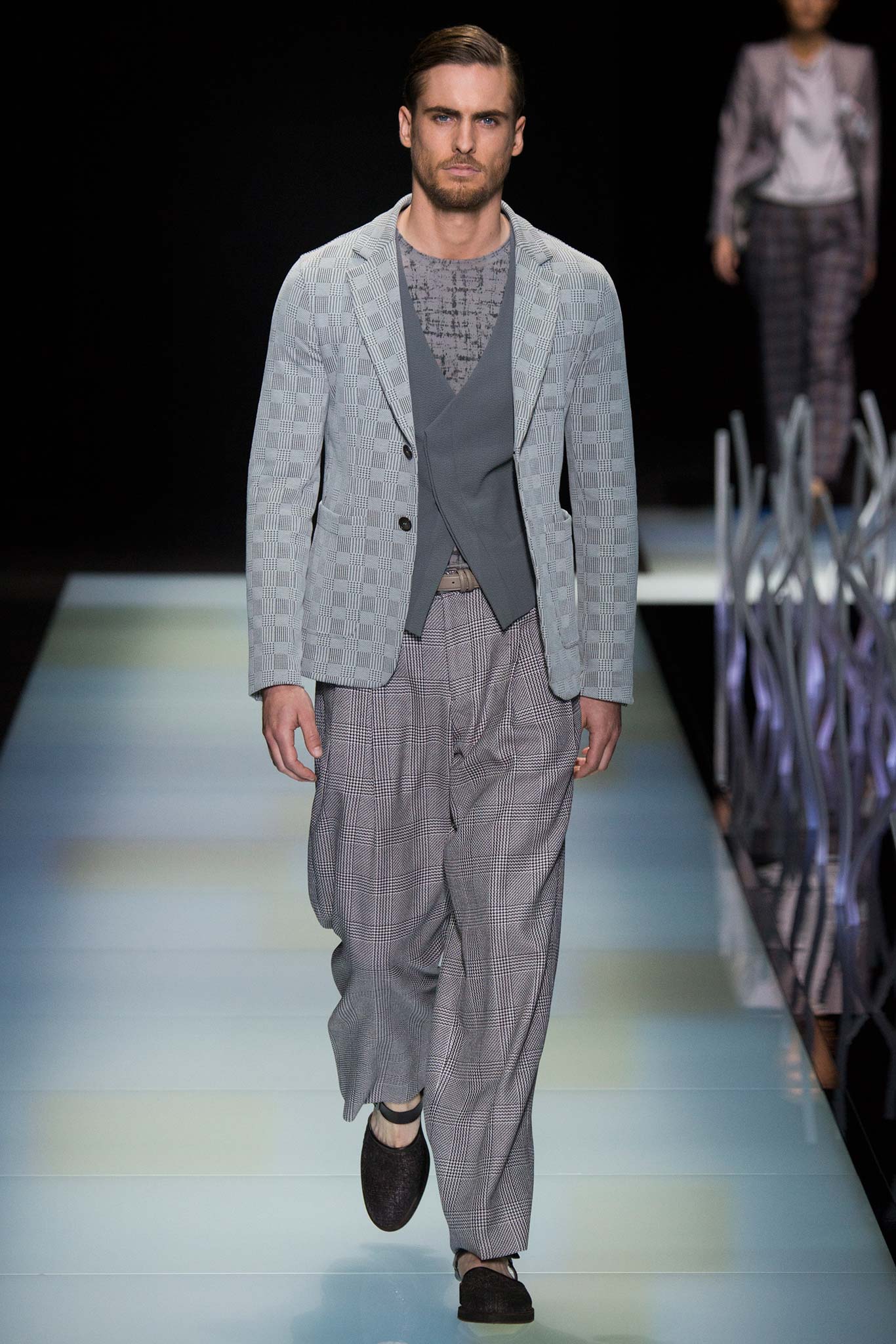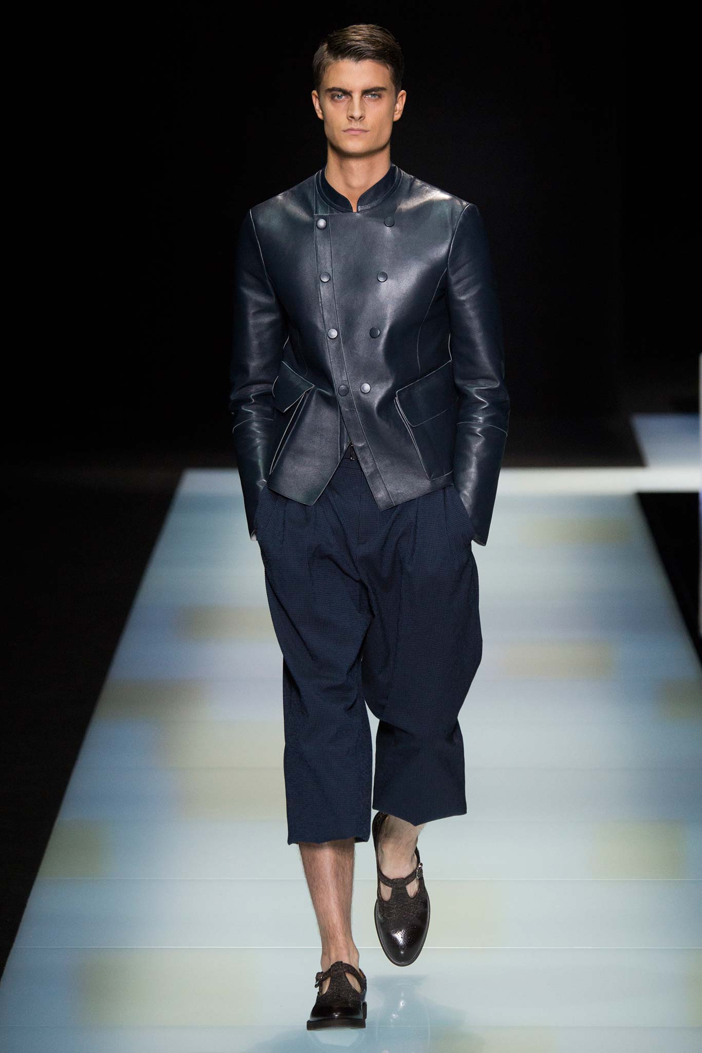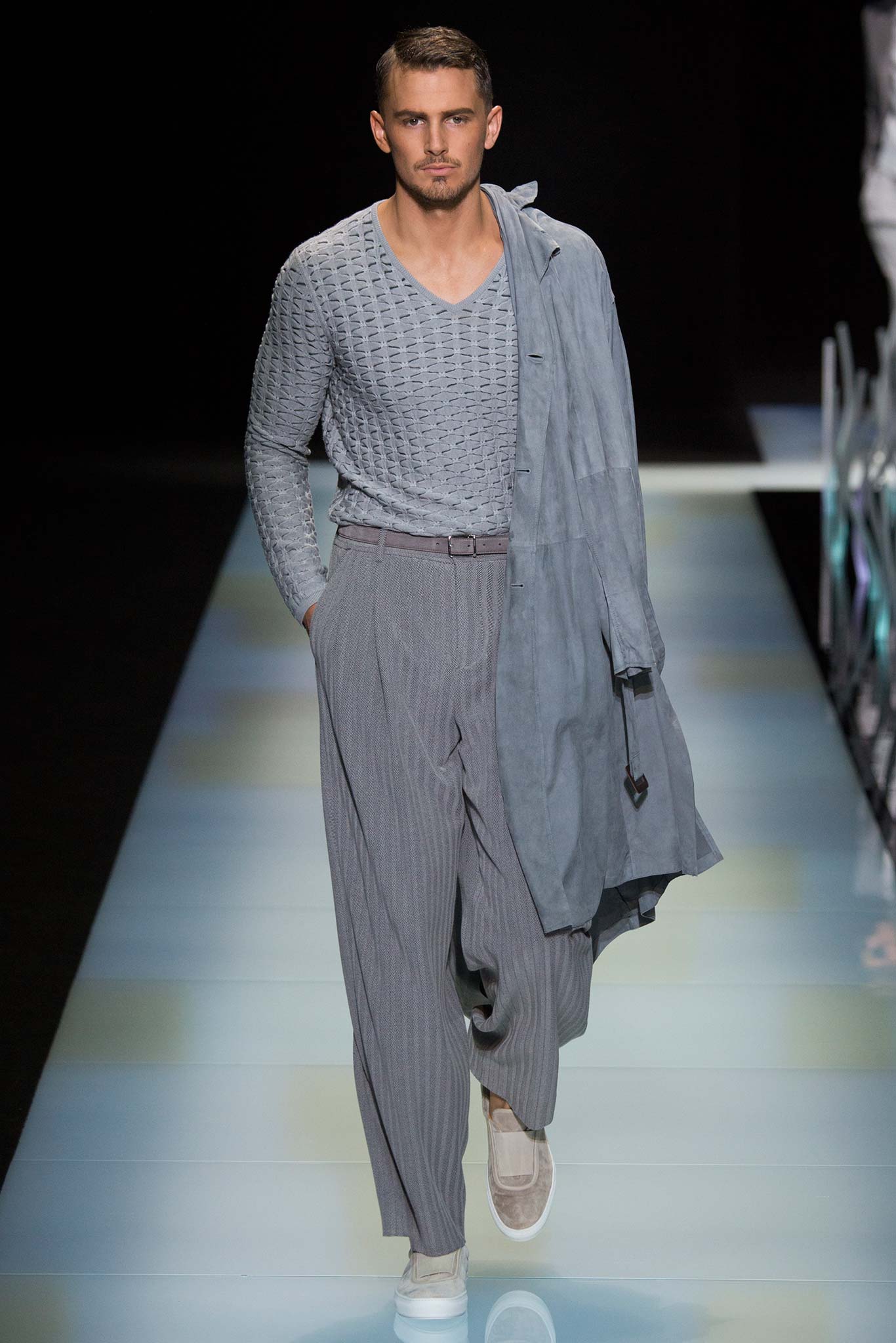 “This is male lightness,” Armani said. “There was less of everything; we don’t need that much, little but well-chosen. Materials are much less synthetic, cotton mixed with silk.” Even his leathers were light and low-key as in a slim, dusty blue double-breasted jacket, or bomber style with a subtle argyle pattern picked across it.