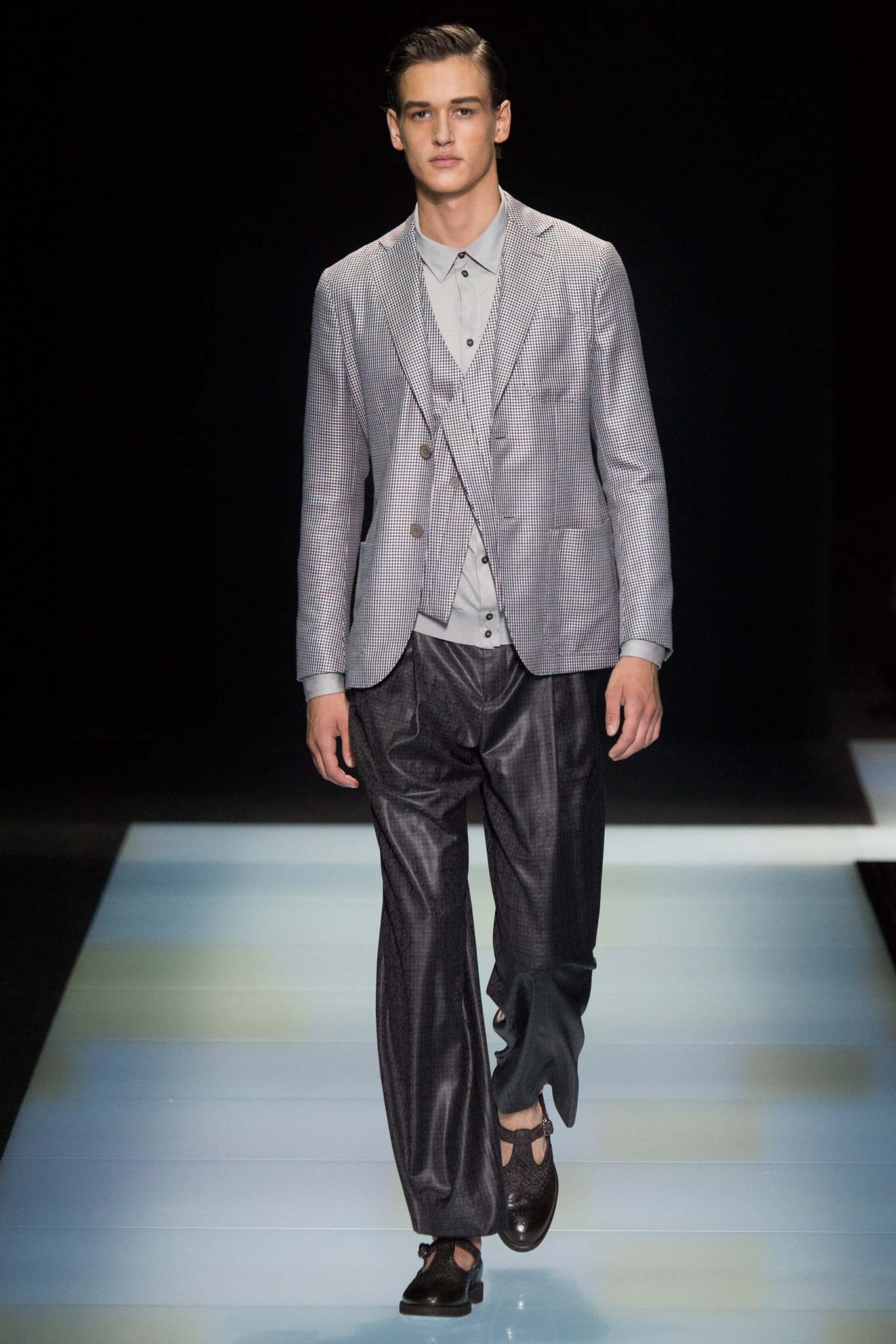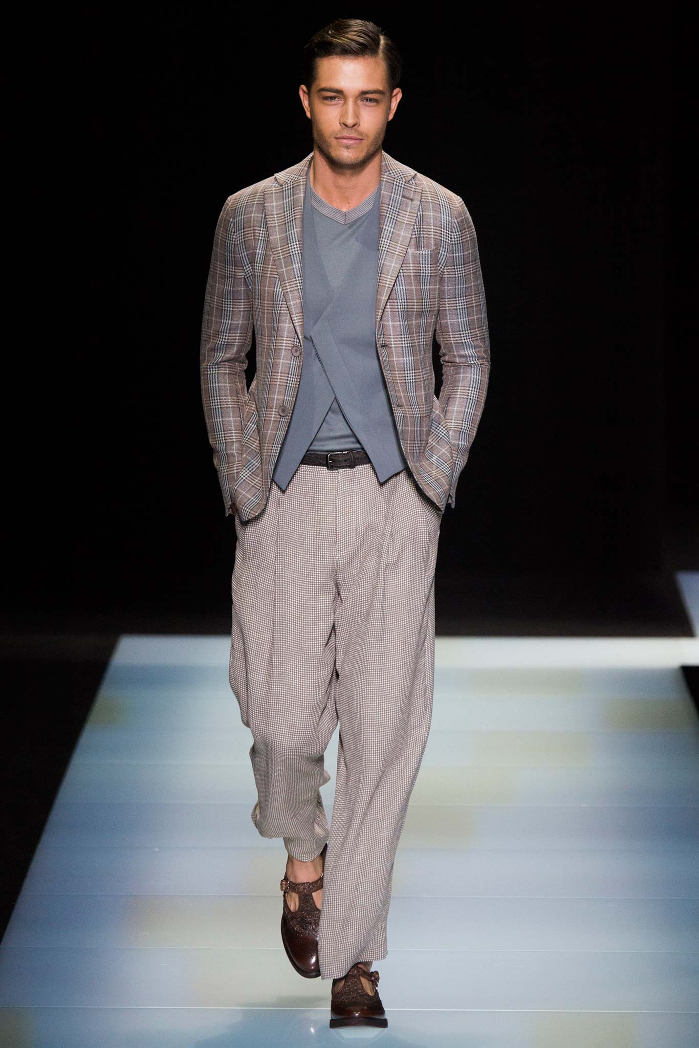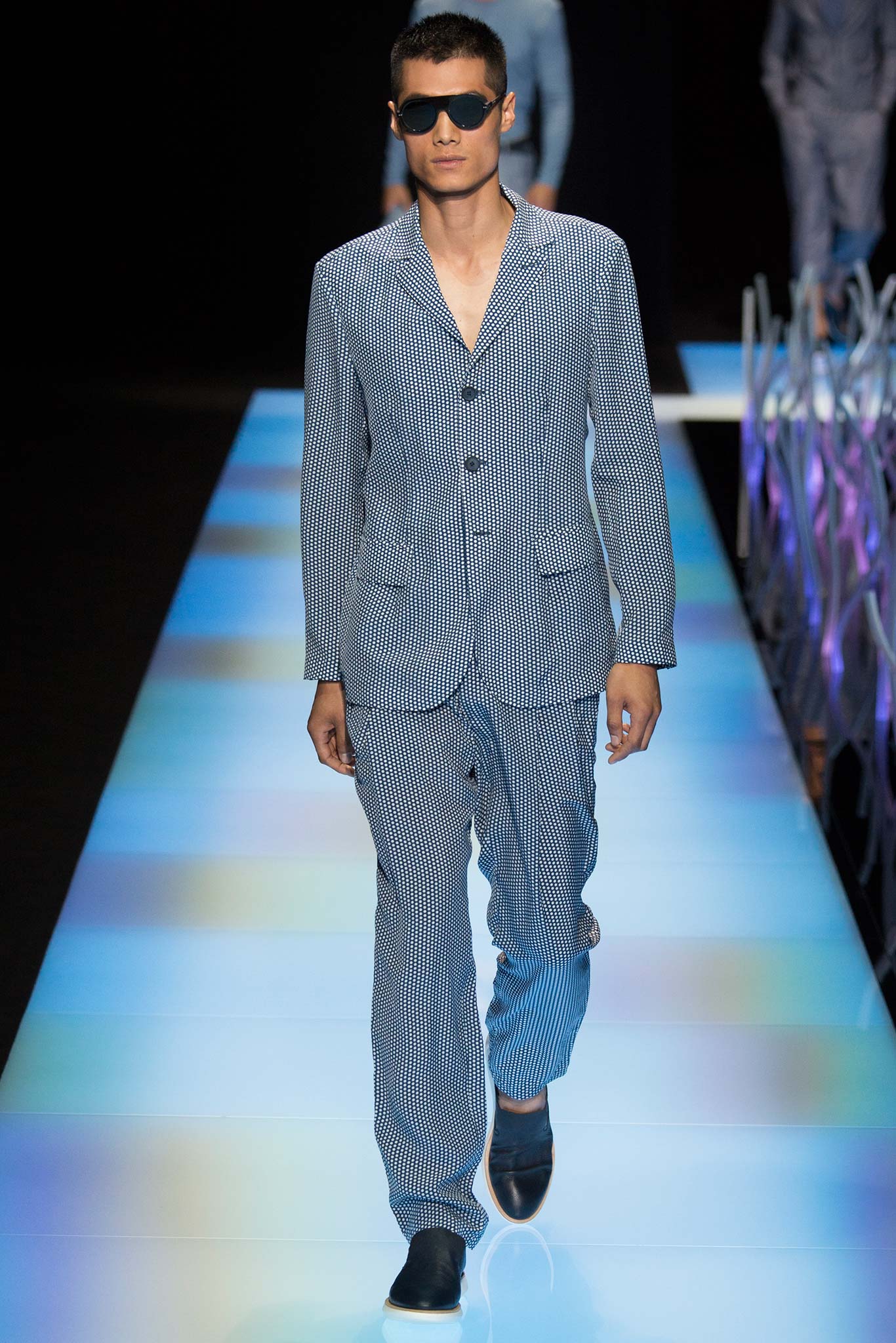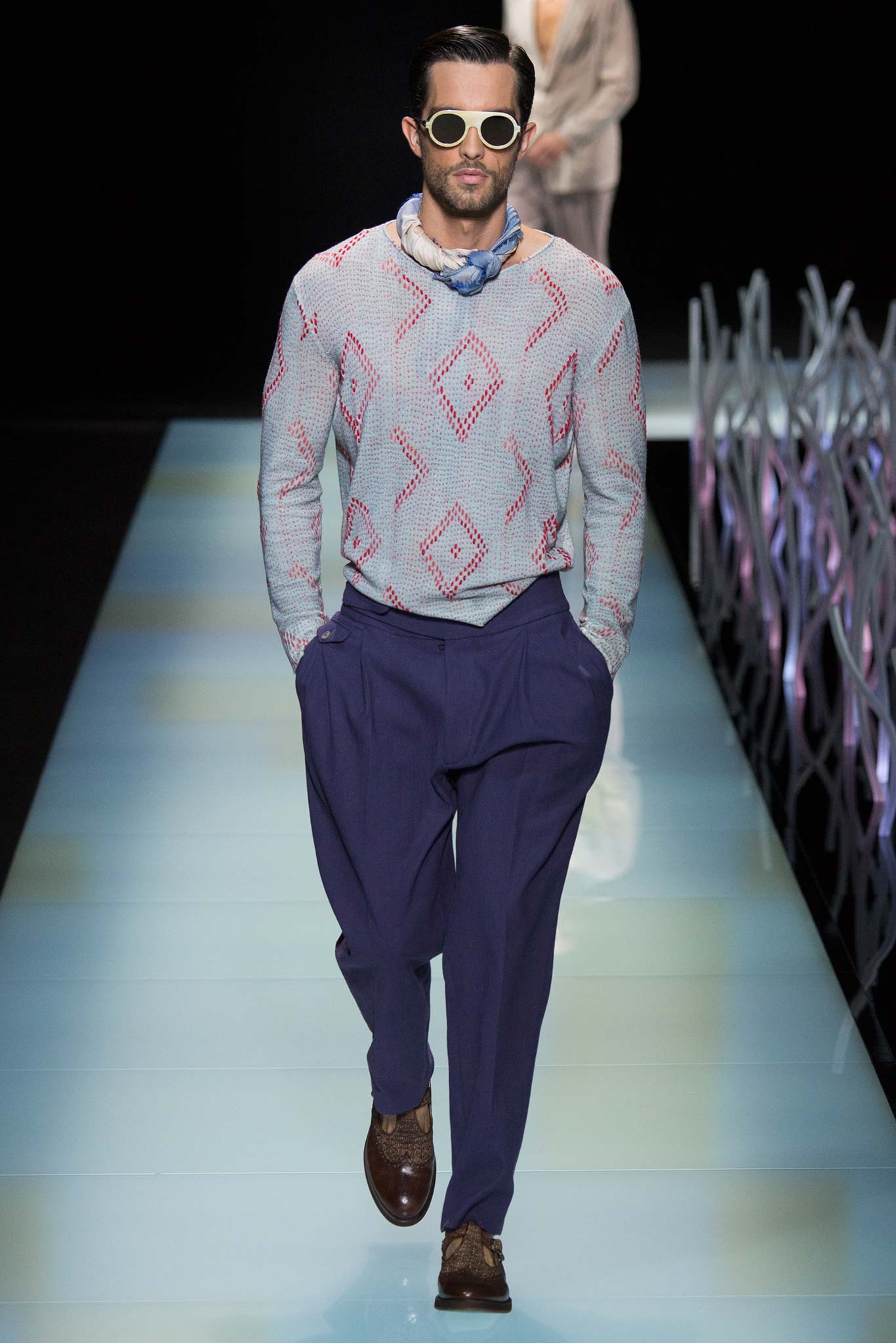 “This is male lightness,” Armani said. “There was less of everything; we don’t need that much, little but well-chosen. Materials are much less synthetic, cotton mixed with silk.” Even his leathers were light and low-key as in a slim, dusty blue double-breasted jacket, or bomber style with a subtle argyle pattern picked across it.