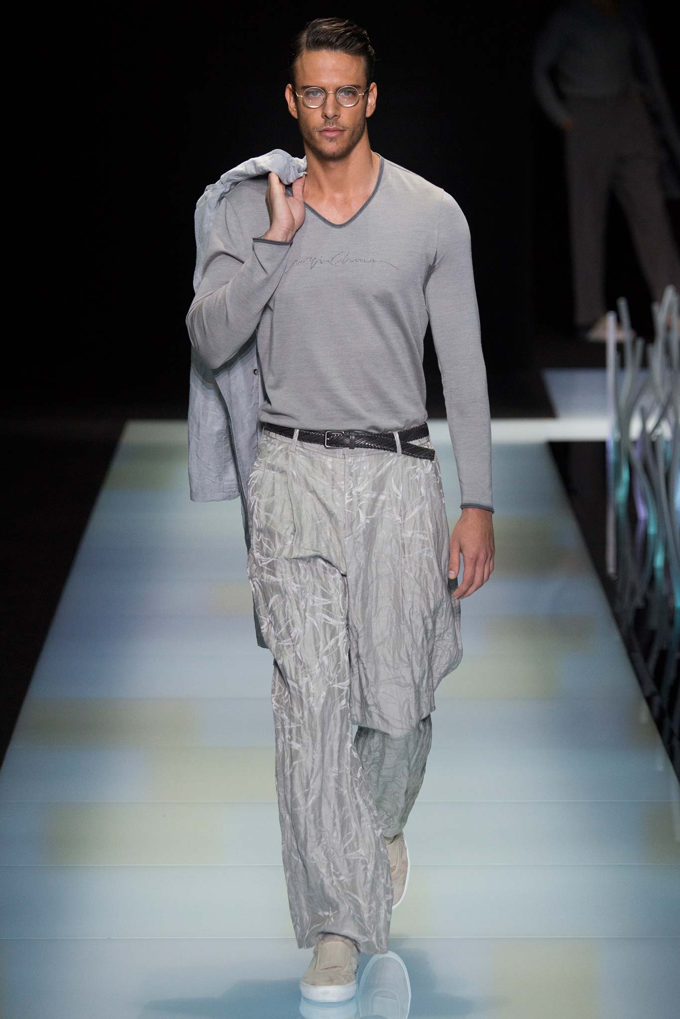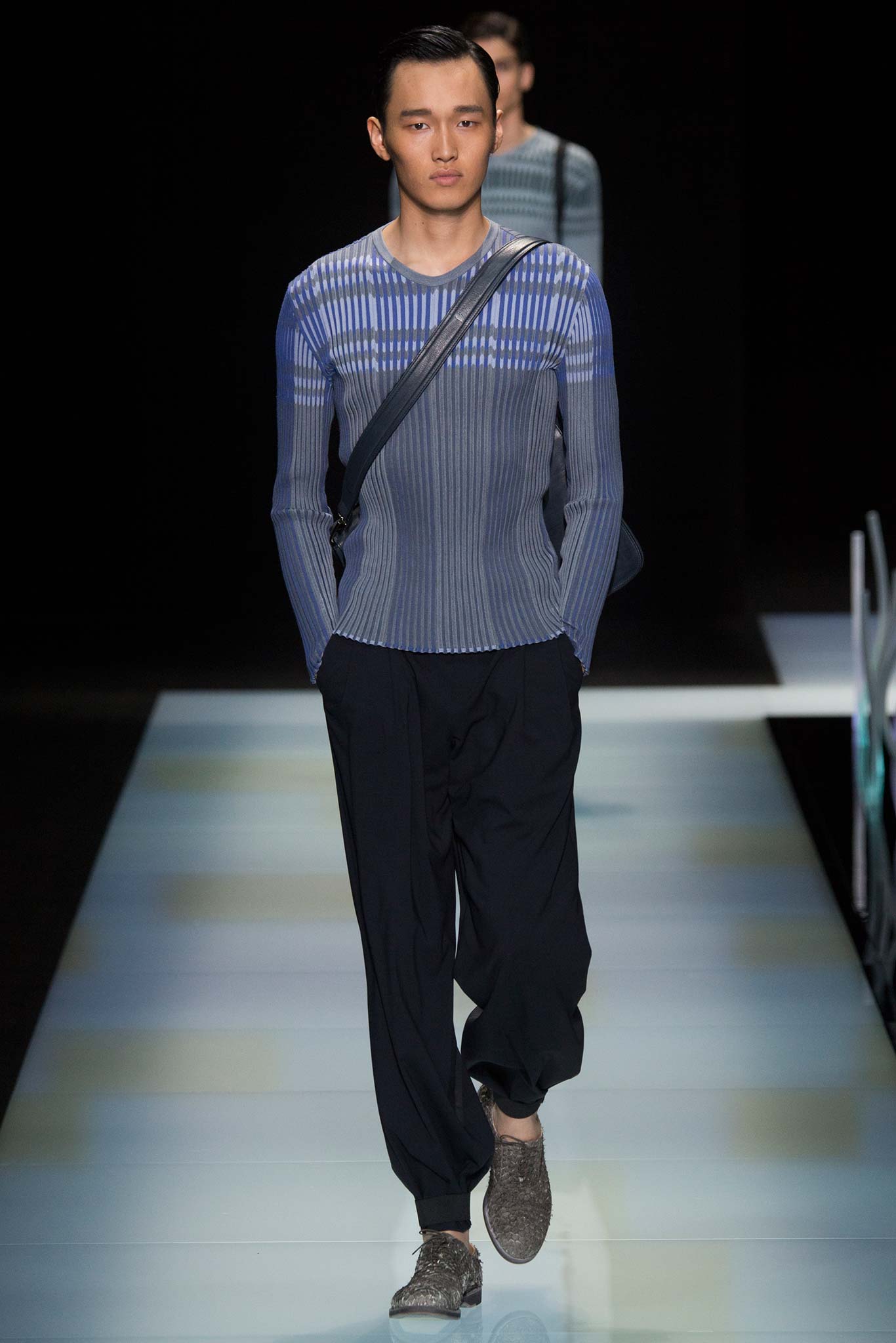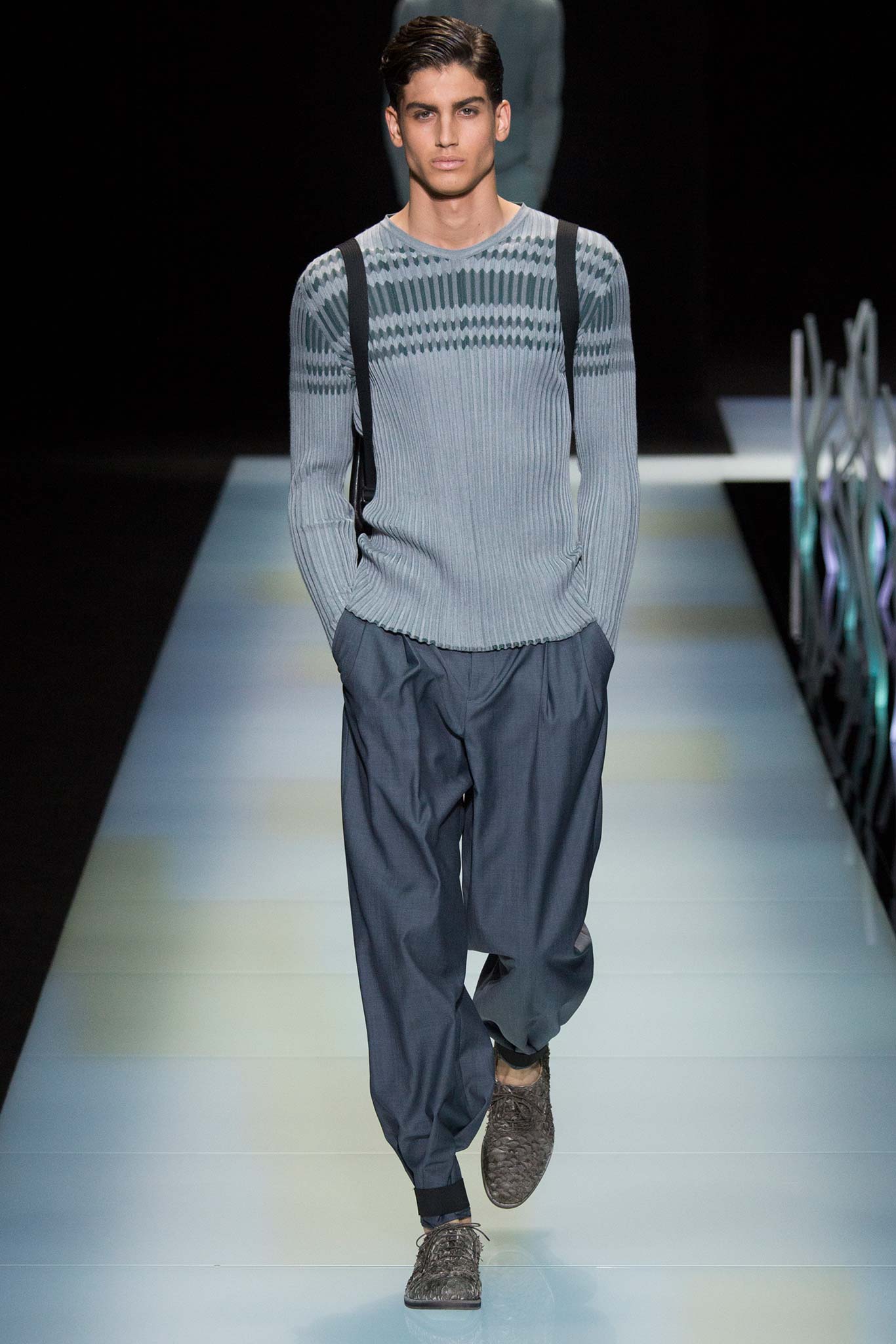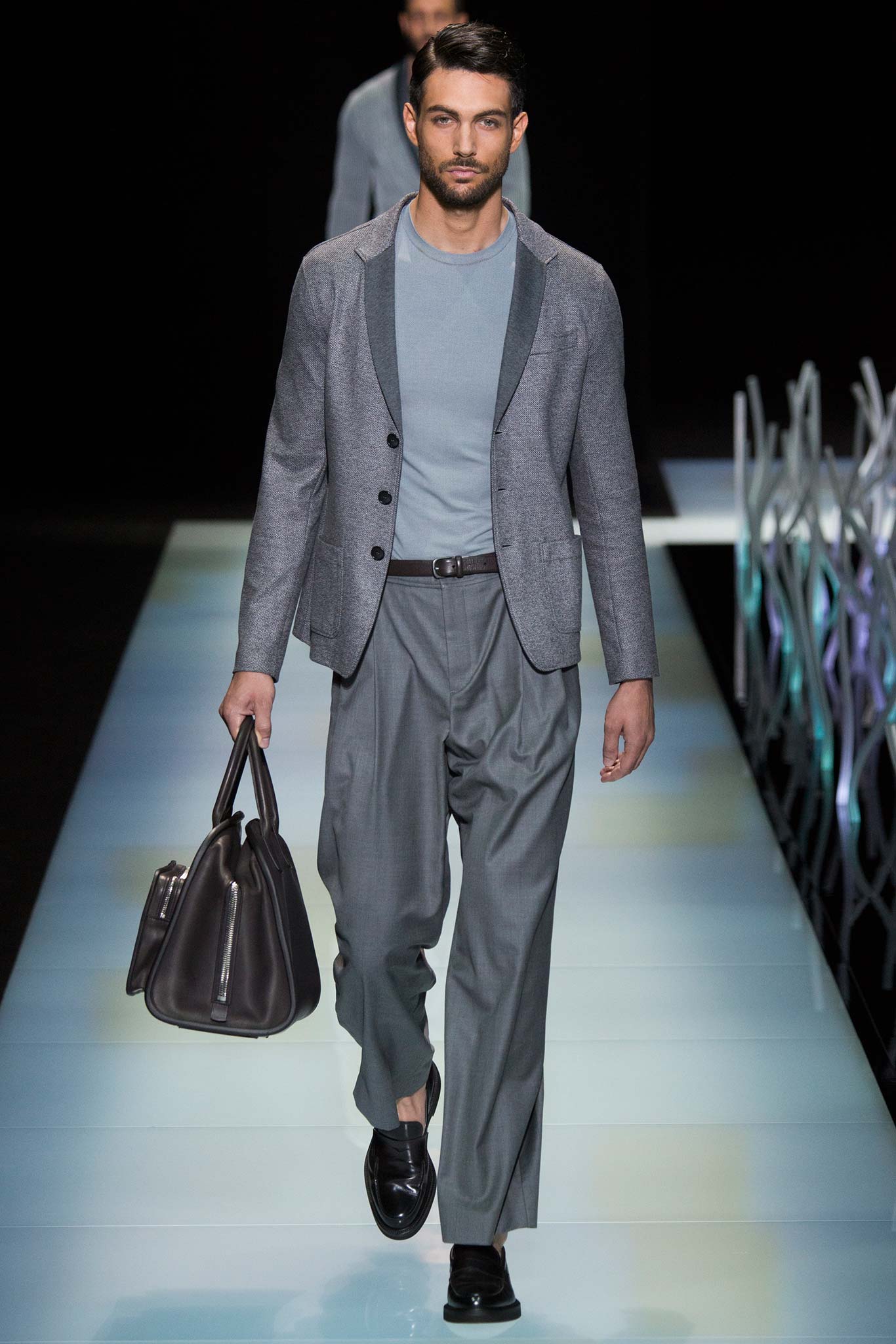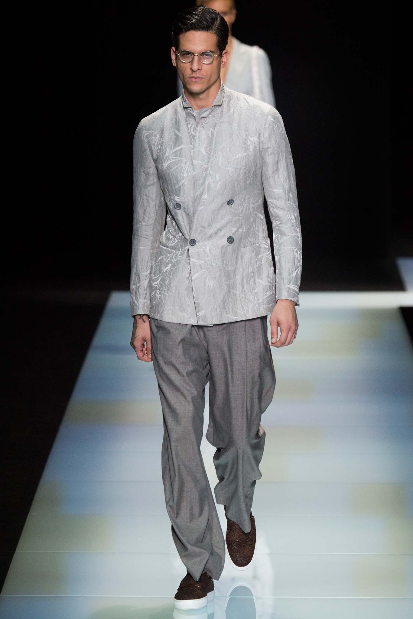 “This is male lightness,” Armani said. “There was less of everything; we don’t need that much, little but well-chosen. Materials are much less synthetic, cotton mixed with silk.” Even his leathers were light and low-key as in a slim, dusty blue double-breasted jacket, or bomber style with a subtle argyle pattern picked across it.