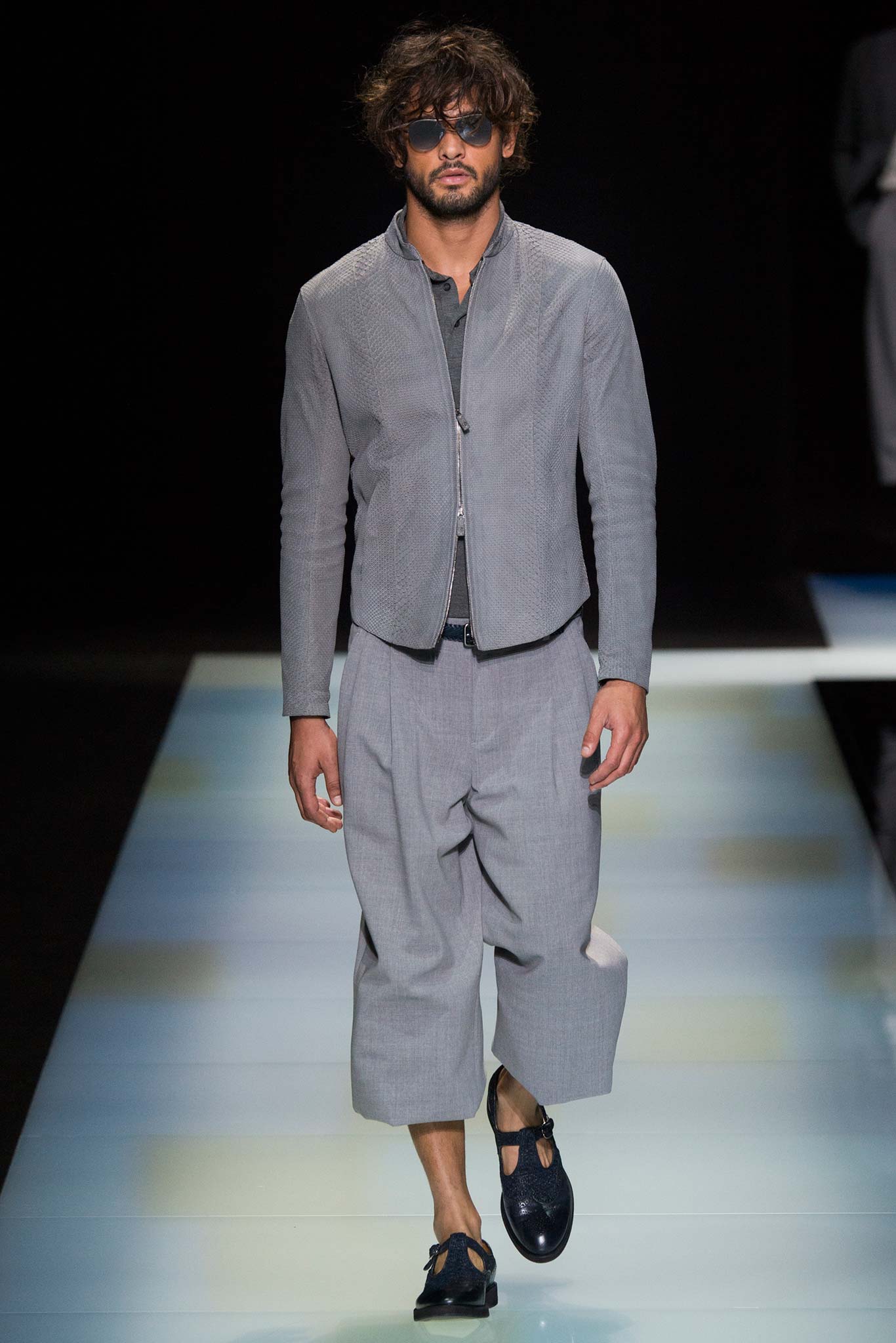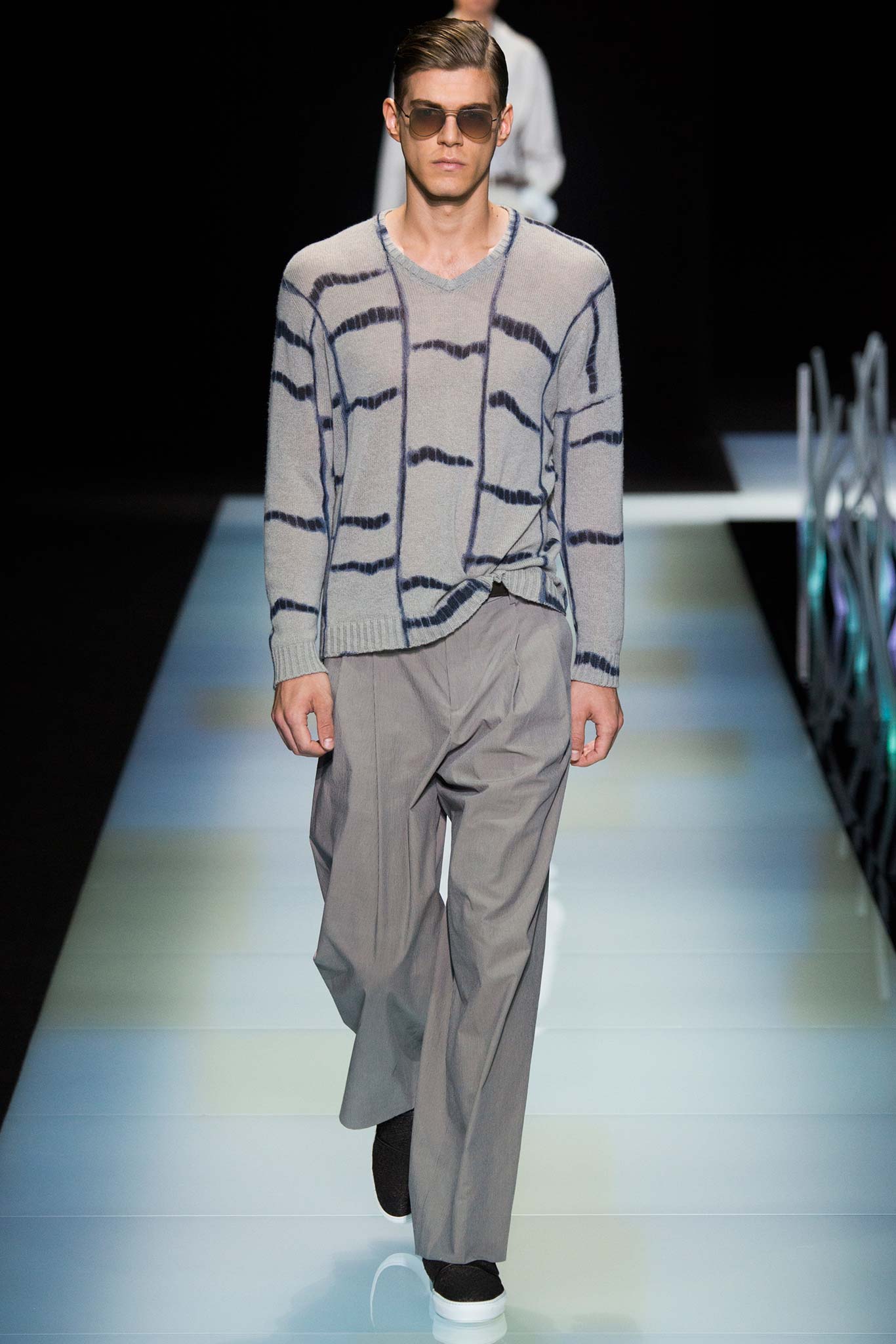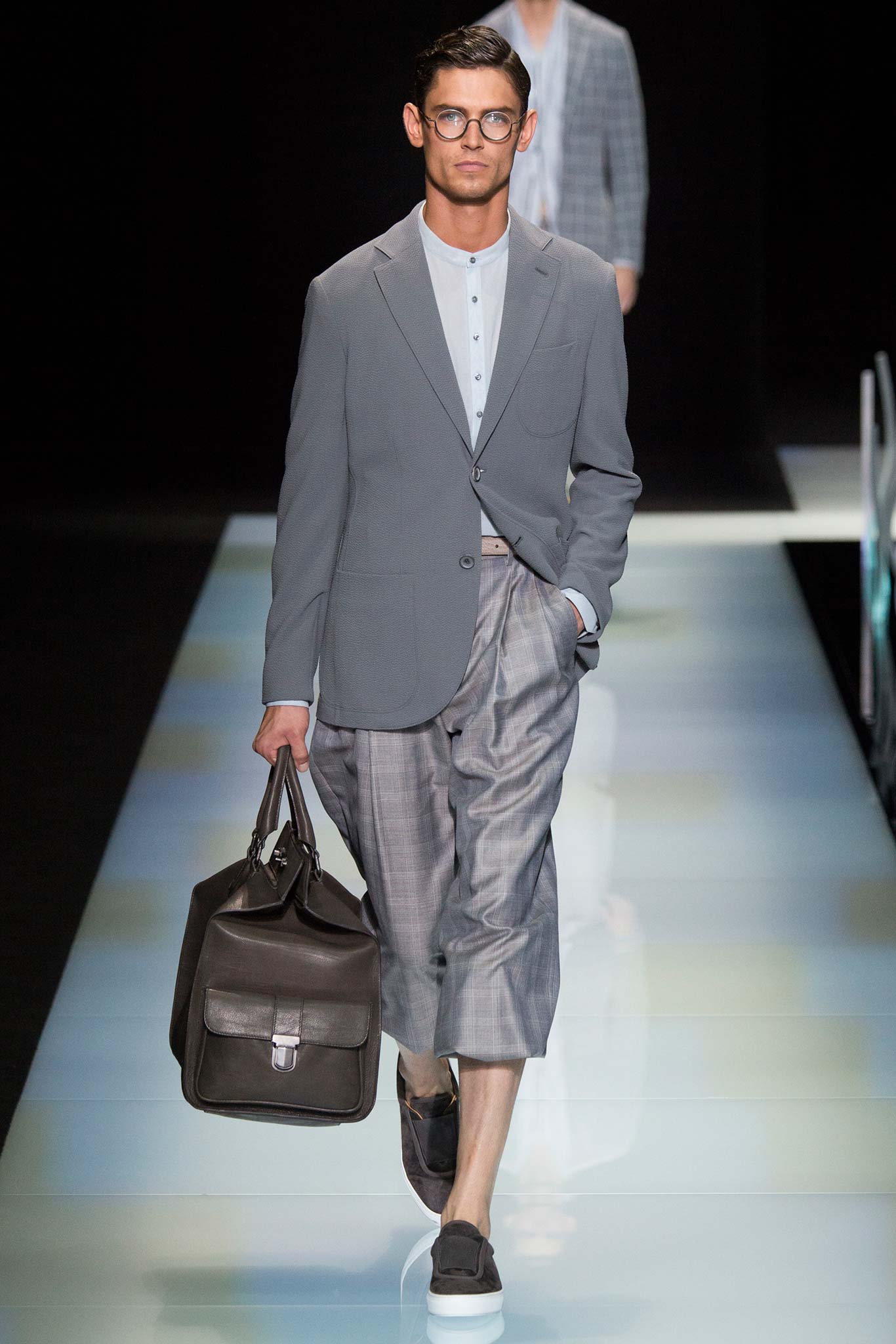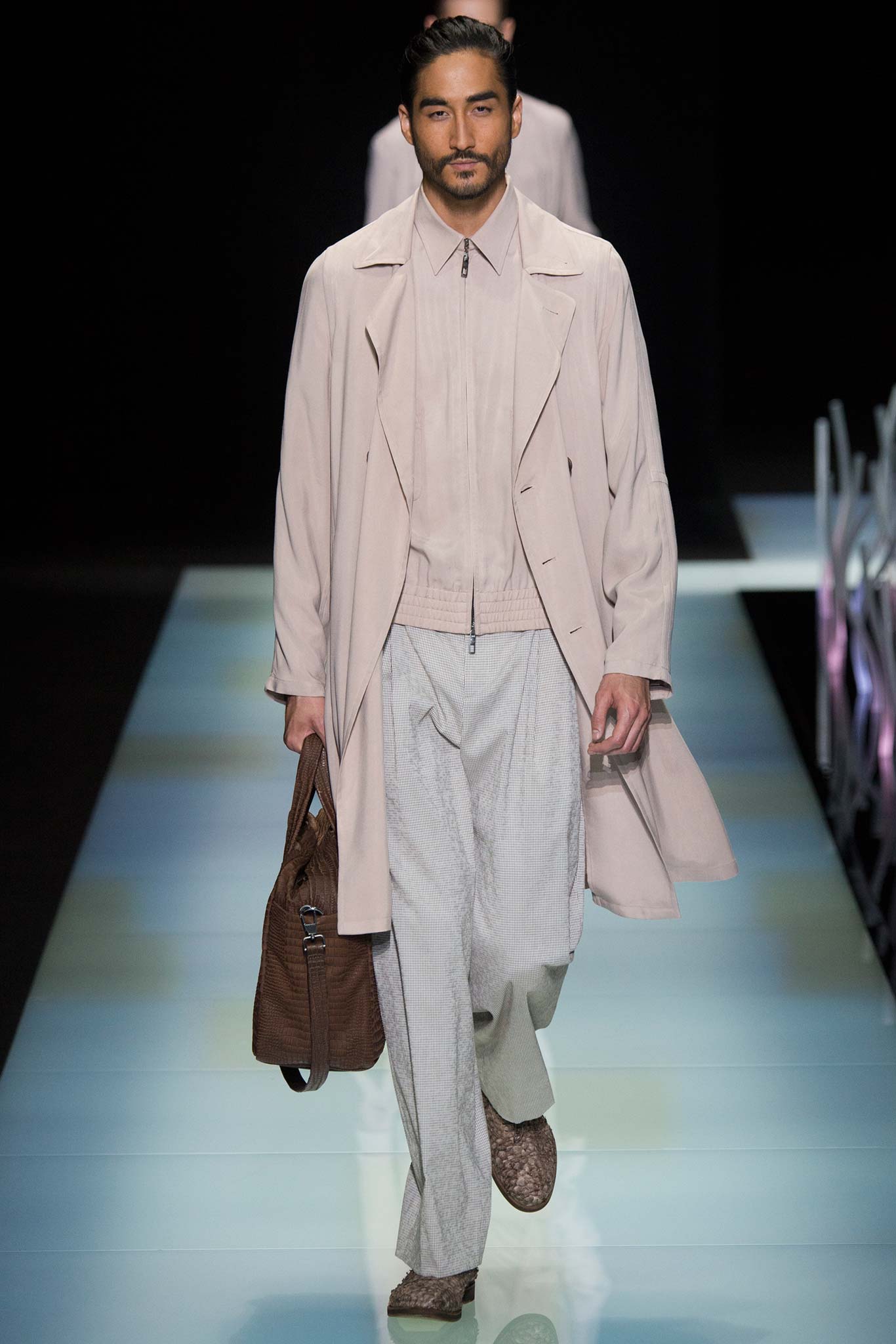 “This is male lightness,” Armani said. “There was less of everything; we don’t need that much, little but well-chosen. Materials are much less synthetic, cotton mixed with silk.” Even his leathers were light and low-key as in a slim, dusty blue double-breasted jacket, or bomber style with a subtle argyle pattern picked across it.