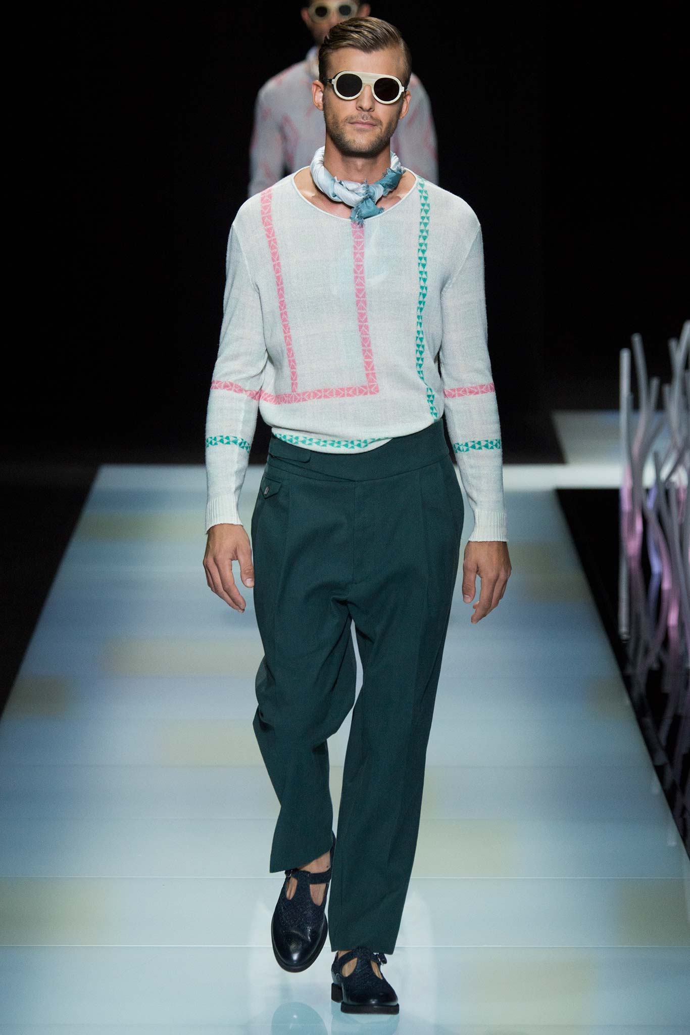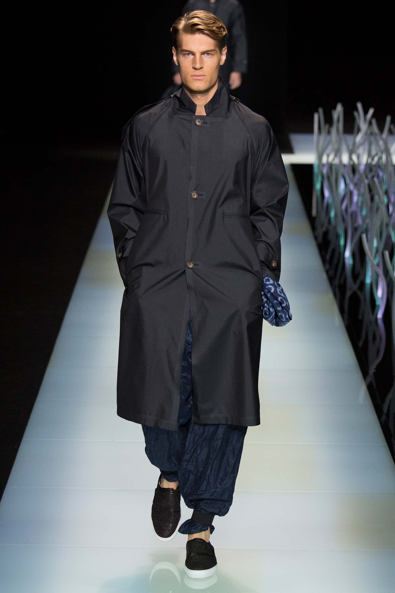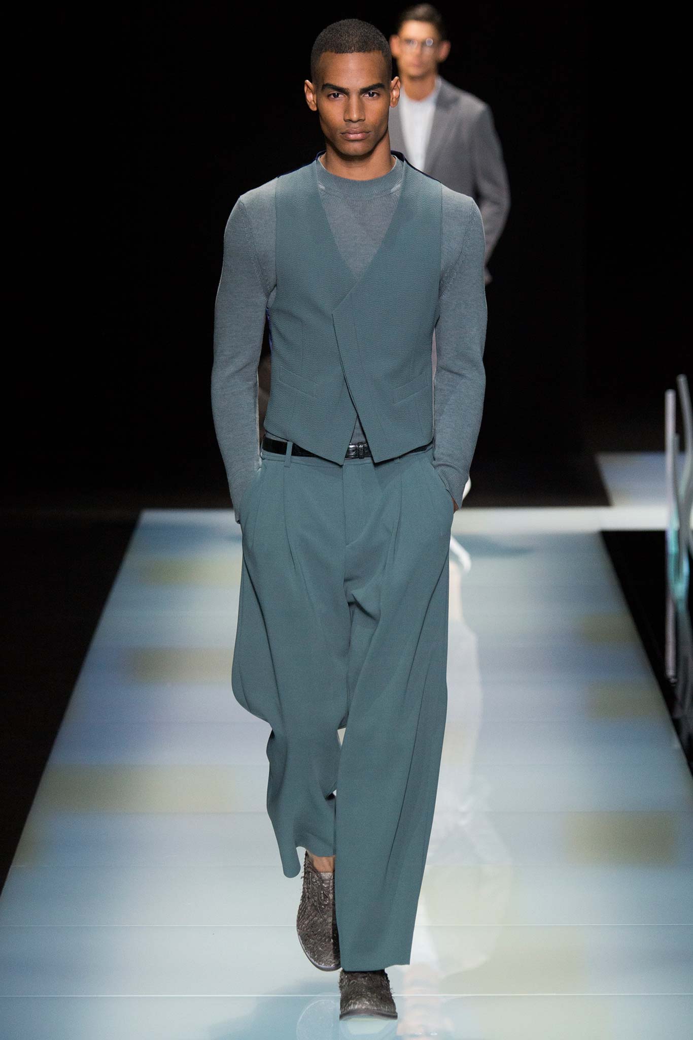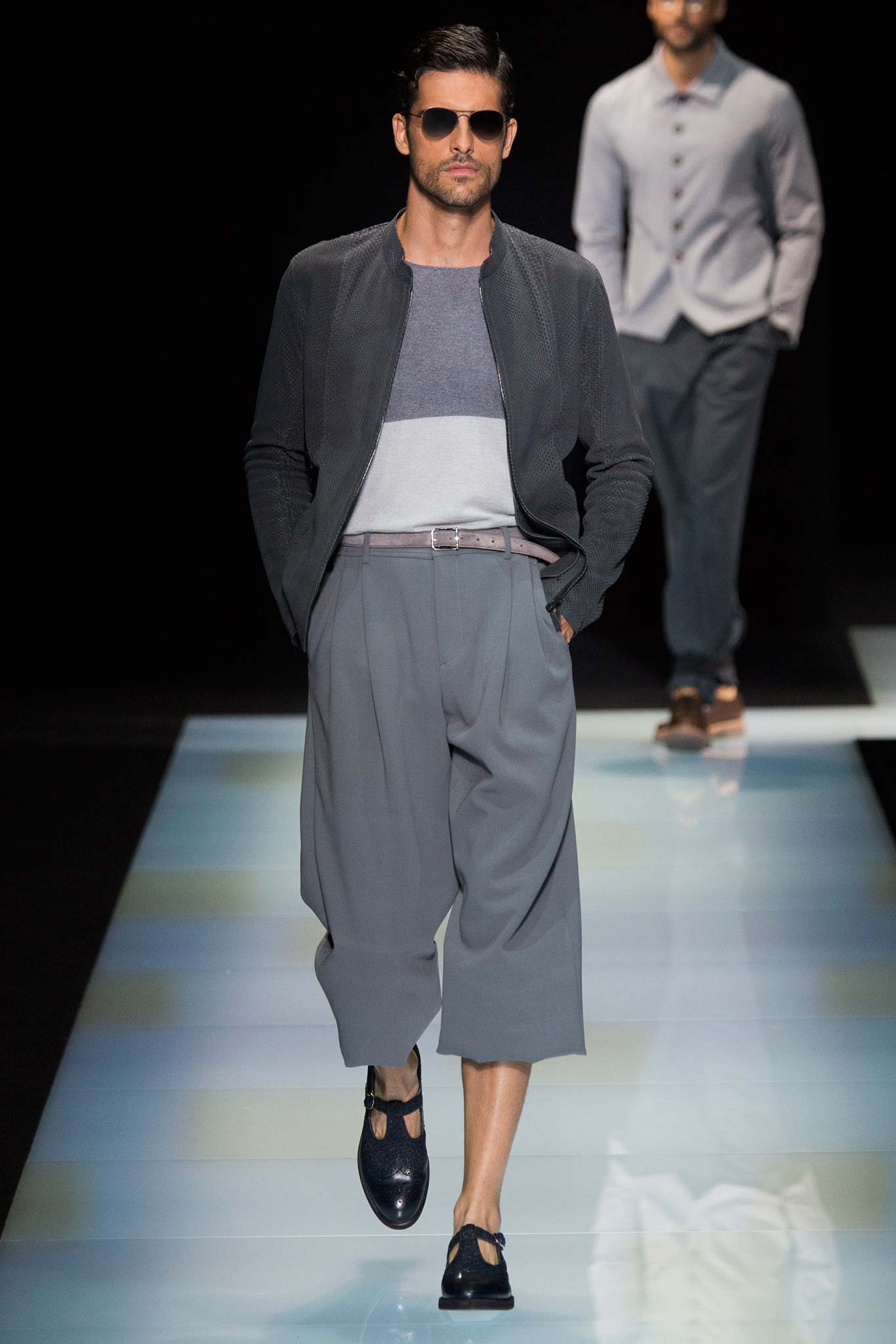 “This is male lightness,” Armani said. “There was less of everything; we don’t need that much, little but well-chosen. Materials are much less synthetic, cotton mixed with silk.” Even his leathers were light and low-key as in a slim, dusty blue double-breasted jacket, or bomber style with a subtle argyle pattern picked across it.