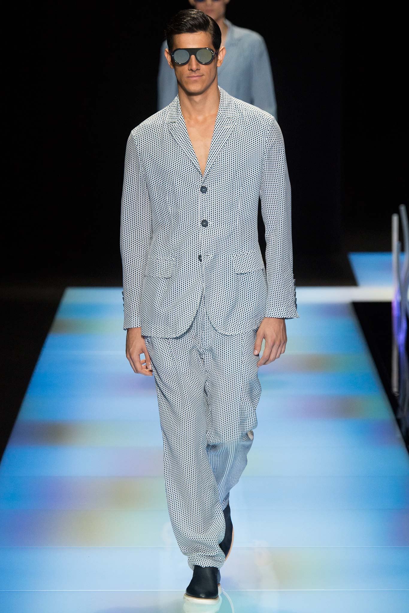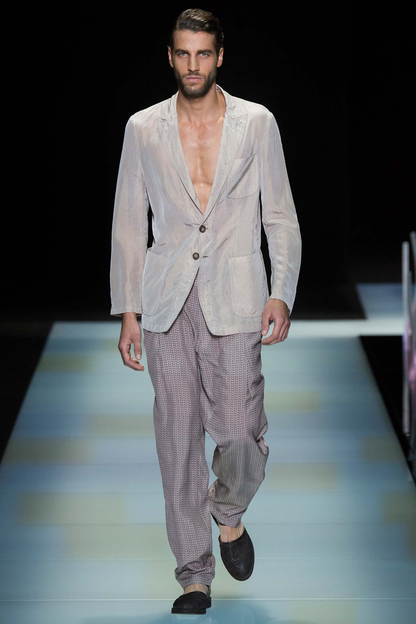 Armani kept a close eye on proportion, pairing wide, pleat-front trousers with curve-hugging cardigan knits. There were unstructured jackets galore, in linen, a shadowy herringbone weave, seersucker and other crinkly finishes. The designer pushed structure – or the lack thereof – to its outer boundaries with printed silk pajama suits.