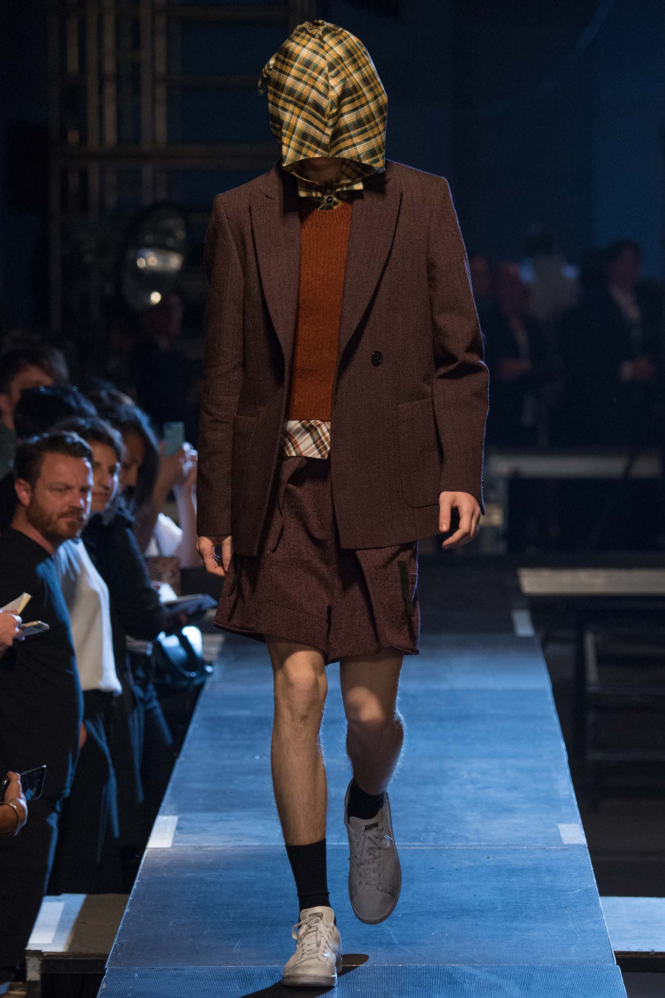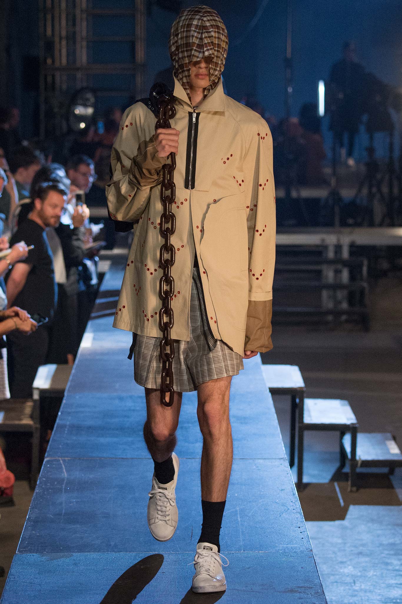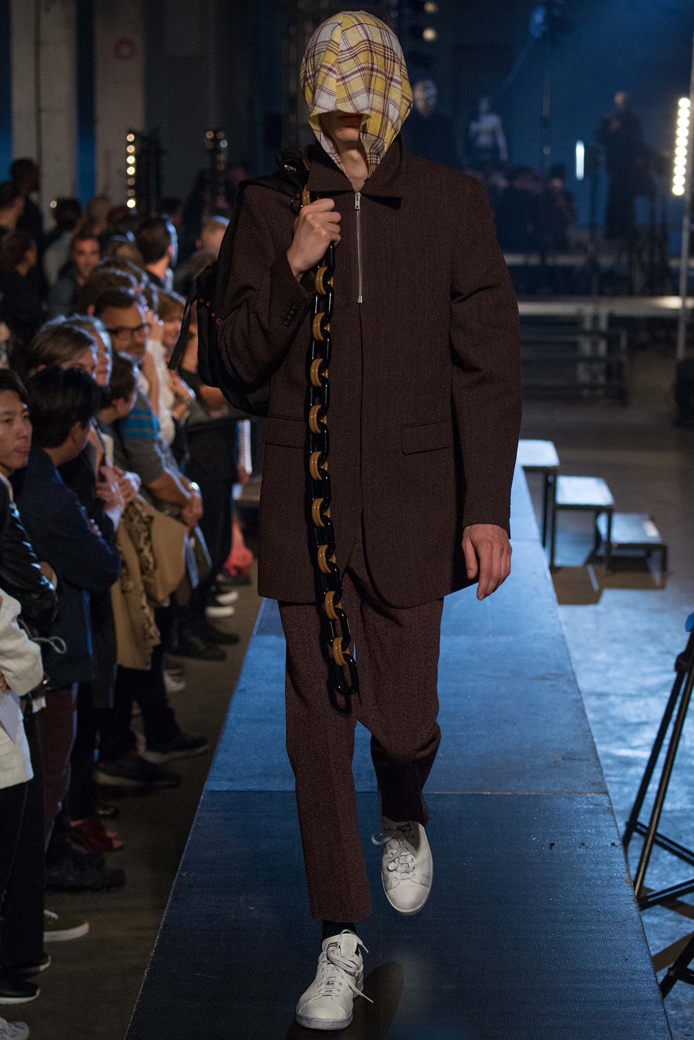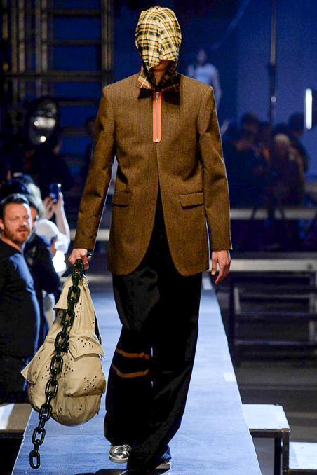 The grim reaper madras hoodies worn by the male models on the raised Raf Simons catwalk definitely produced the desired effect. They obscured the models faces while they walked fast, and in packs, as they lugged over their shoulders long thick plastic chains hauling weighty bags behind them. It made for a disquieting and eerie mood.