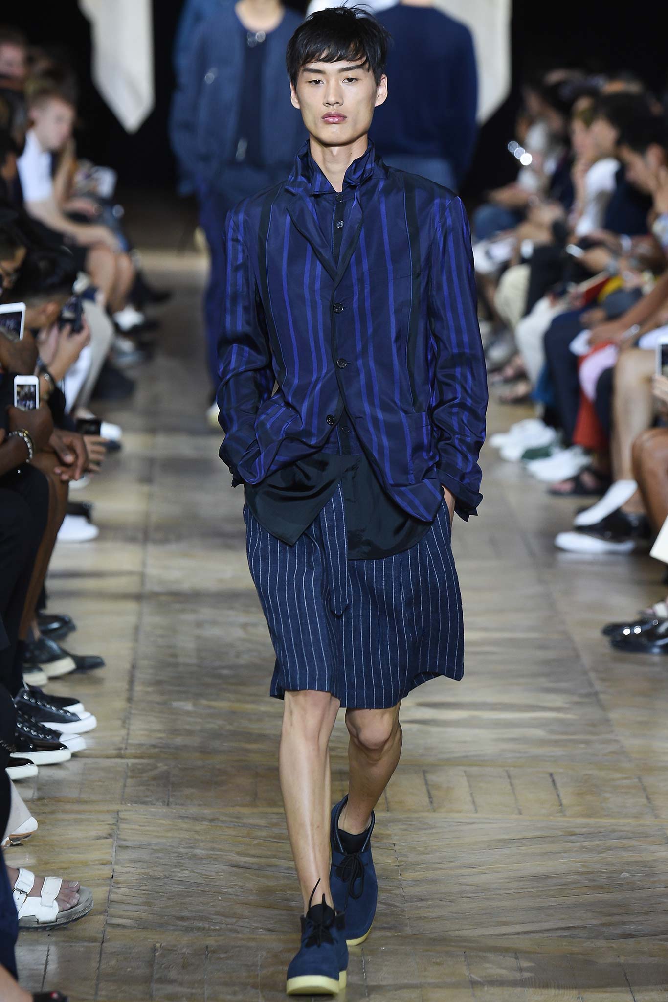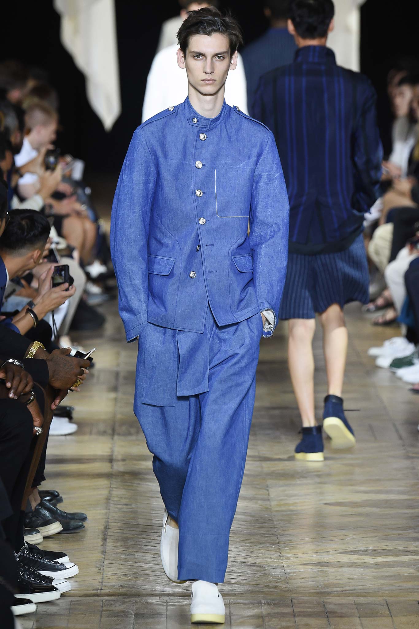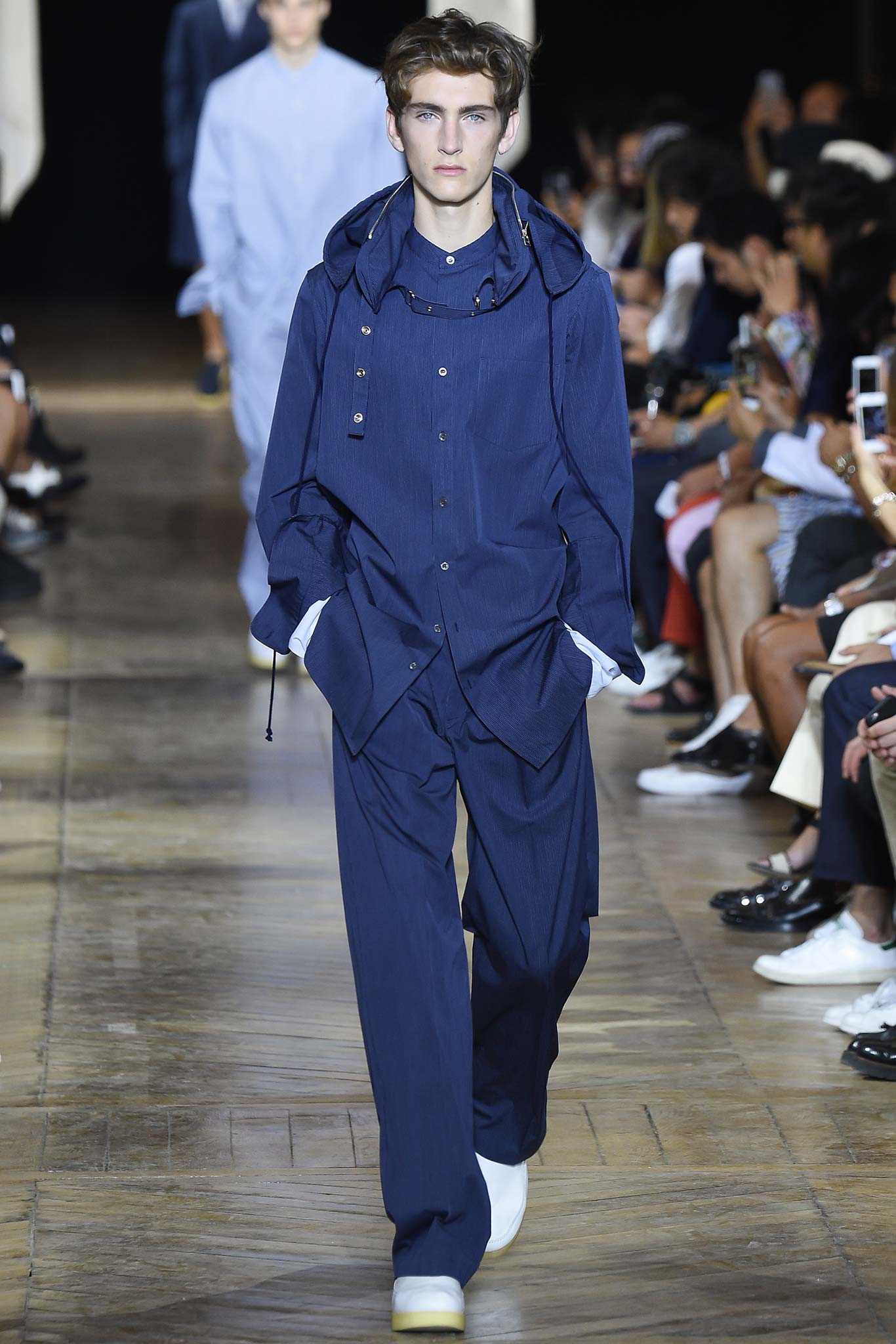 Handsomely oversized shirts replaced commonplace jackets for a new kind of suit. The designer also took to athletic double-breasted numbers, rendering them in traditional banker stripes. Pajama looks in silky materials felt luxurious and street-friendly at the same time, while multi-pocket utility outerwear got an update via botanical prints.