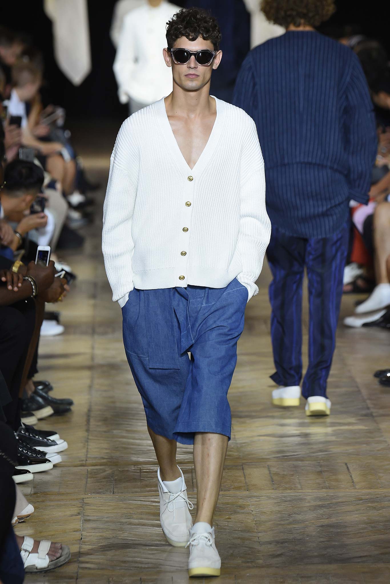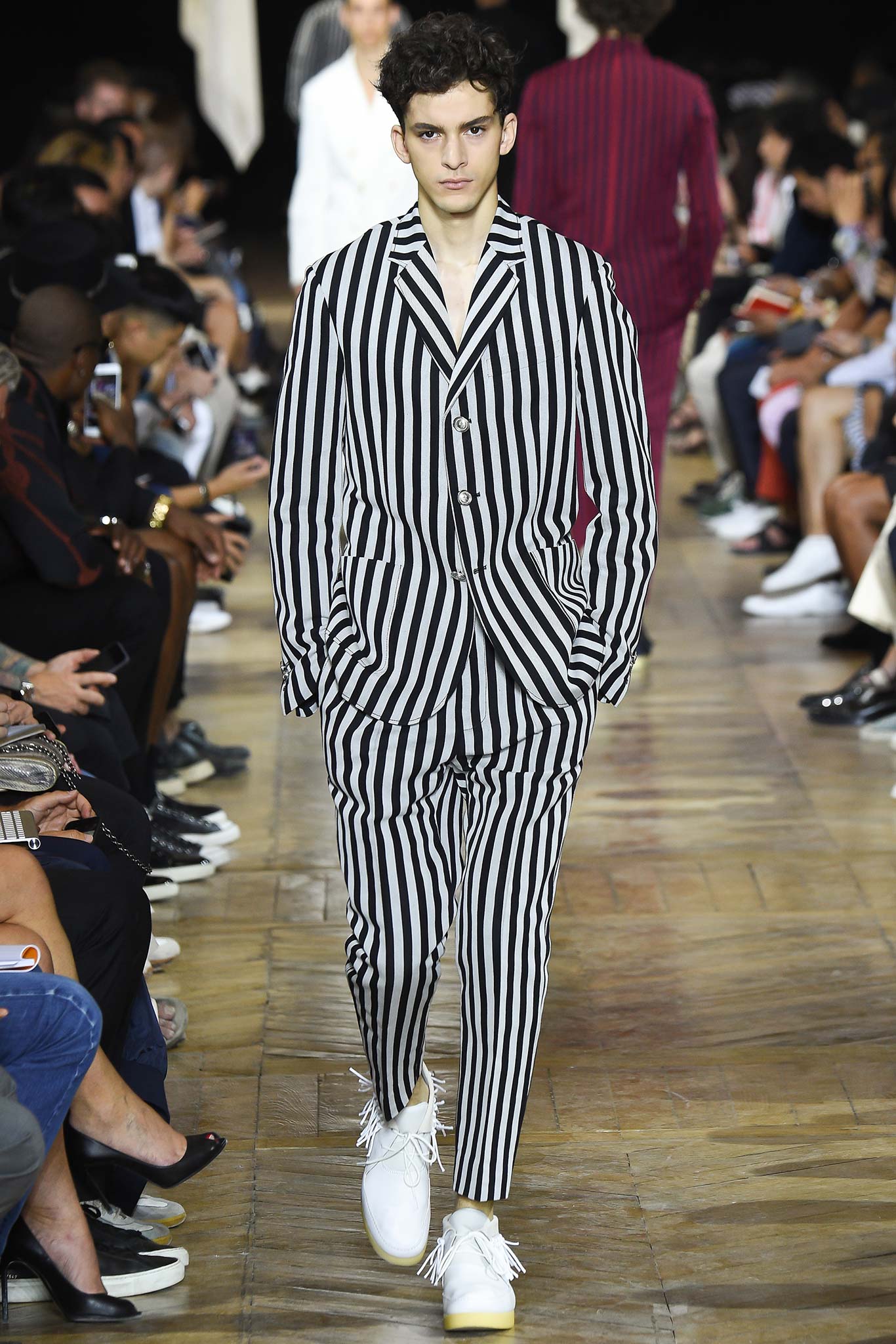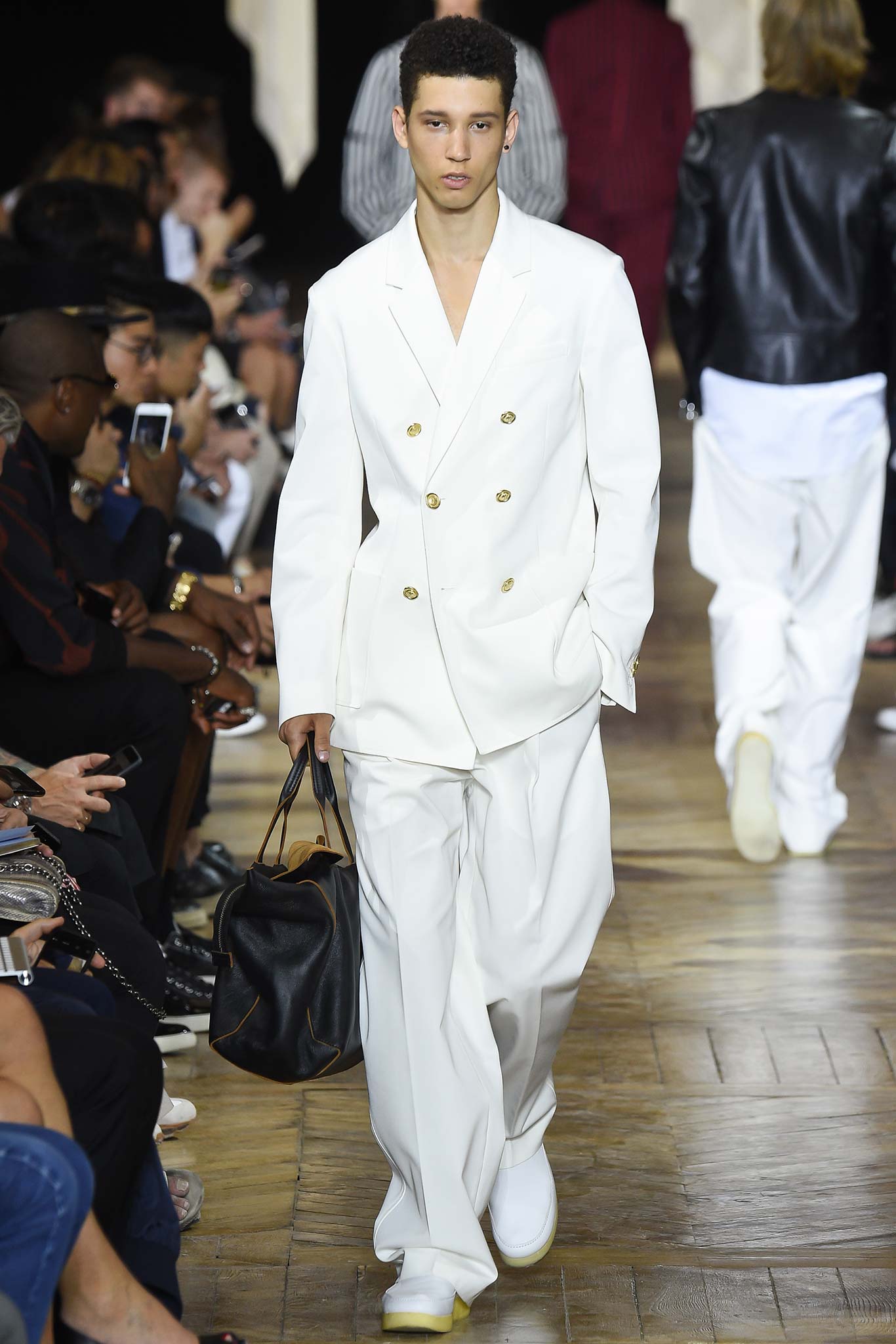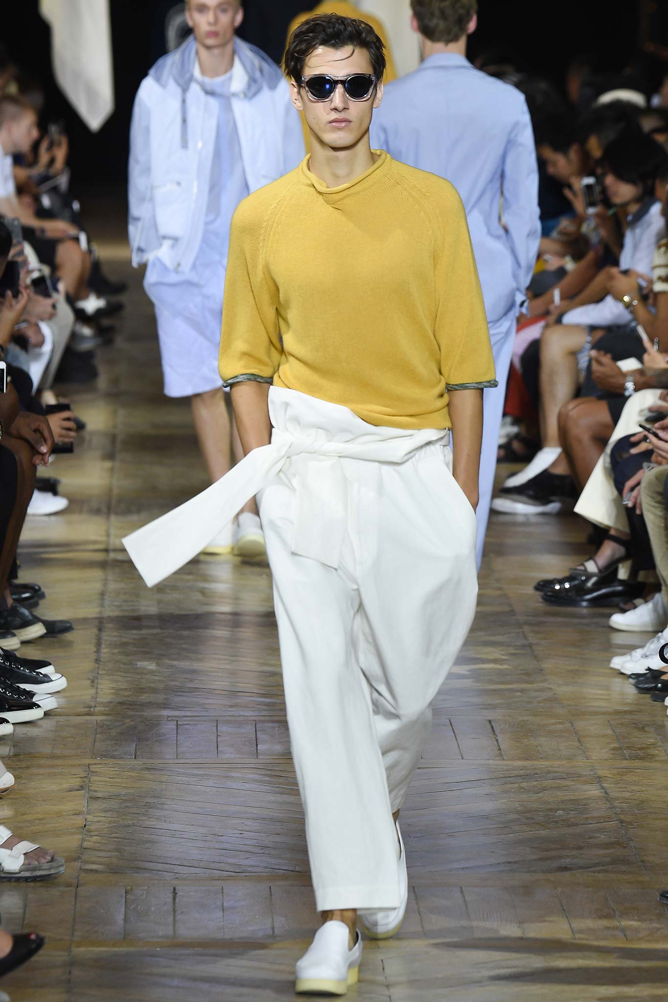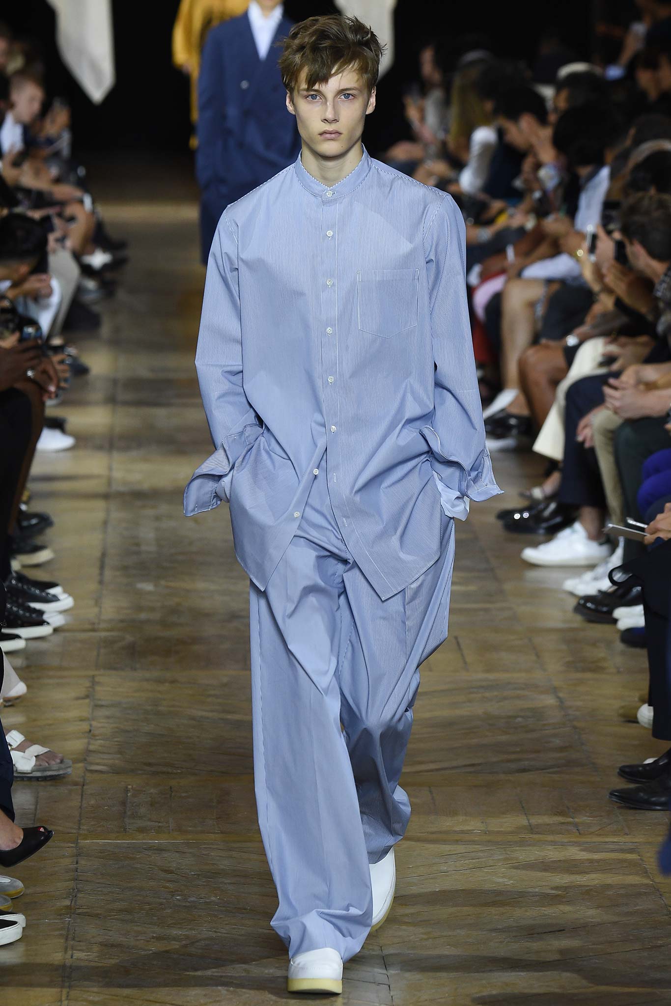 Throughout, the designer walked the line between cool and cordial with bravado, exemplified by his series of high-waist, boxy pants, featuring belts of the same fabric.