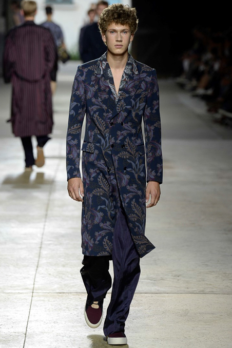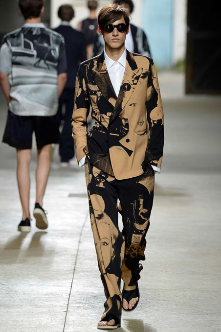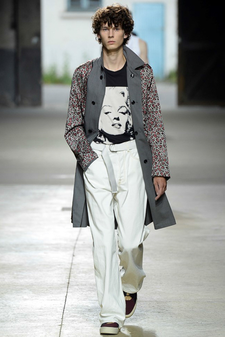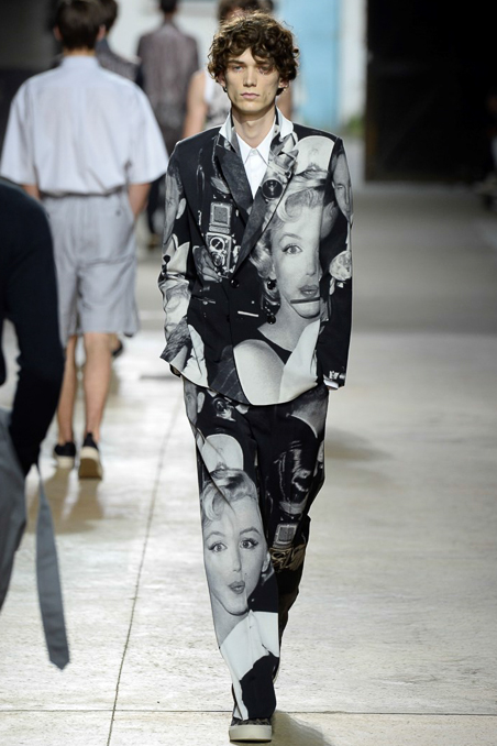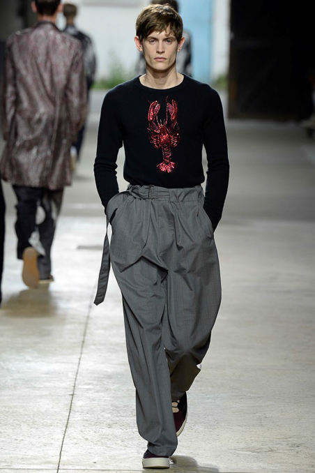 Will these black-and-white photo prints — seen on suits, capes, shirts, sweaters, boxer shorts, you name it — be as influential as the designer’s silky, boudoir collection a year ago? This collection was not as compelling, though it echoed other Paris runways in pointing to a more embellished path for men’s wear. Van Noten added sparkly embroideries and sequins to his roomy, vaguely Fifties clothes as Elvis Presley crooned “Love Me Tender” and his models filed into a vast warehouse. Besides Norma Jean’s luscious lips, lobsters were a recurrent motif, winking to Salvador Dali and Elsa Schiaparelli, among “creative provocateurs” Van Noten cited as references.