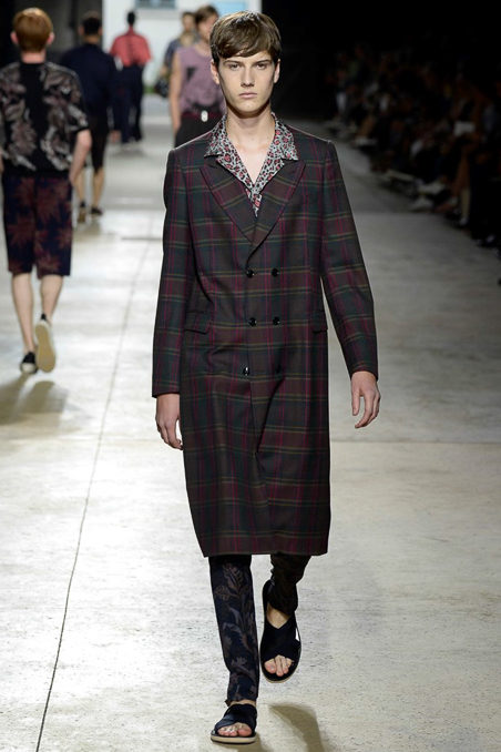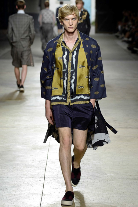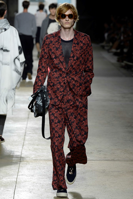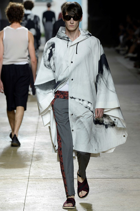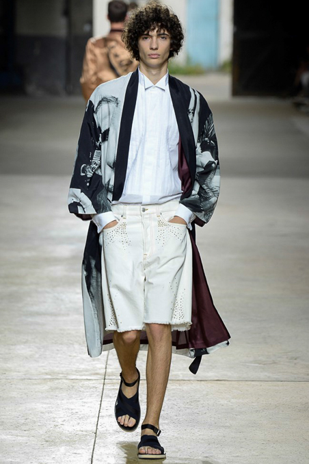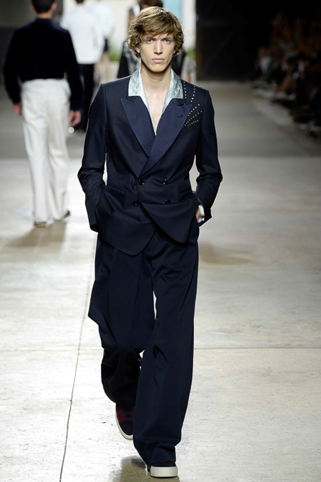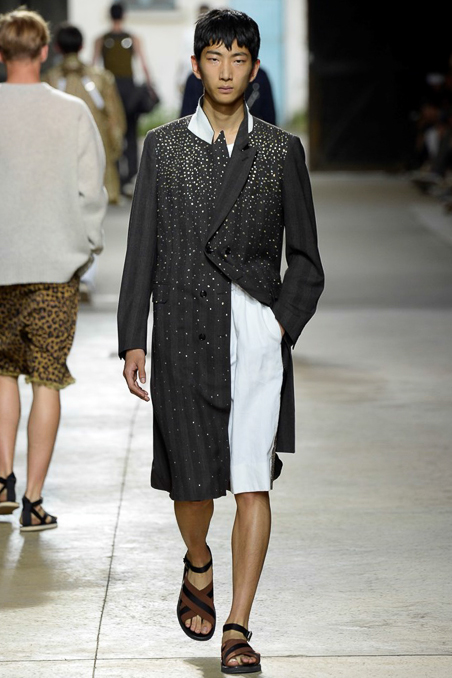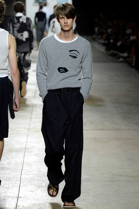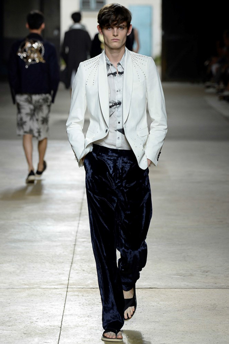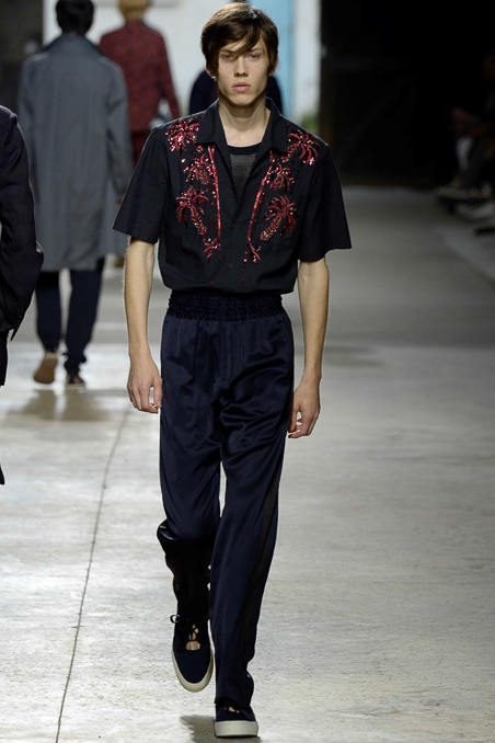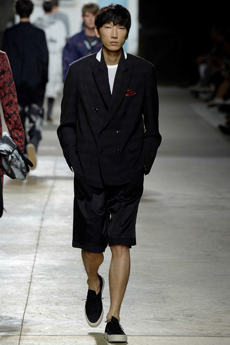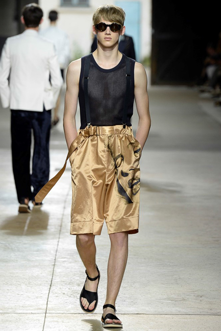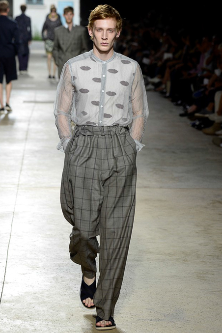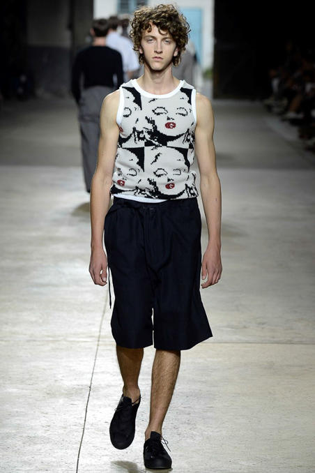 Like Giorgio Armani in Milan, the designer excels at looser silhouettes, teaming his slouchy double-breasted jackets and boxy camp shirts with skater shorts. Mesh tank tops and matching suspenders were a foil to the high-waist pants that anchored most other looks.