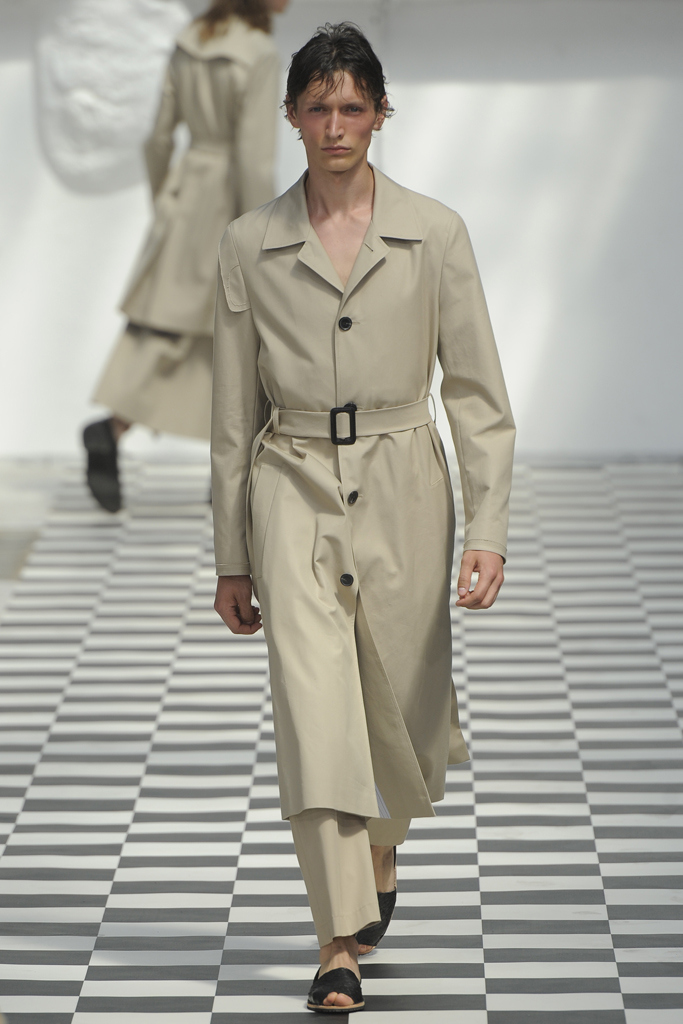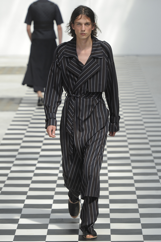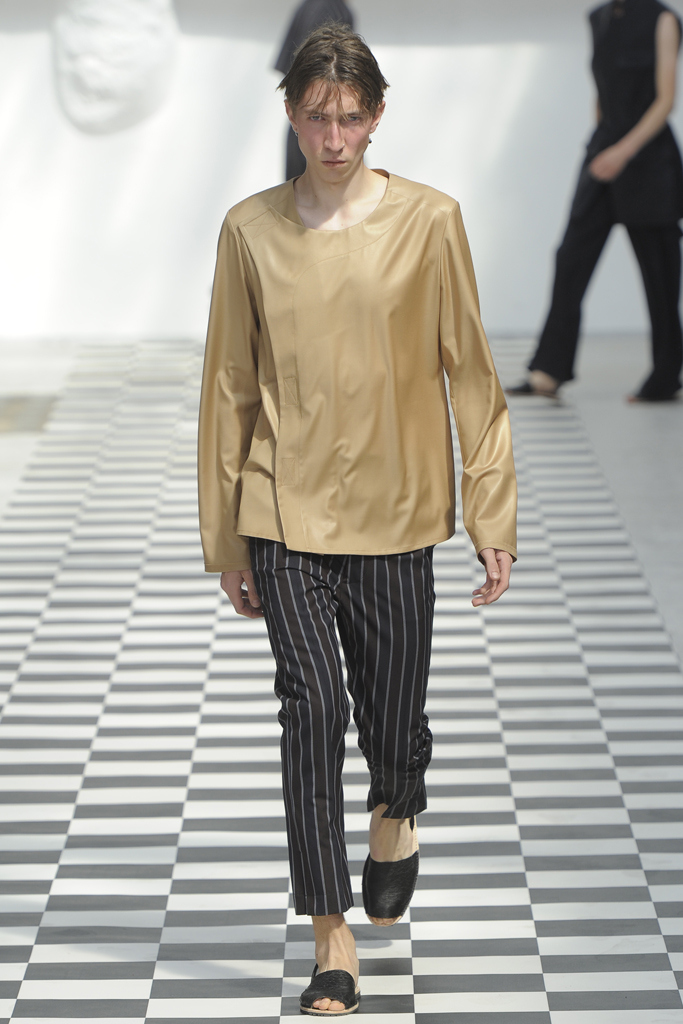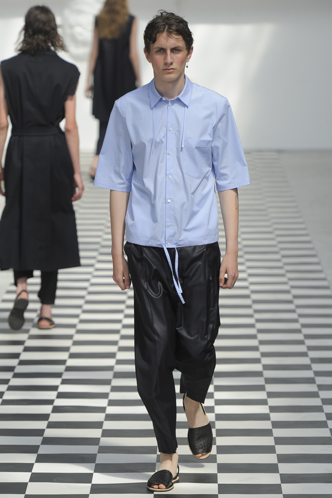 The sportswear-meets-tailoring spiel is as overstaffed as the Parisian subway during the recent taxi strikes. To emerge in this field takes an uncommon proposal, which the German designer posited by offering gender-neutralized designs in the form of patterns taking body shapes, rather than gender, into consideration. Yet, by continuously mining the same conceptual space, Hahn confines herself to exploring the inroads between male and female silhouettes, leaving a significantly reduced corpus. With variations on the trench coat, on the blazer, on athletic details, Hahn returned to the tropes of her design, hoping for the perfect balance. She achieved some measure of it in an evening blazer with pearl closure (for her and him), or in the beige trifecta of a bustier dress, double breasted coat, and jumpsuit. This time around, her womenswear felt polished while her menswear seemed caught up in an over-intellectualized web.