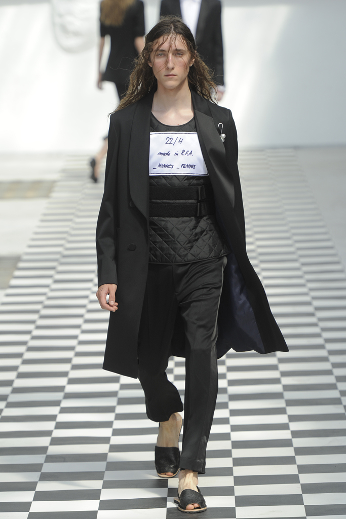 Crimson-faced, hair hanging limply, sweat threatening to pearl their skins, the models of Stephanie Hahn’s 22/4_Hommes presentation matched the guests perfectly as the mid-afternoon heat turned the designer’s venue into a steamy broiler. The date disk invitation said 4PM and no one would have dreamed of meter-feeding to prolong a stay in the sweltering Garage Turenne.