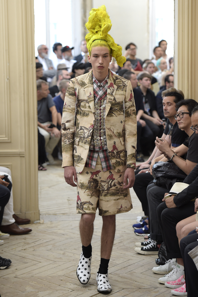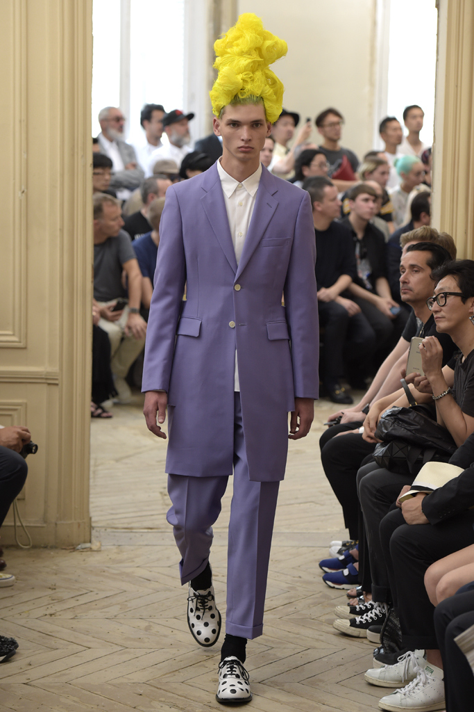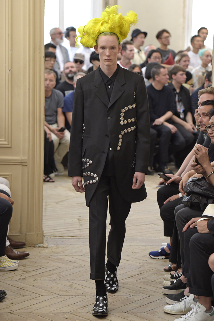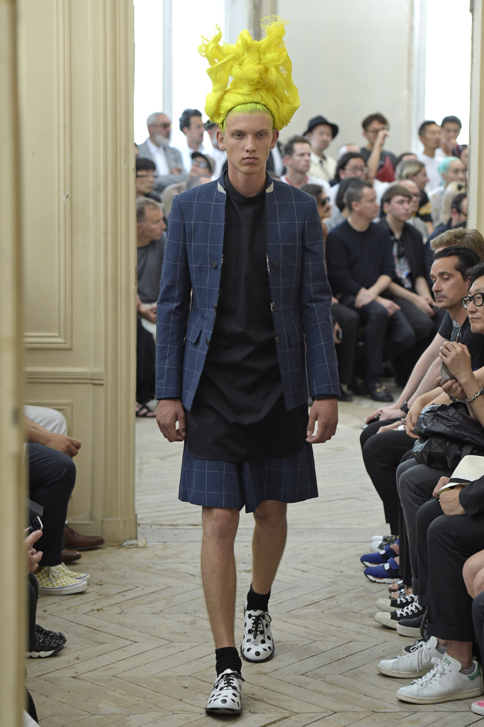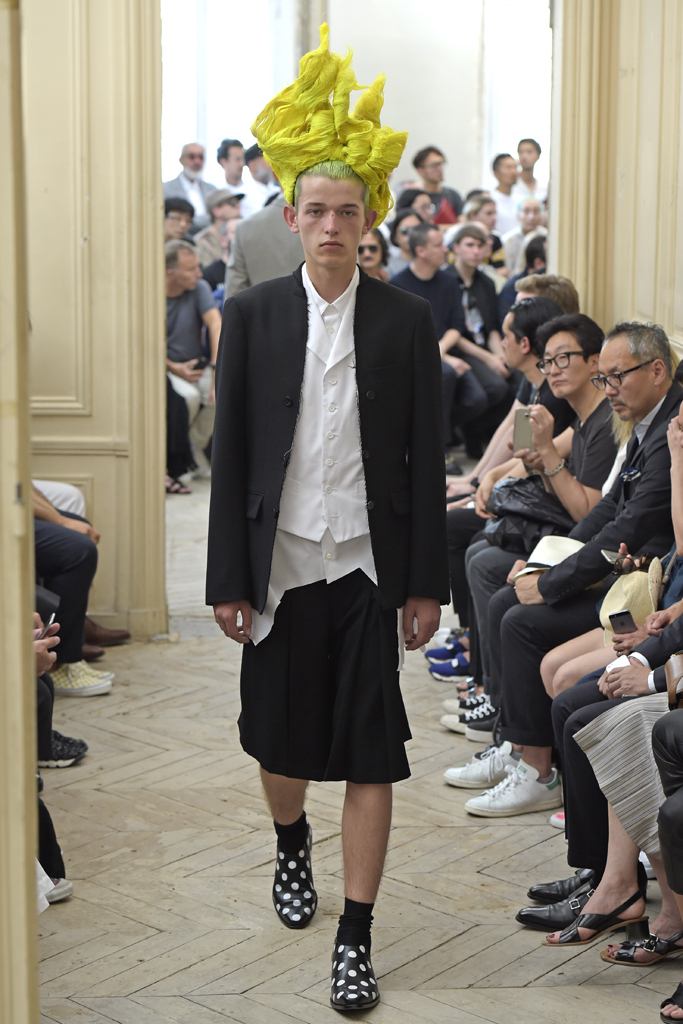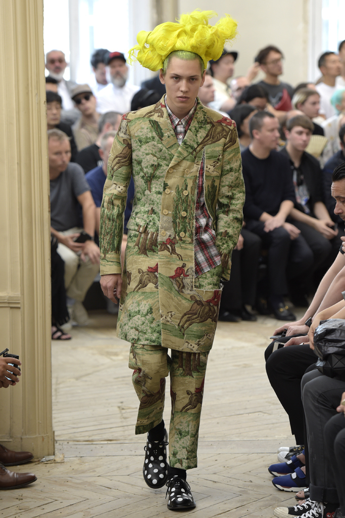 Wearing artfully deconstructed outfits paired with polka-dot brogues, models in extravagantly sculpted fluorescent yellow wigs ambled through a mid-renovation Haussmann-style apartment near the Paris Opera. Kawakubo carved right angles into a double-breasted coat in a tapestry fabric depicting British hunting scenes, providing glimpses of the tartan shirt worn underneath. Pants were slashed from the knee down, while a black evening jacket came with a Fred Flintstone hem.