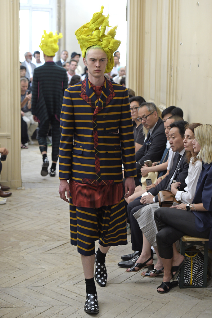 Wearing artfully deconstructed outfits paired with polka-dot brogues, models in extravagantly sculpted fluorescent yellow wigs ambled through a mid-renovation Haussmann-style apartment near the Paris Opera. Kawakubo carved right angles into a double-breasted coat in a tapestry fabric depicting British hunting scenes, providing glimpses of the tartan shirt worn underneath. Pants were slashed from the knee down, while a black evening jacket came with a Fred Flintstone hem.
