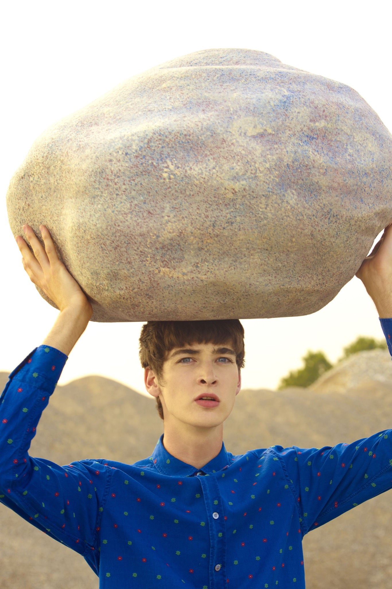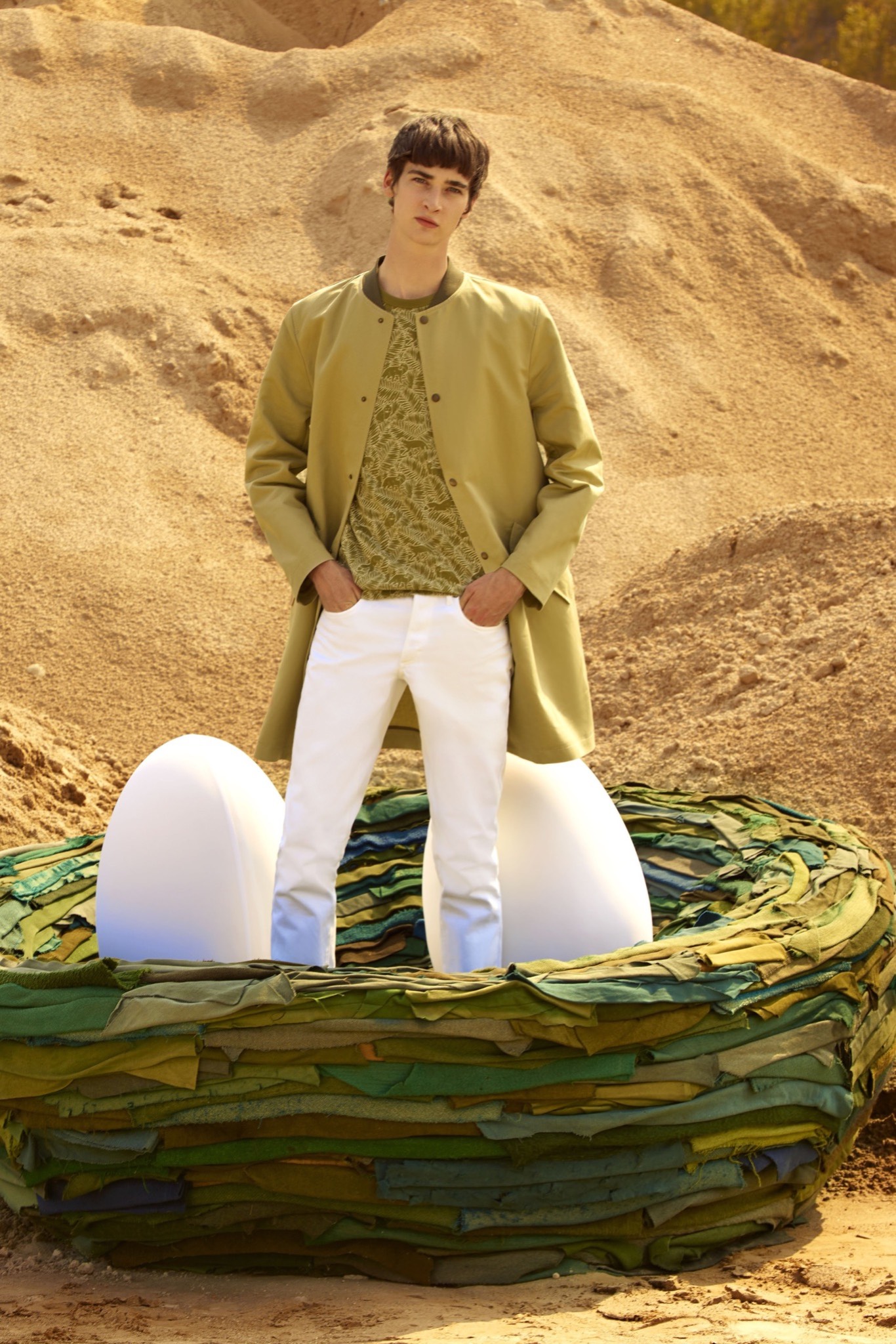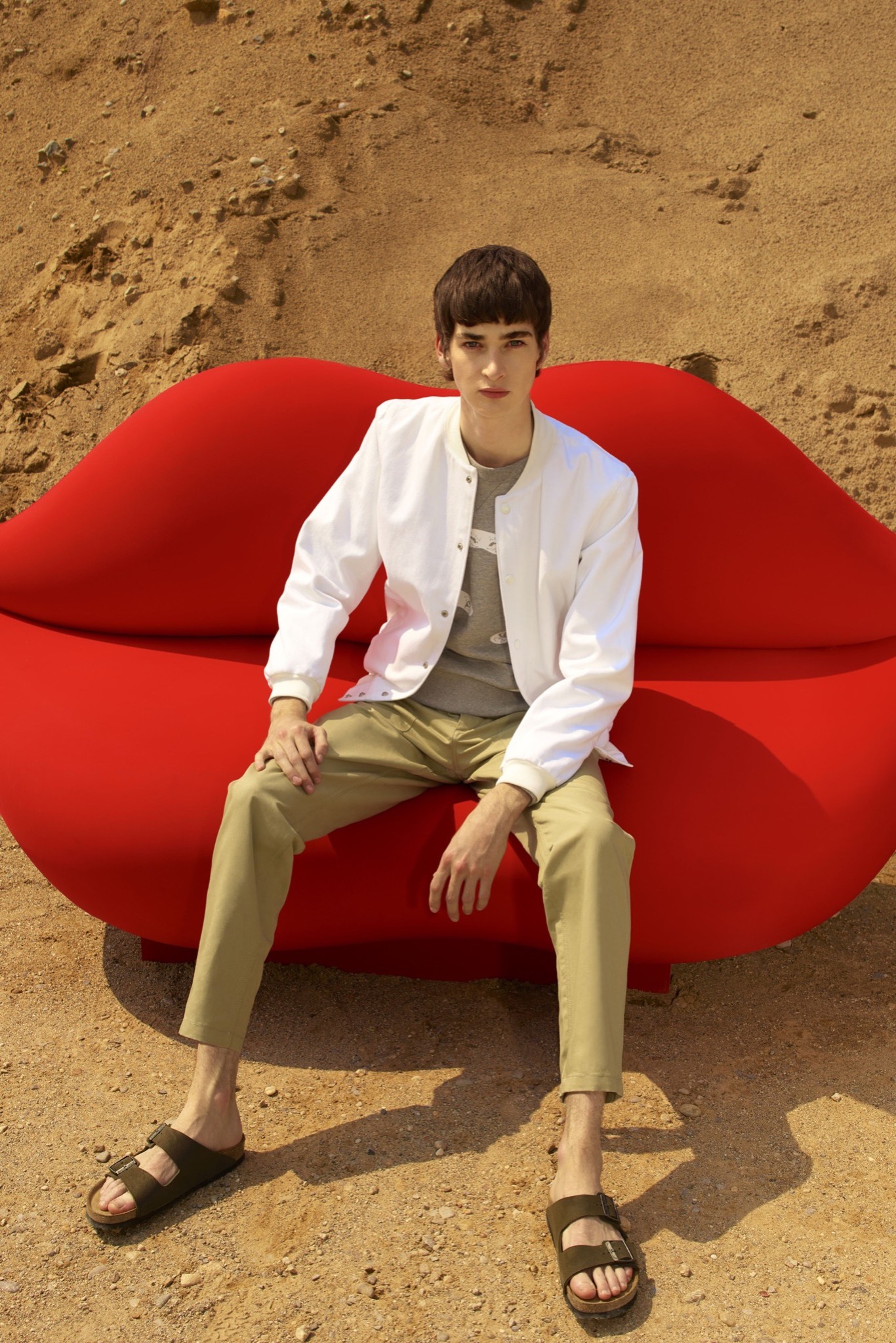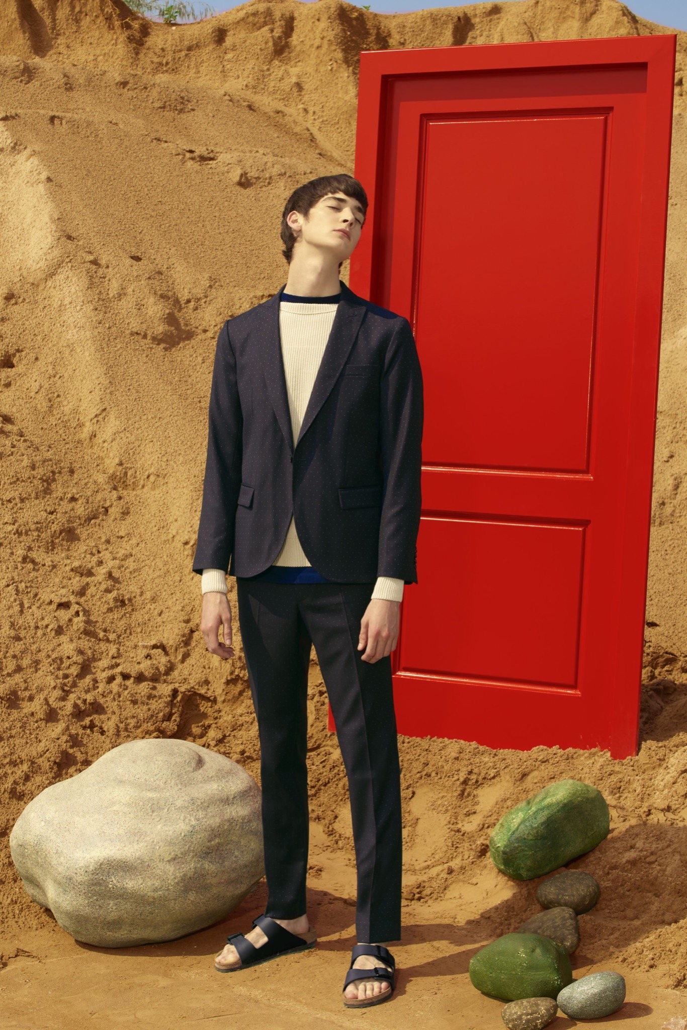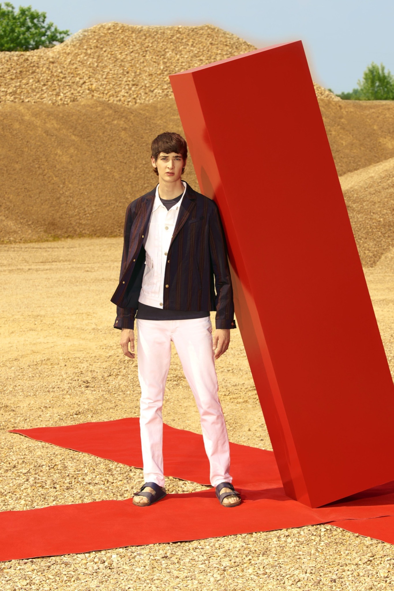 On their own, there was nothing exceptionally eccentric about the clothes that comprised Maison Kitsuné‘s latest men’s collection. One might even argue that such pieces as the micro-herringbone mac, pin-dot suiting, and perfect-fit white jeans attested to a more finely finished and attractively polished offering than ever. But set against a surrealist object-filled desert—a staging dreamed up by Pierpaolo Ferrari—the collection shifted into a different register and the twists took over. Now the standouts included a workwear jacket-and-pants combo in cornflower blue moleskin, a striated and pixelated bandanna pattern, op art-ish jacquard knits, and the quasi-sardonic tee reading “I need Kitsuné to make me happy.” Need is relative.