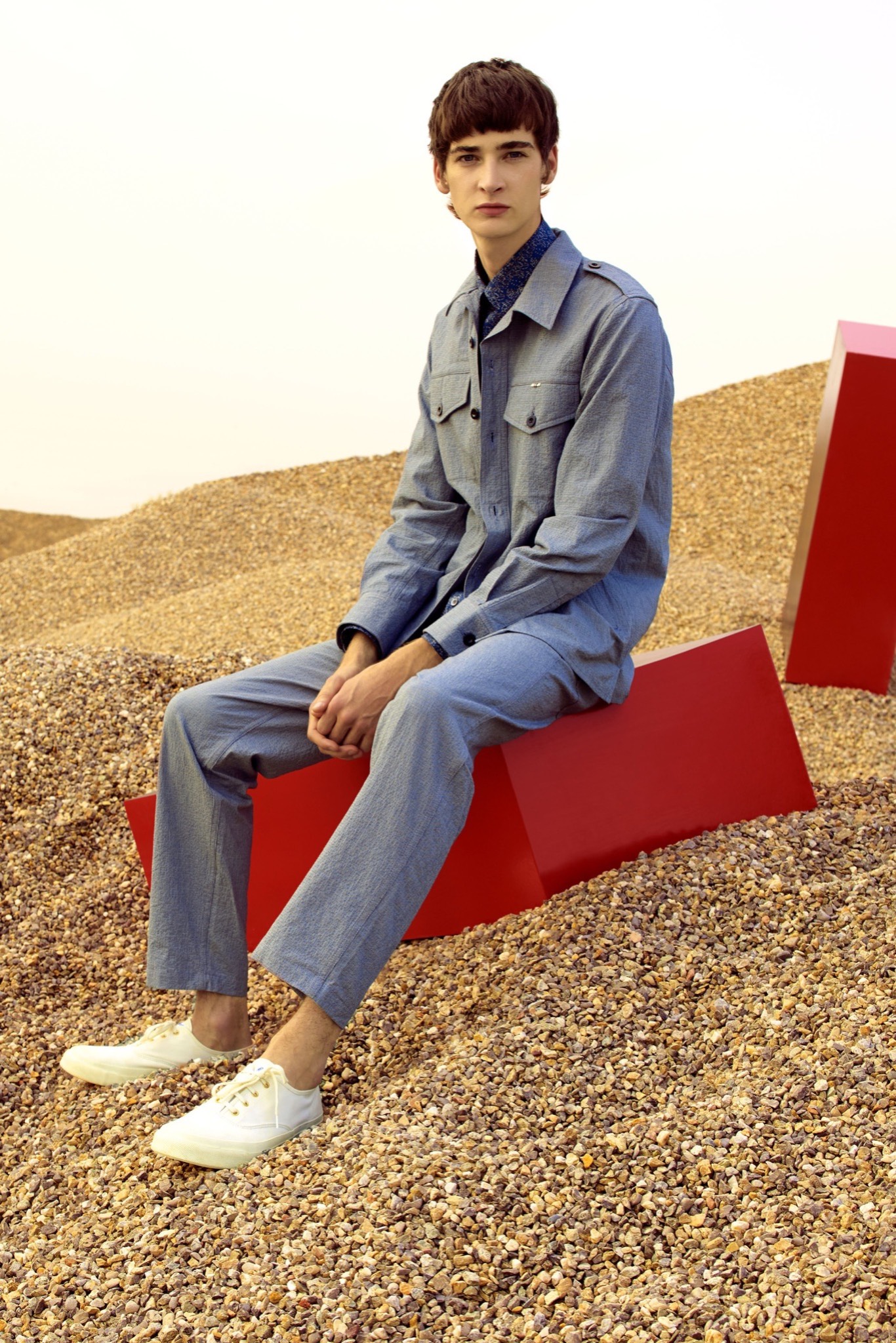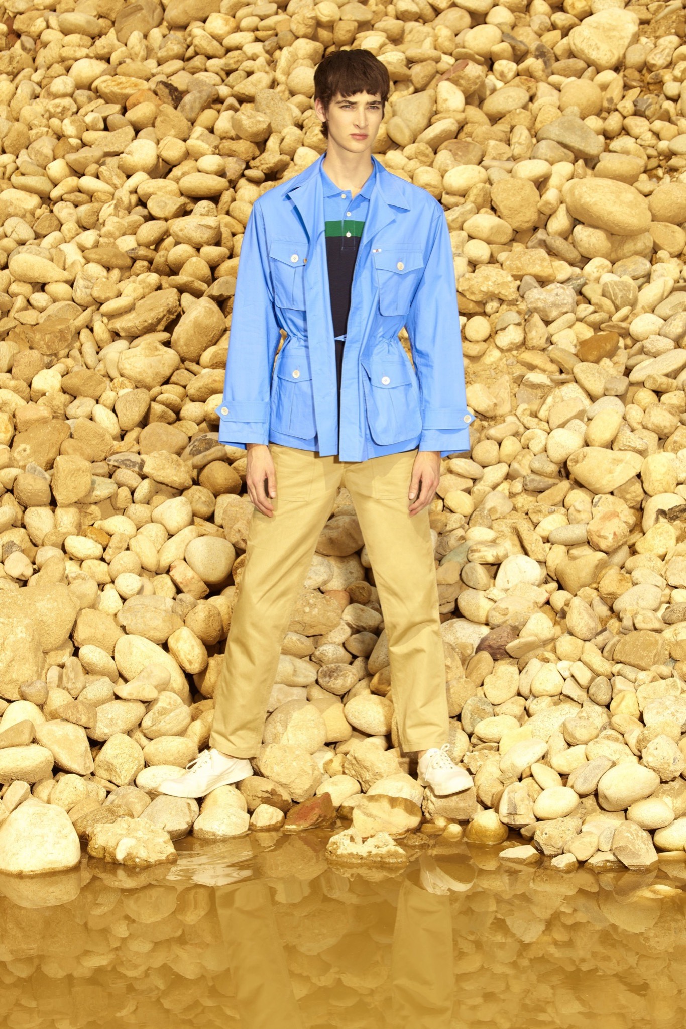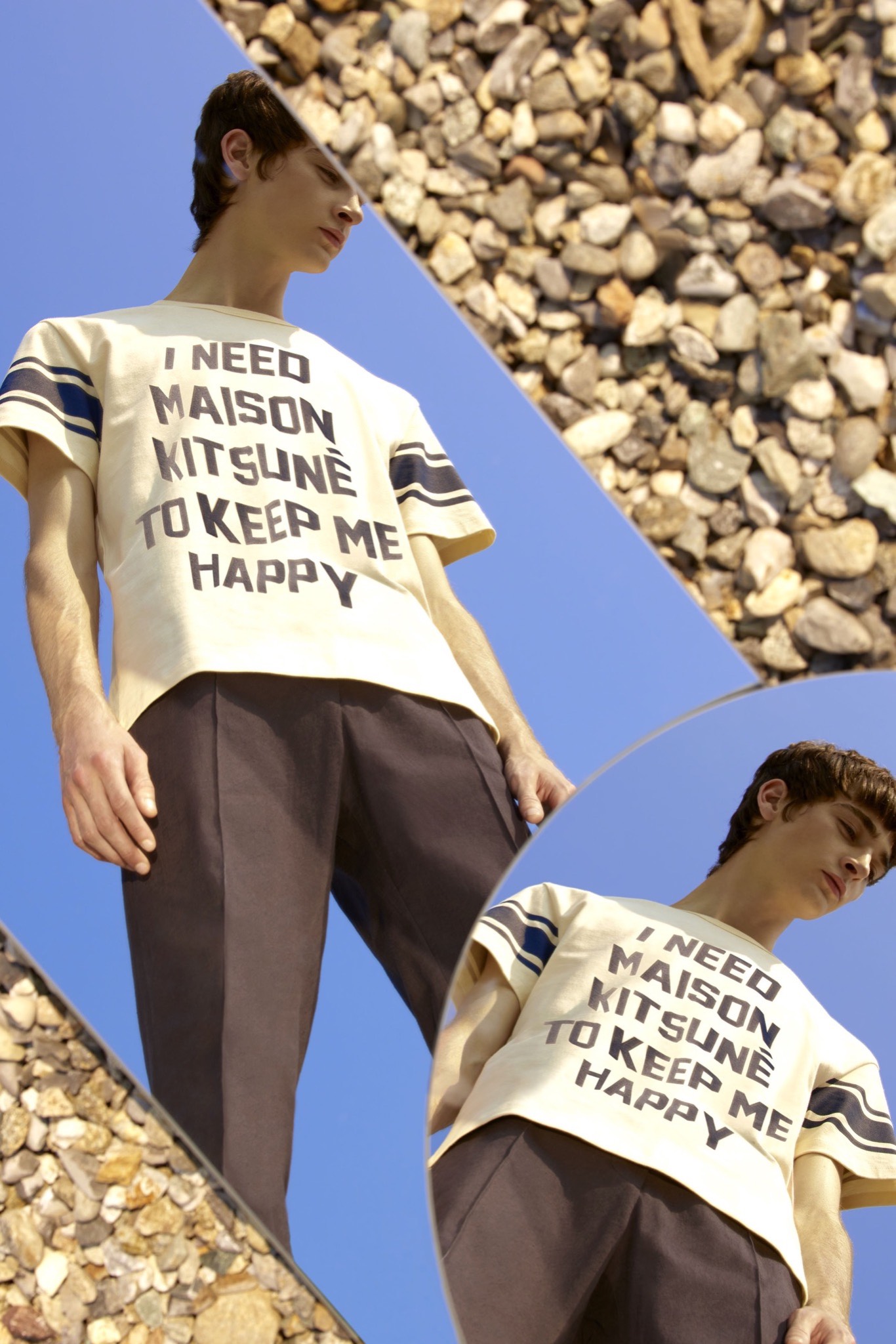 On their own, there was nothing exceptionally eccentric about the clothes that comprised Maison Kitsuné‘s latest men’s collection. One might even argue that such pieces as the micro-herringbone mac, pin-dot suiting, and perfect-fit white jeans attested to a more finely finished and attractively polished offering than ever. But set against a surrealist object-filled desert—a staging dreamed up by Pierpaolo Ferrari—the collection shifted into a different register and the twists took over. Now the standouts included a workwear jacket-and-pants combo in cornflower blue moleskin, a striated and pixelated bandanna pattern, op art-ish jacquard knits, and the quasi-sardonic tee reading “I need Kitsuné to make me happy.” Need is relative.