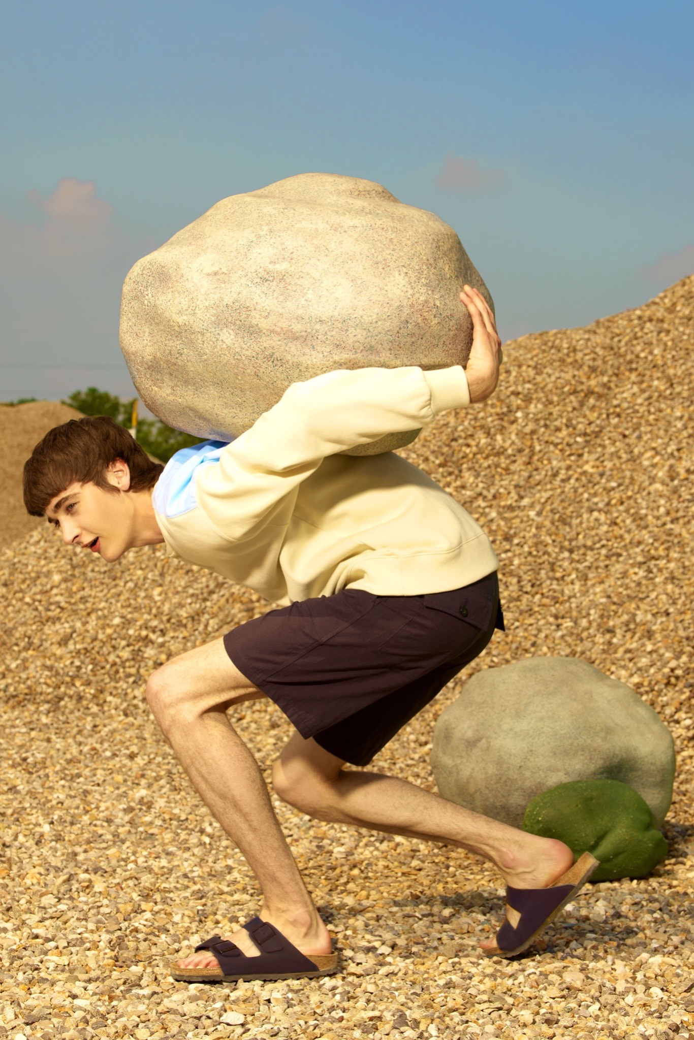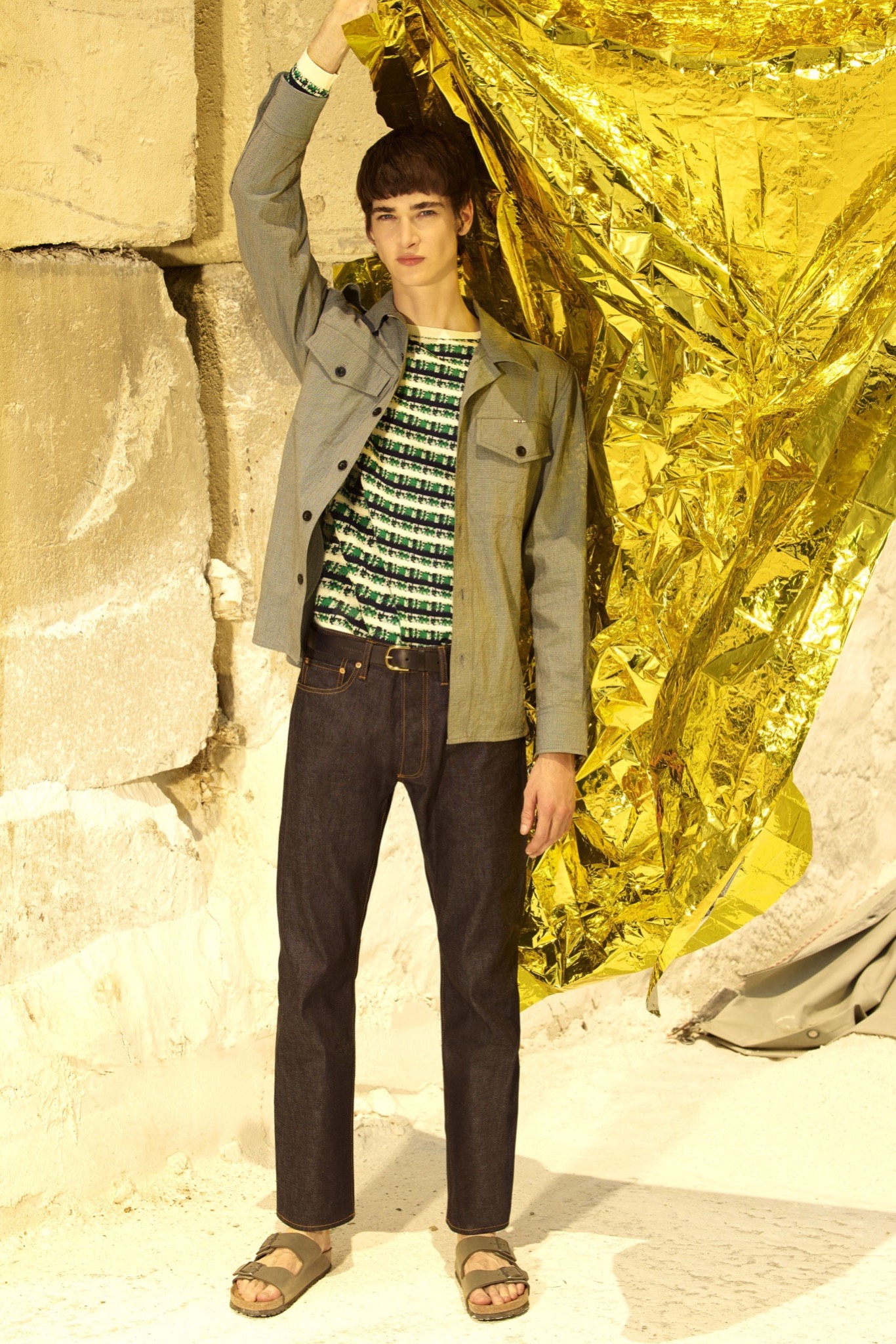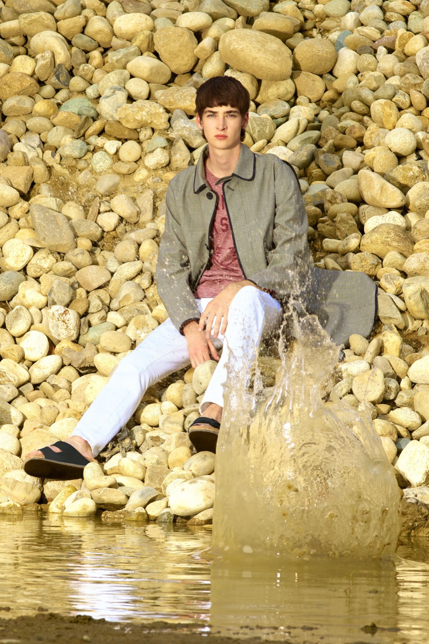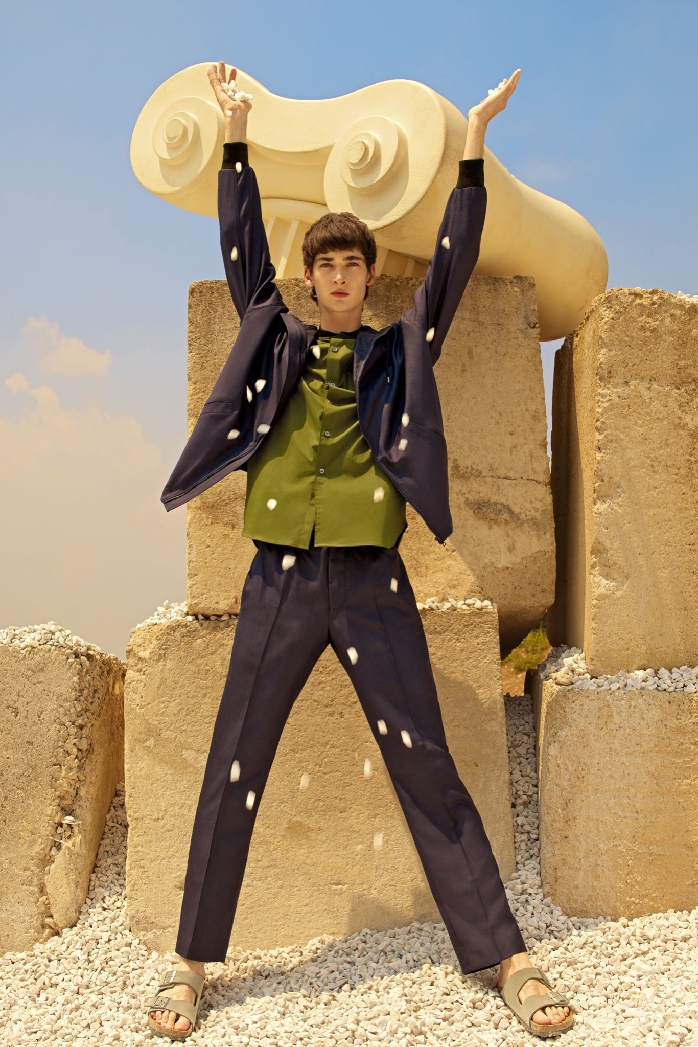 On their own, there was nothing exceptionally eccentric about the clothes that comprised Maison Kitsuné‘s latest men’s collection. One might even argue that such pieces as the micro-herringbone mac, pin-dot suiting, and perfect-fit white jeans attested to a more finely finished and attractively polished offering than ever. But set against a surrealist object-filled desert—a staging dreamed up by Pierpaolo Ferrari—the collection shifted into a different register and the twists took over. Now the standouts included a workwear jacket-and-pants combo in cornflower blue moleskin, a striated and pixelated bandanna pattern, op art-ish jacquard knits, and the quasi-sardonic tee reading “I need Kitsuné to make me happy.” Need is relative.