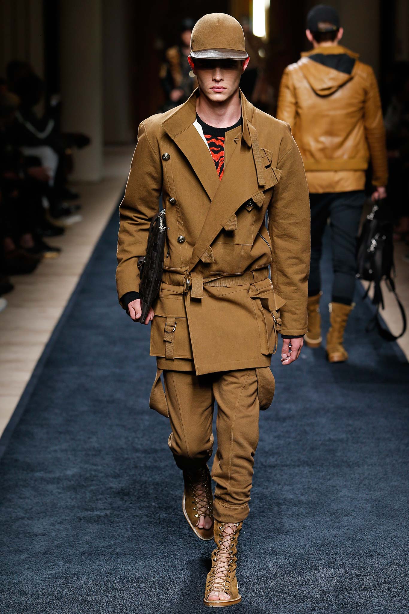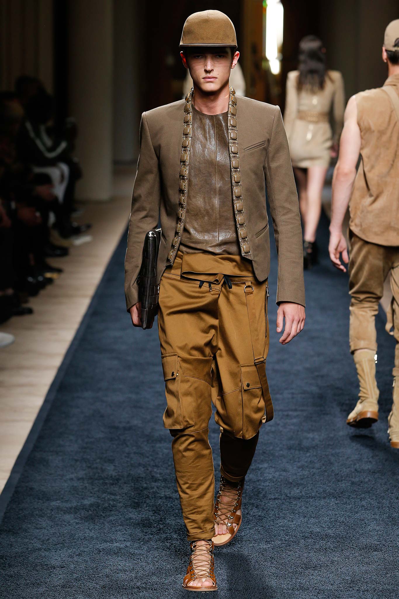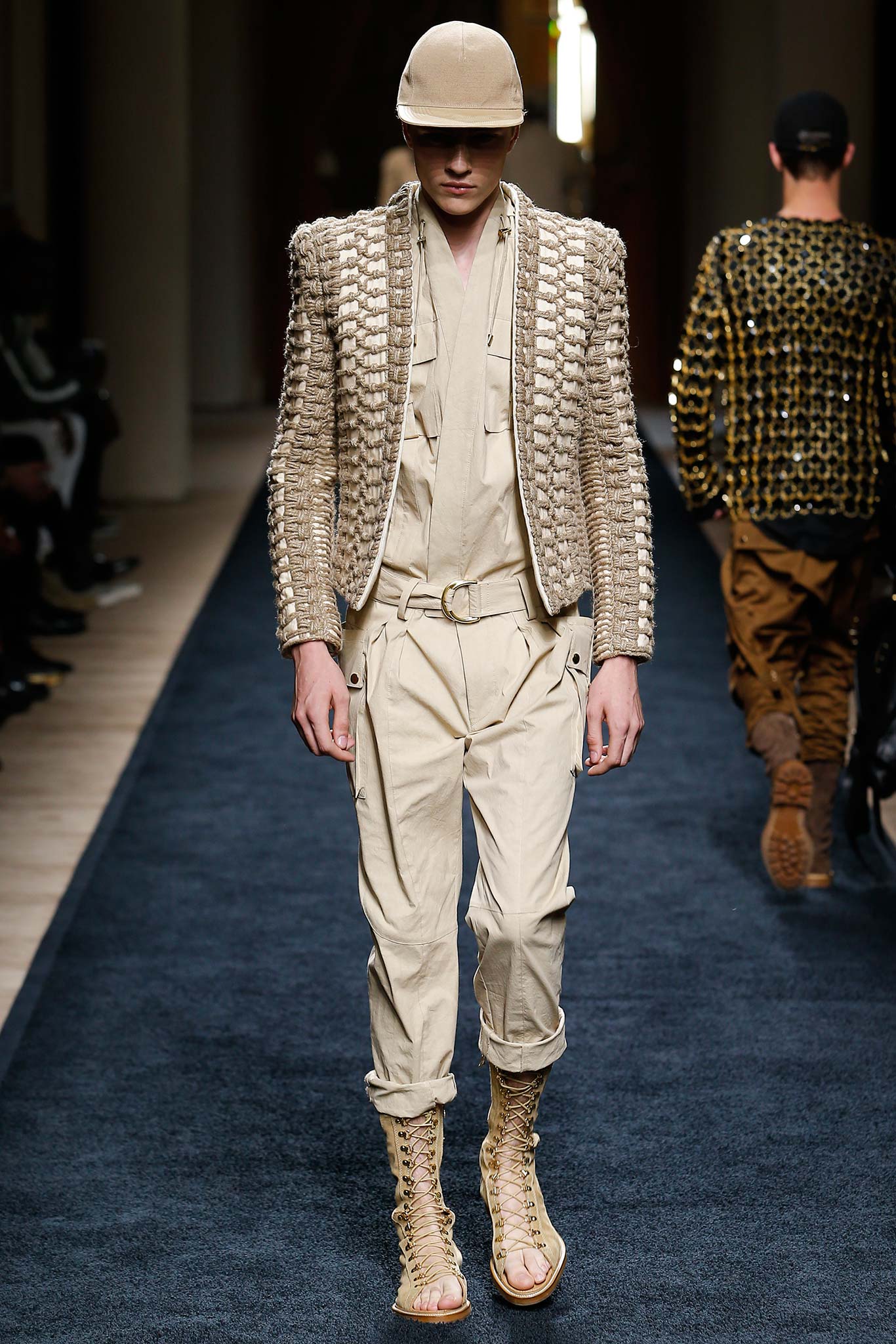 For his debut men’s show, Rousteing didn’t tread softly but strode boldly—opting for that Ralph classic of a runway theme, Safari. But this wasn’t just Balmain in khaki. For while this house has made heavy embellishment and an almost sickly richness its bread and butter, there was a lightness of touch in the way Rousteing reacclimatized it today. Desert boots were transformed into sandals by the removal of tongue and toe. Drill combat pants were upgraded with a drop crotch and cosmetically hanging suspenders; the house’s Fabergé lush military braiding was reissued in a jute-ish organic twine.