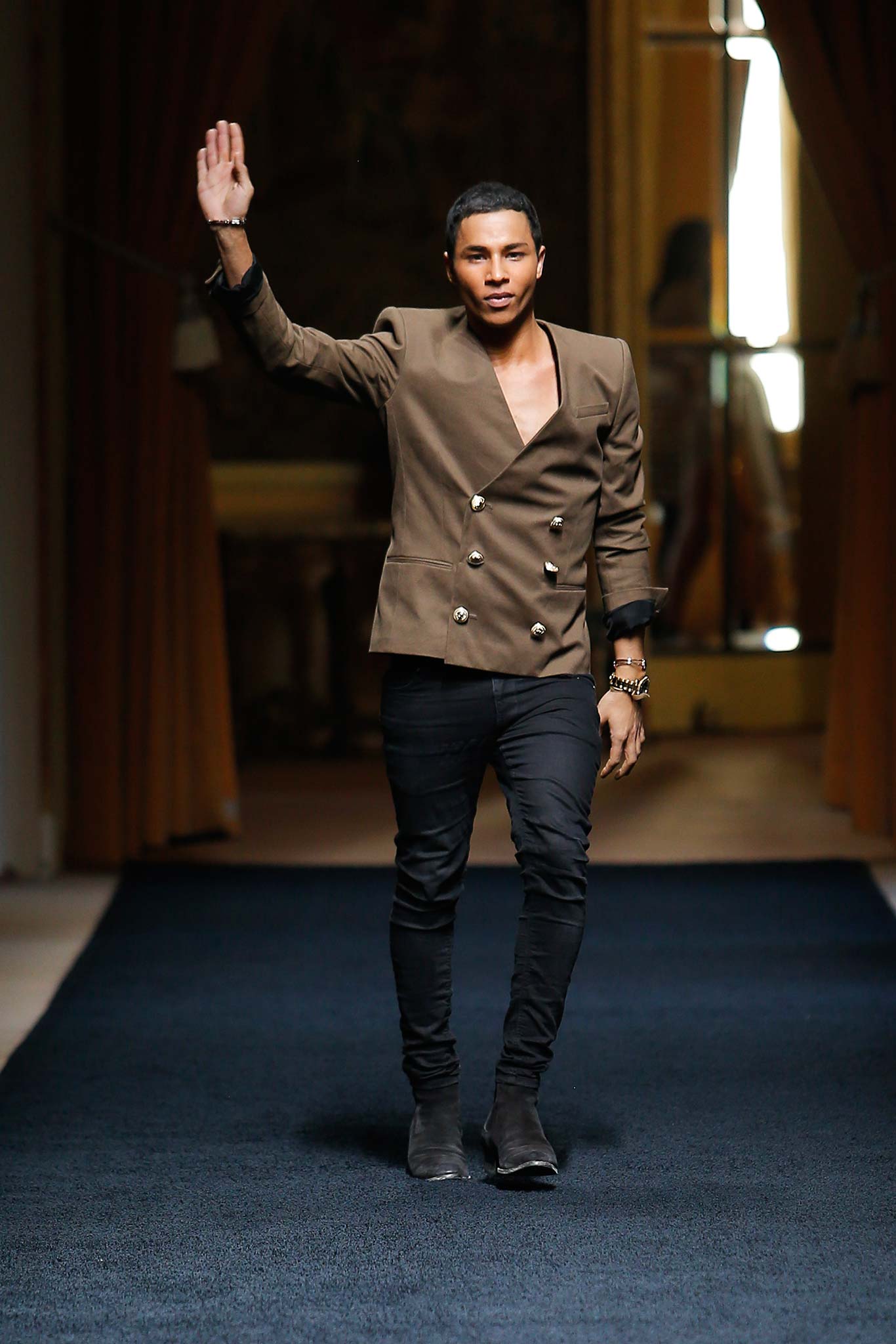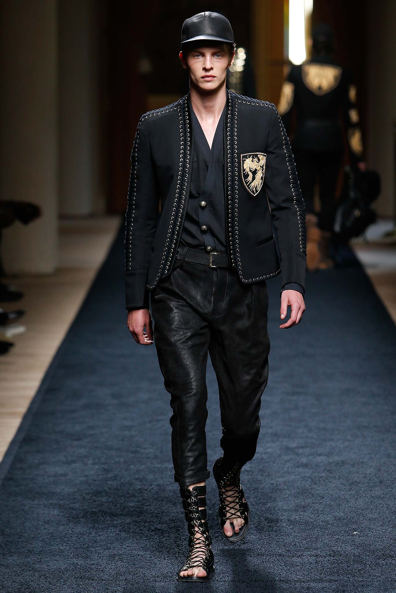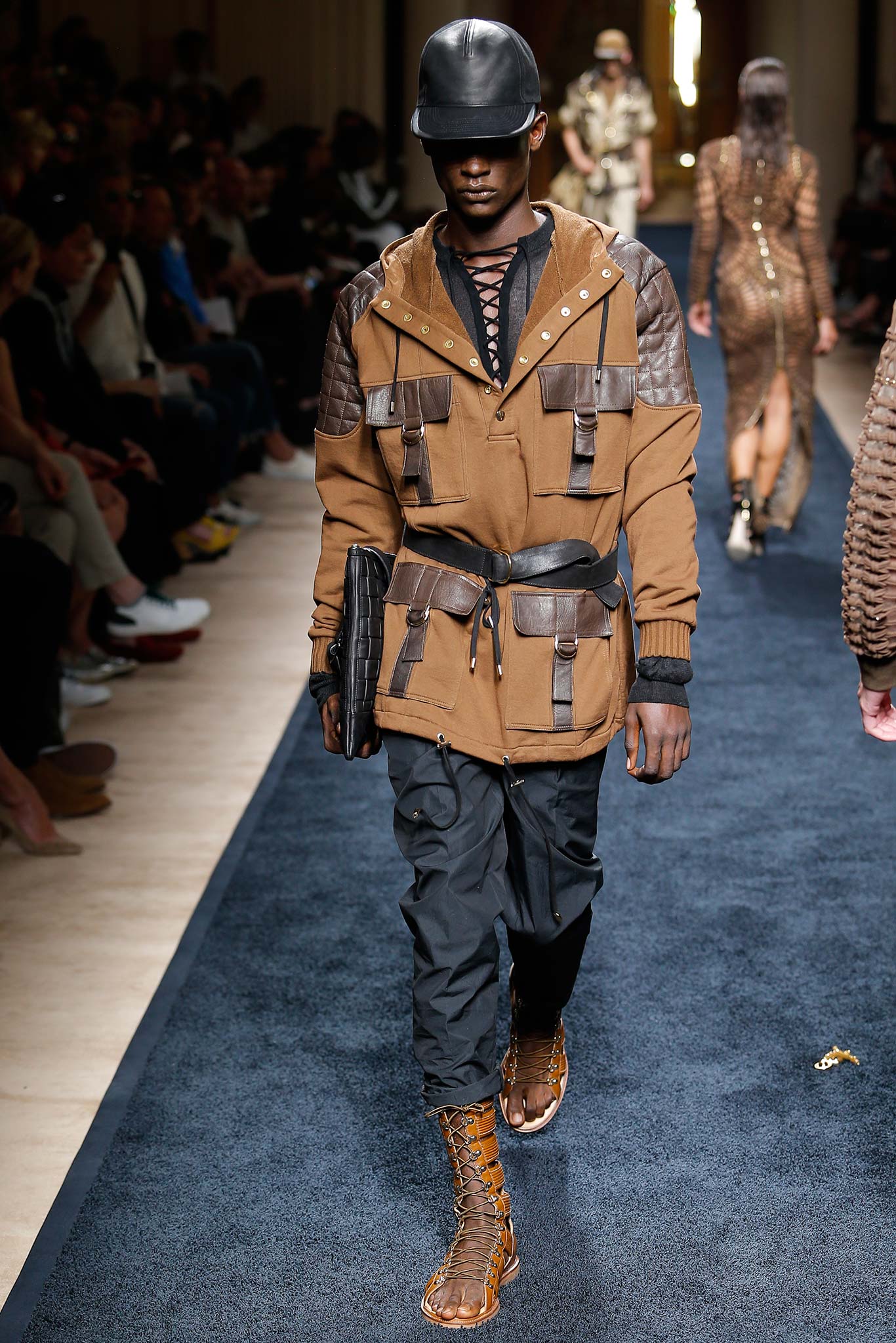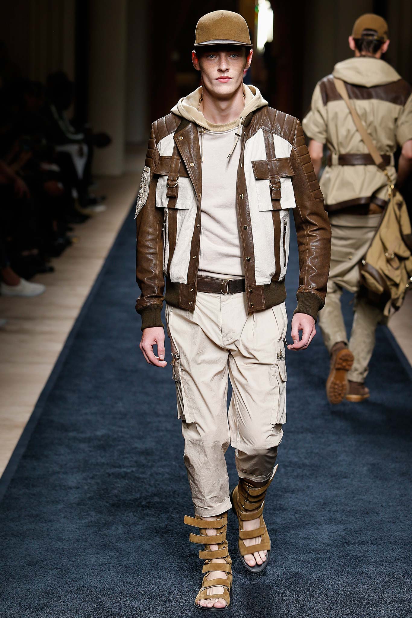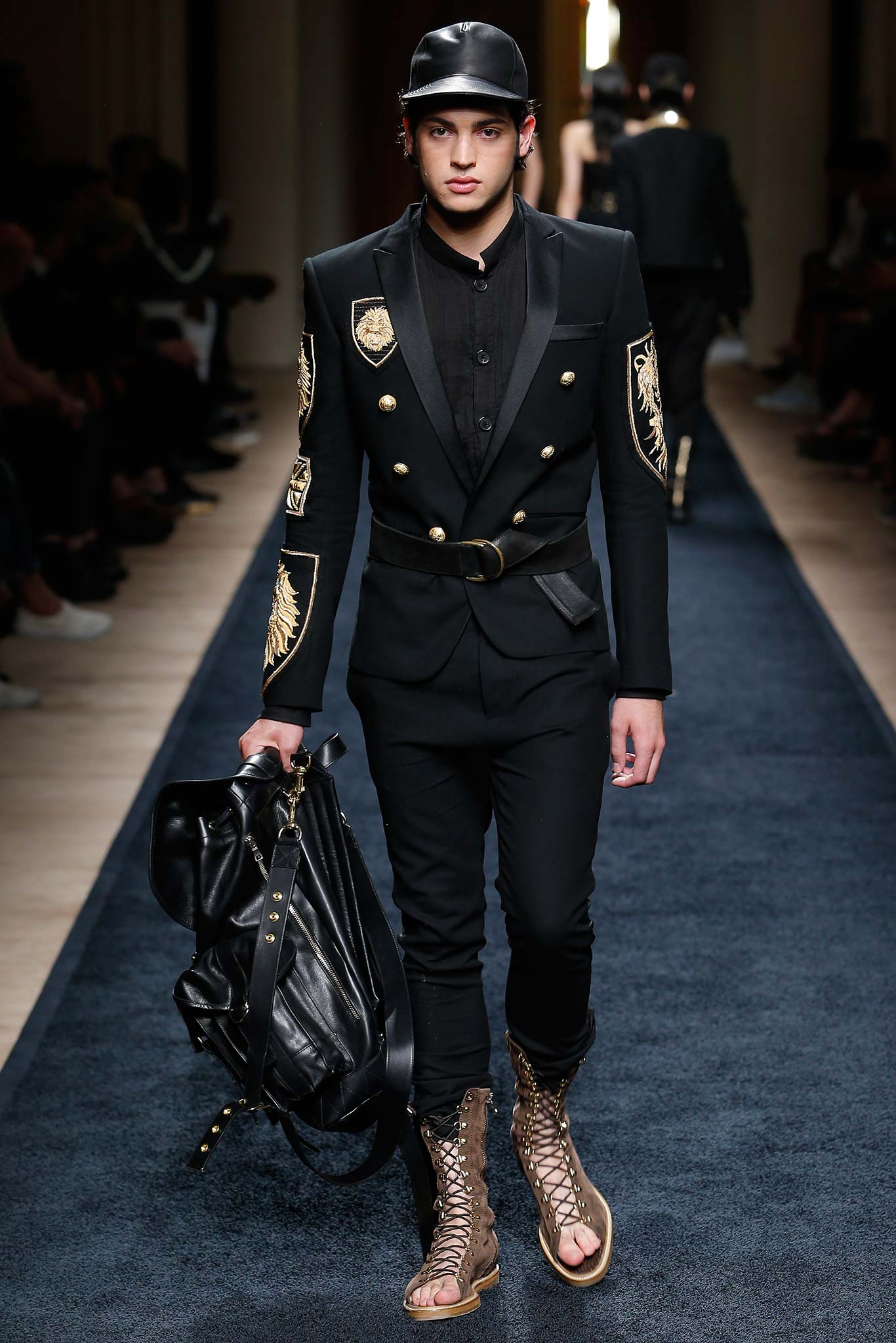 “That’s my first menswear show,” said Olivier Rousteing afterward: “And to tell you the truth, the first question that I had—more than, ‘What am I going to do as a story?’—was, ‘What is the show that I want to remember in five years? What is the Balmain man?’ And these guys are exactly like who I am—they are discovering the world, traveling as an aventurier, trying to find treasures … being a strong man discovering the world.”