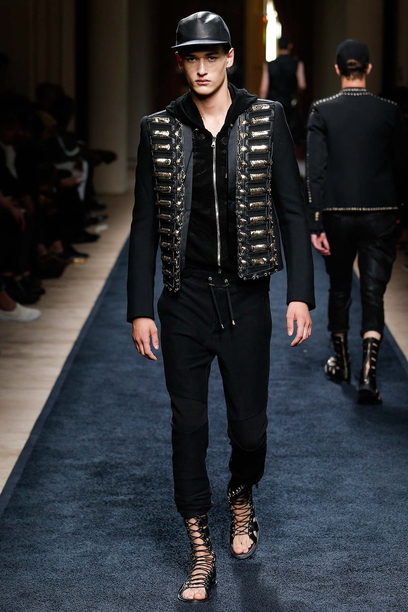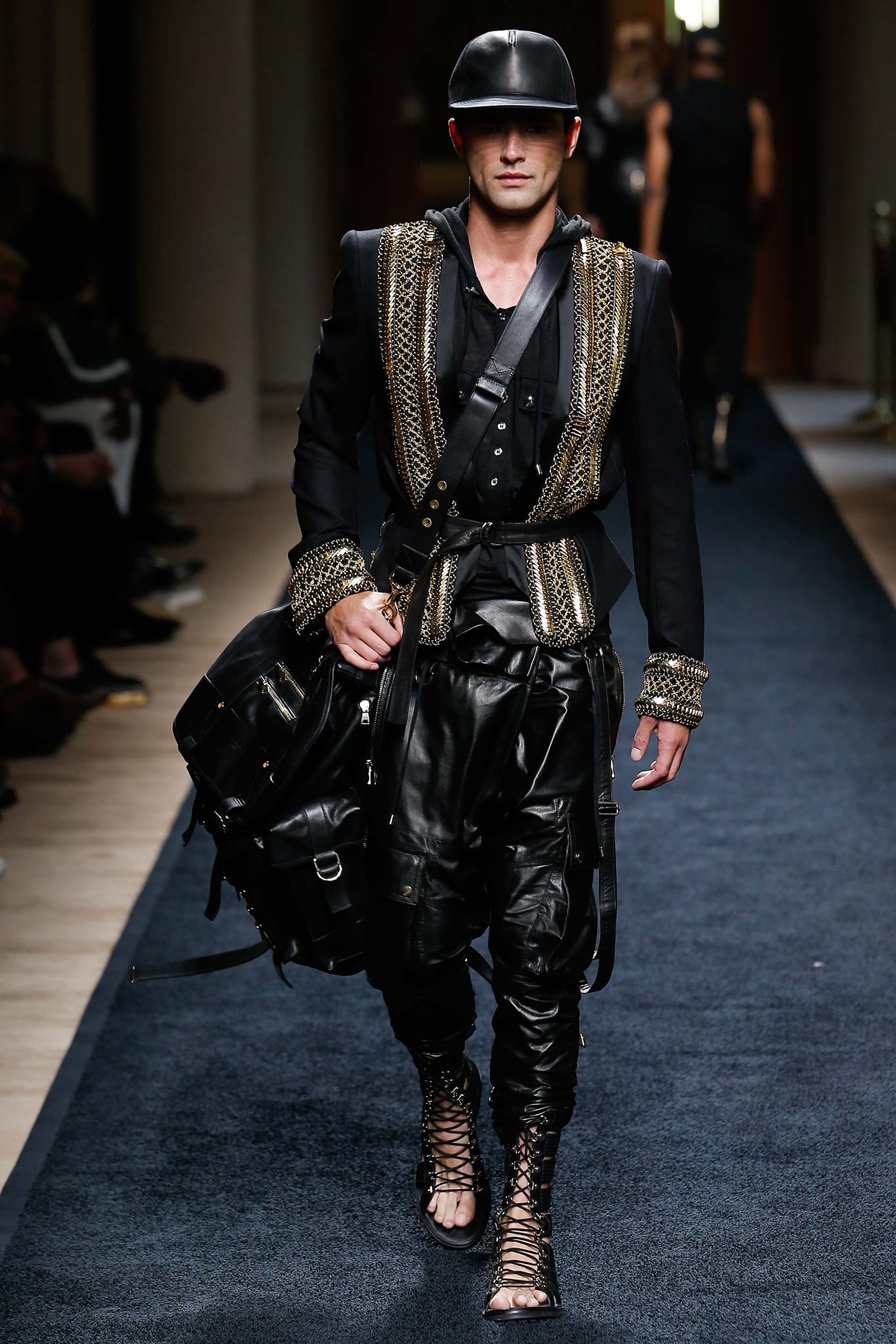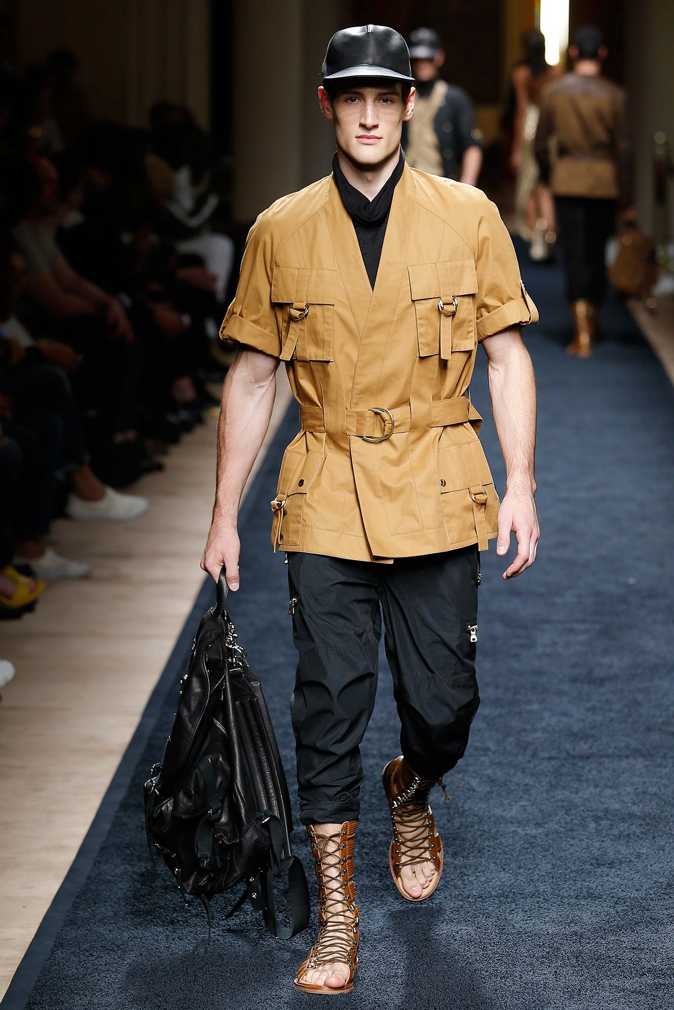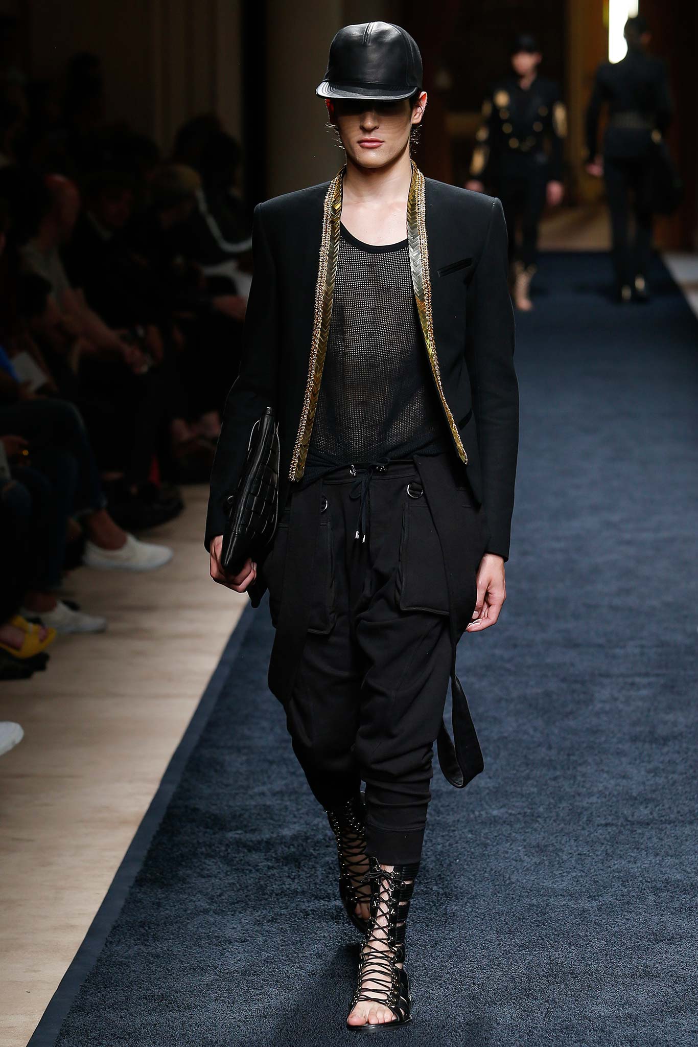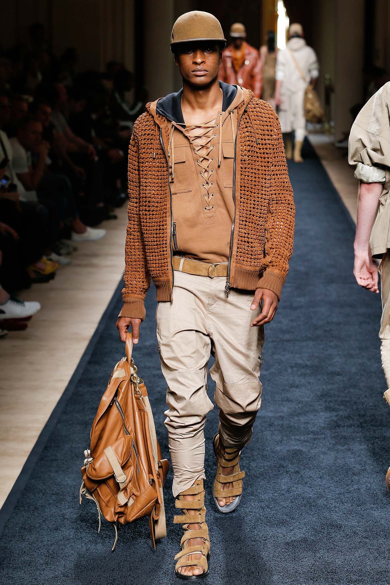 “That’s my first menswear show,” said Olivier Rousteing afterward: “And to tell you the truth, the first question that I had—more than, ‘What am I going to do as a story?’—was, ‘What is the show that I want to remember in five years? What is the Balmain man?’ And these guys are exactly like who I am—they are discovering the world, traveling as an aventurier, trying to find treasures … being a strong man discovering the world.”