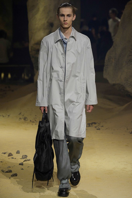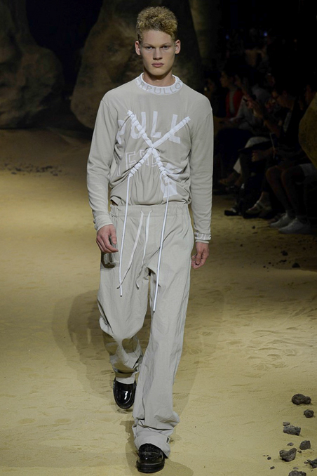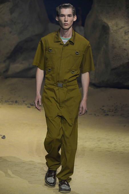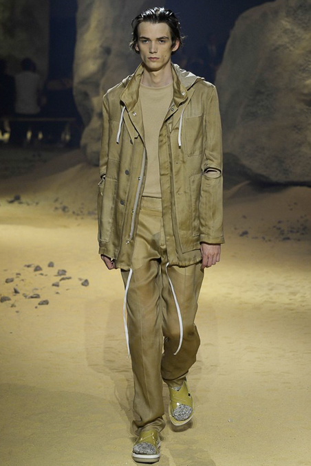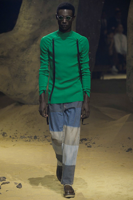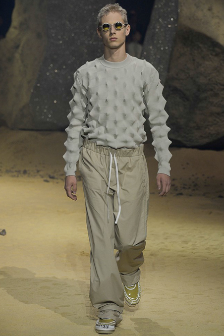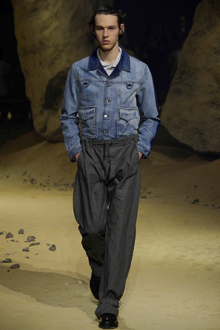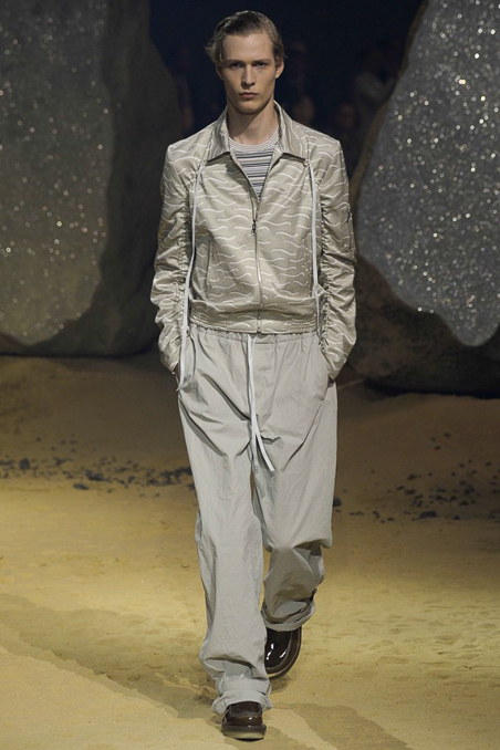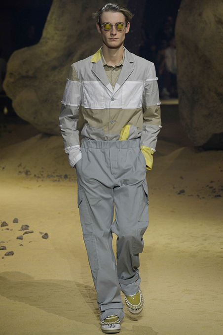 The clothes did not deliver the same kind of high, though. The sea of functional boiler suits and cargo pants threatened to drown out more innovative looks, like a jean jacket and pants streaked with various sunbleached washes, or a lunar gray suit in crinkled cotton. A tracksuit in a cactus-like 3-D knit stood out like the proverbial sore thumb.