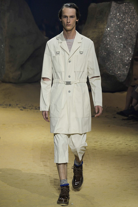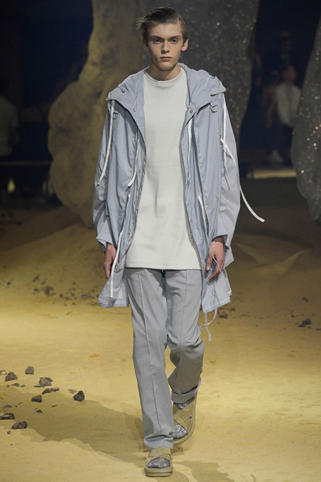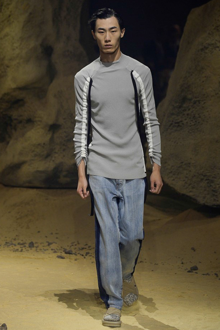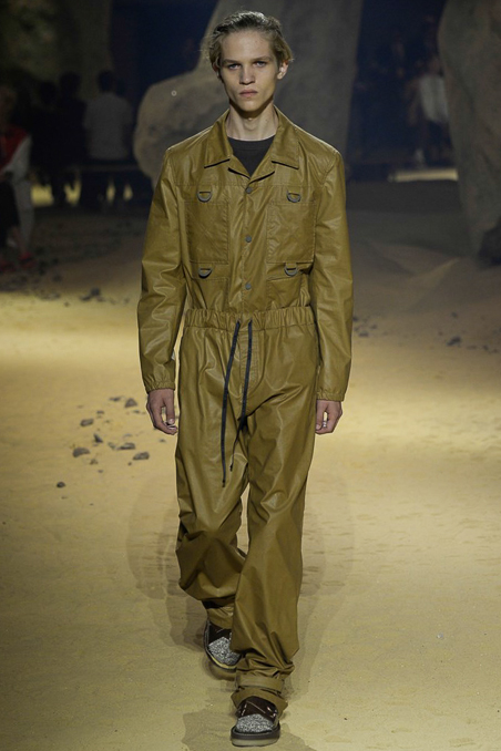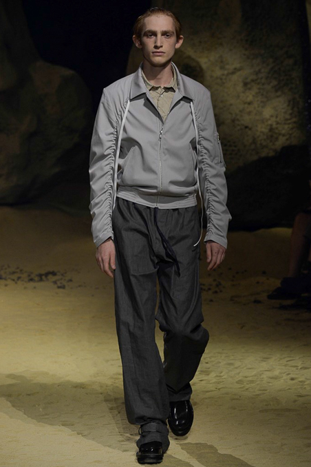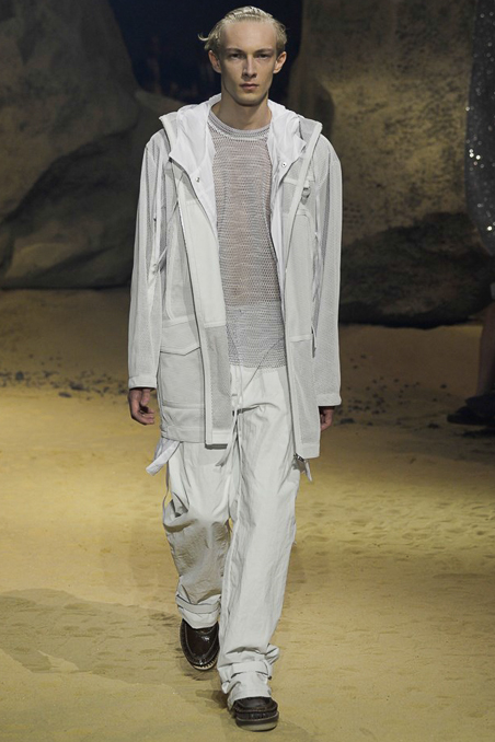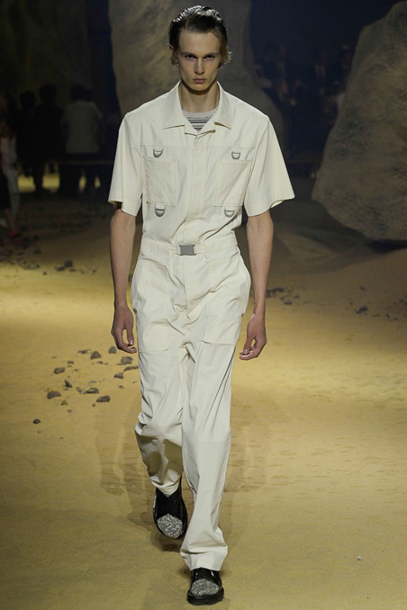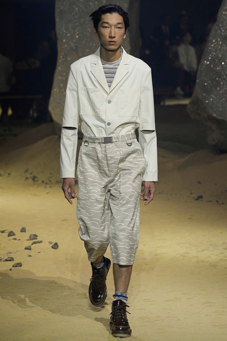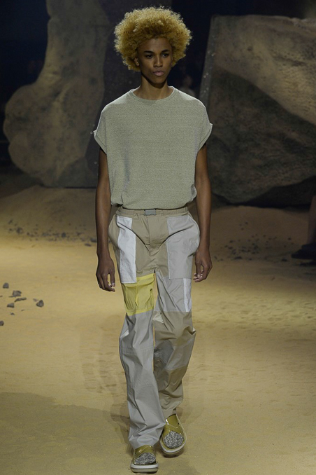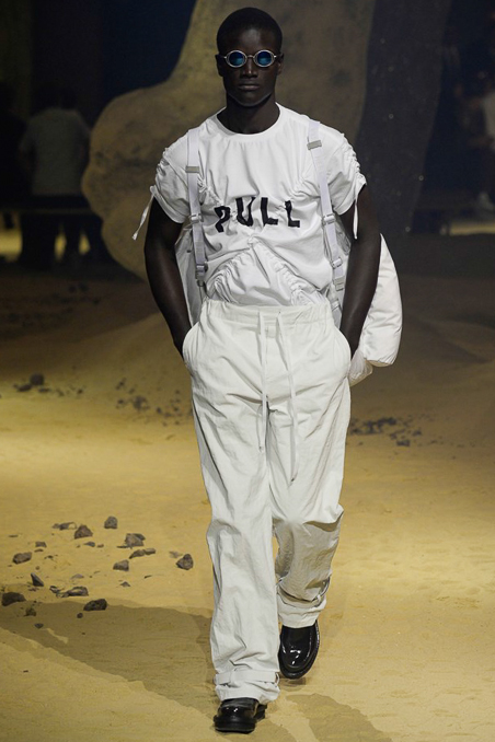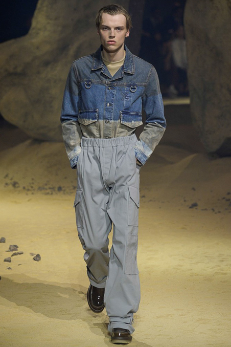 The clothes did not deliver the same kind of high, though. The sea of functional boiler suits and cargo pants threatened to drown out more innovative looks, like a jean jacket and pants streaked with various sunbleached washes, or a lunar gray suit in crinkled cotton. A tracksuit in a cactus-like 3-D knit stood out like the proverbial sore thumb.