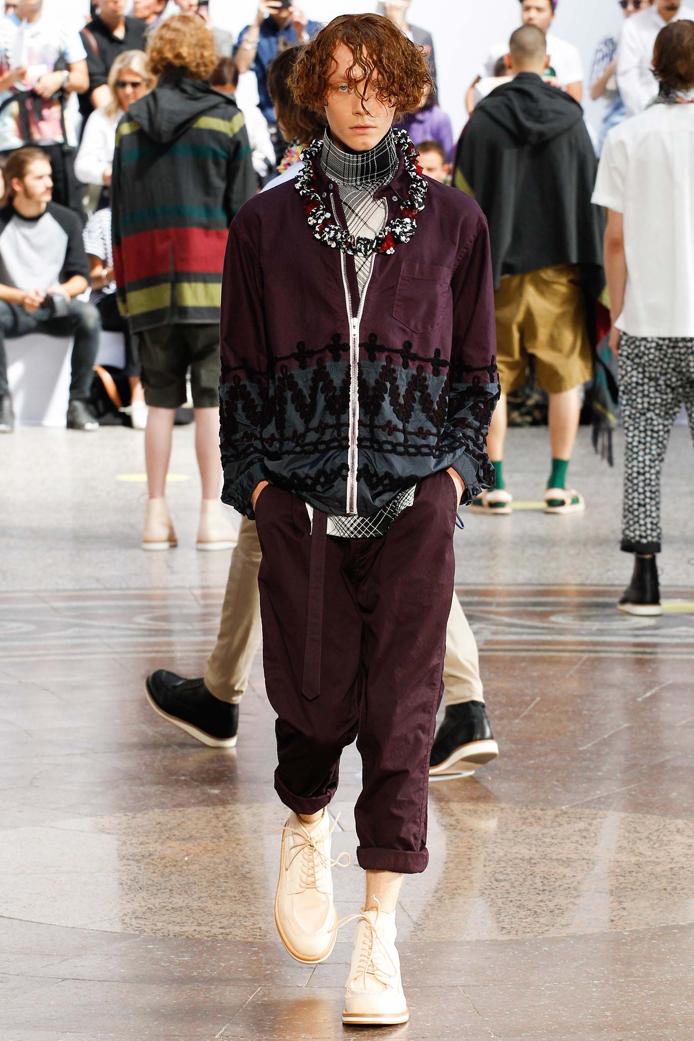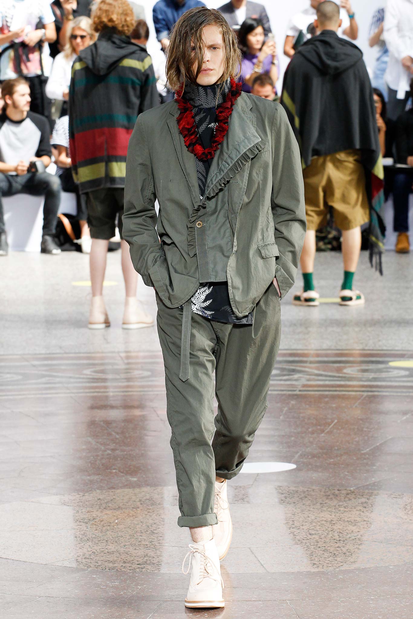 As the soundtrack layered Robin S’ “Show Me Love” with Donna Summer’s “I Feel Love,” models flashed their double-fronted leather perfectos under plaid ponchos that were cut like shirts or strolled in Peruvian-inspired knitted Bermudas and enveloping fringed scarves that were matched with rigid military parkas. Tropical prints on silky pajama shirts and drop-crotch pants proved a surprisingly symbiotic alliance with quilted mesh or checked stadium jackets.