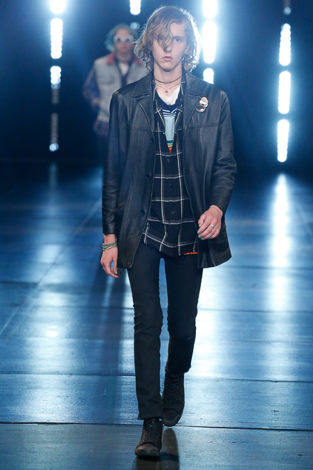 Saint Laurent Menswear Spring Summer 2016 in Paris Fashion Week, ending a beautiful and fascinated week Hedi Slimane closed the PFW with ode to Nirvana 90s looks, rock depressed killers look, leather pants and outstanding jackets gives everybody who lived in that era flashback about your red squares old vintage shirt. Metallic trousers, big glasses, leopard prints bomber jackets all mixed up with a square red shirts.