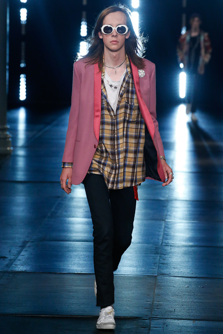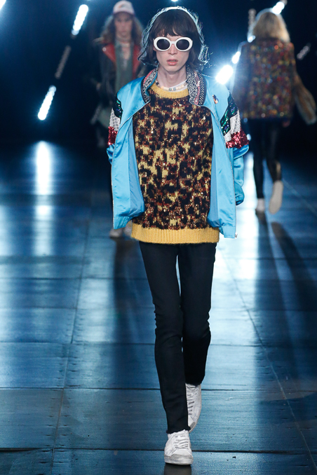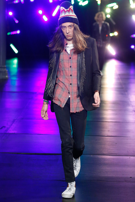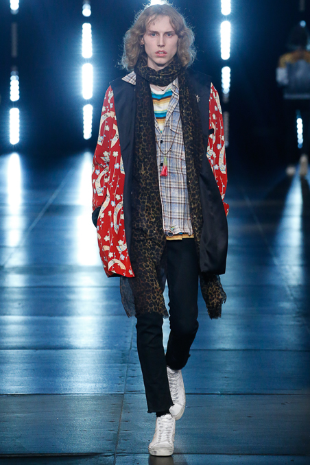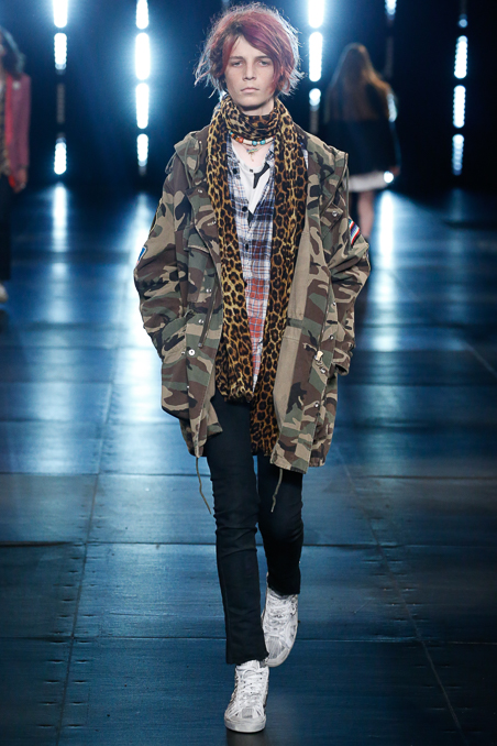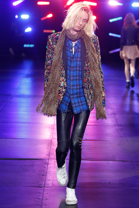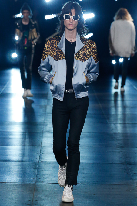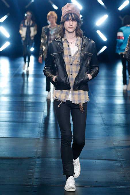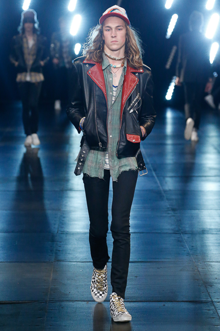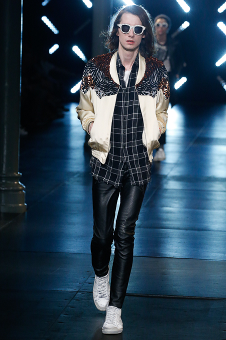 Saint Laurent Menswear Spring Summer 2016 in Paris Fashion Week, ending a beautiful and fascinated week Hedi Slimane closed the PFW with ode to Nirvana 90s looks, rock depressed killers look, leather pants and outstanding jackets gives everybody who lived in that era flashback about your red squares old vintage shirt. Metallic trousers, big glasses, leopard prints bomber jackets all mixed up with a square red shirts.
