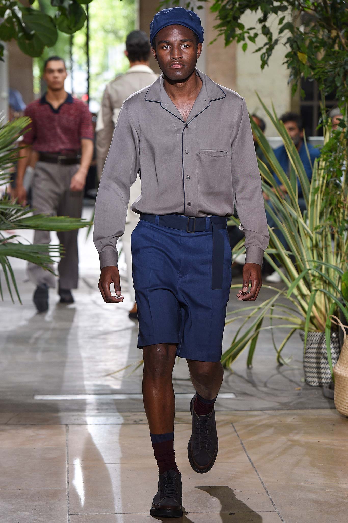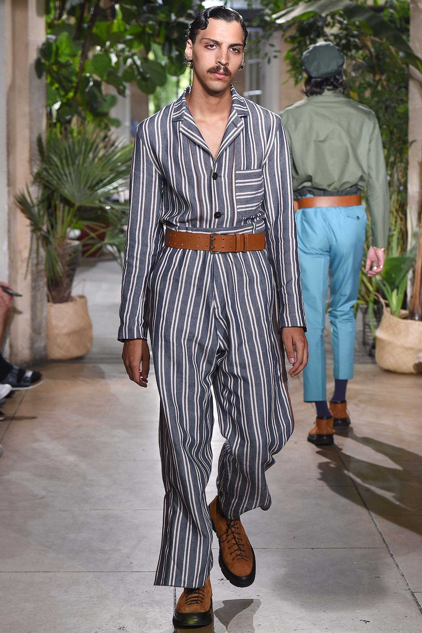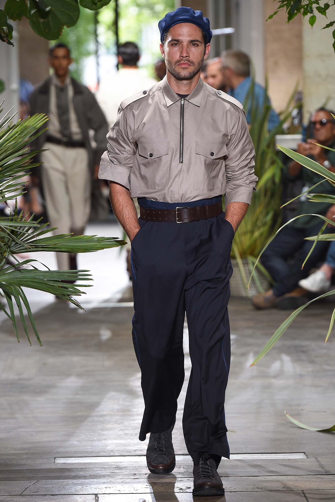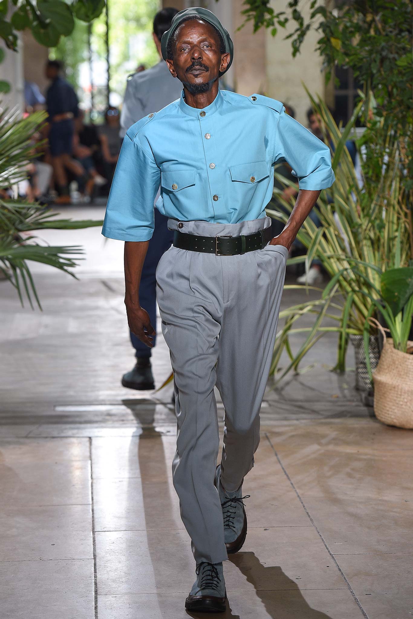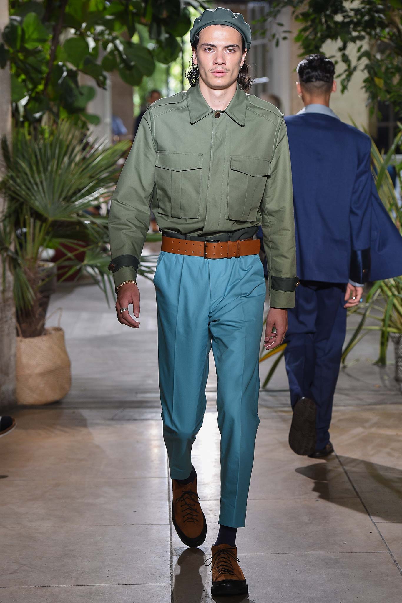 Color-wise, Benan tweaked the hues just enough to make them stand out and pop in a uniform line-up, seeming larger-than-life for their vividness. That was an apt way of viewing his work as a whole, relying heavily on the dichotomy between formalized garments (in this case, the dignity building uniform, as Rick Owens pointed out earlier this week) and leisure wear. Tracksuit bottoms in army green suede don’t get any lusher than this.