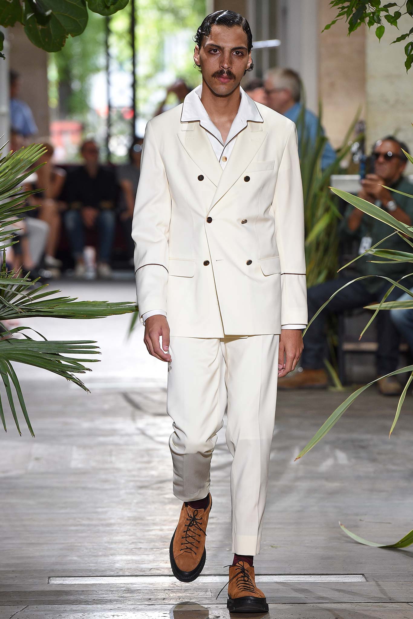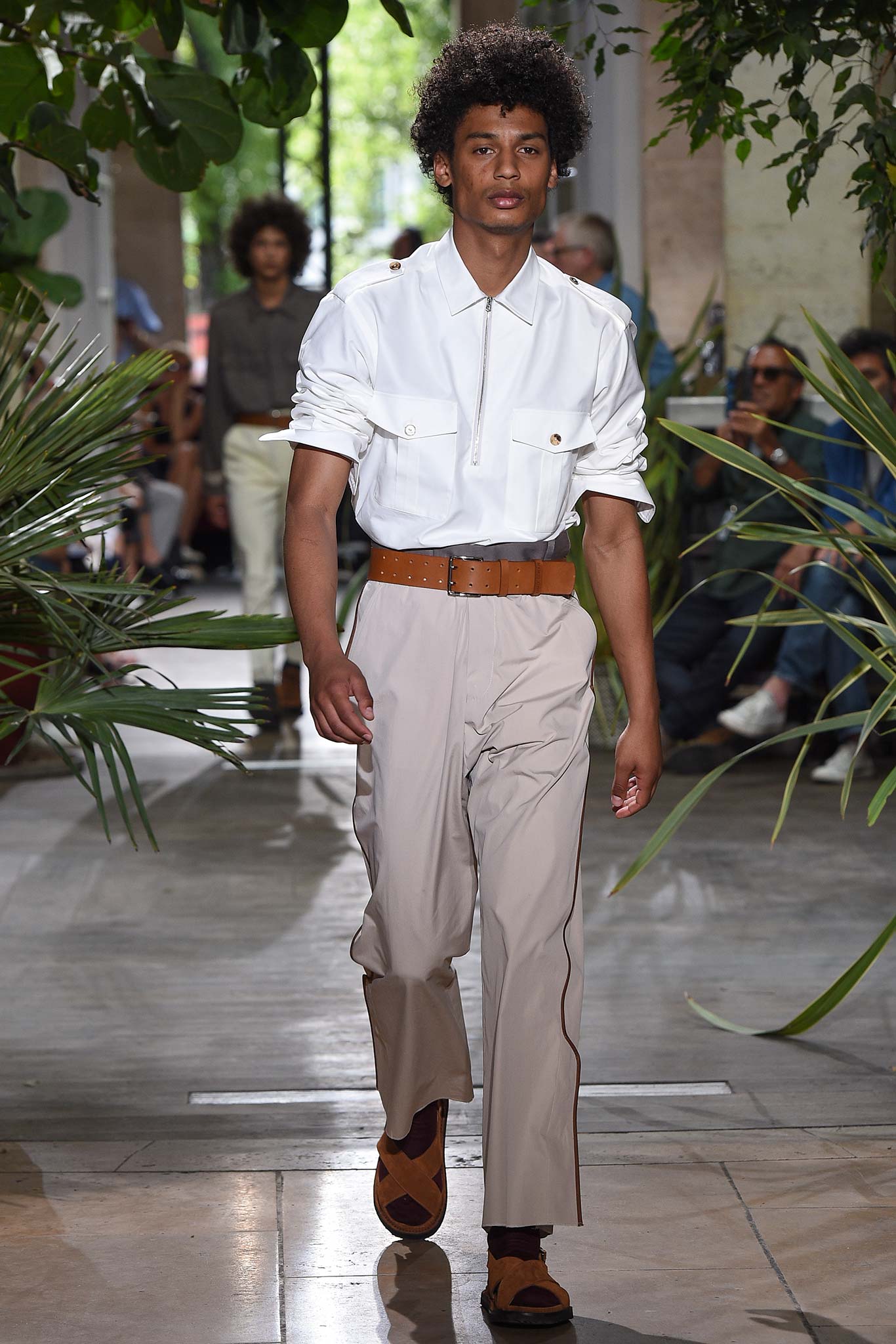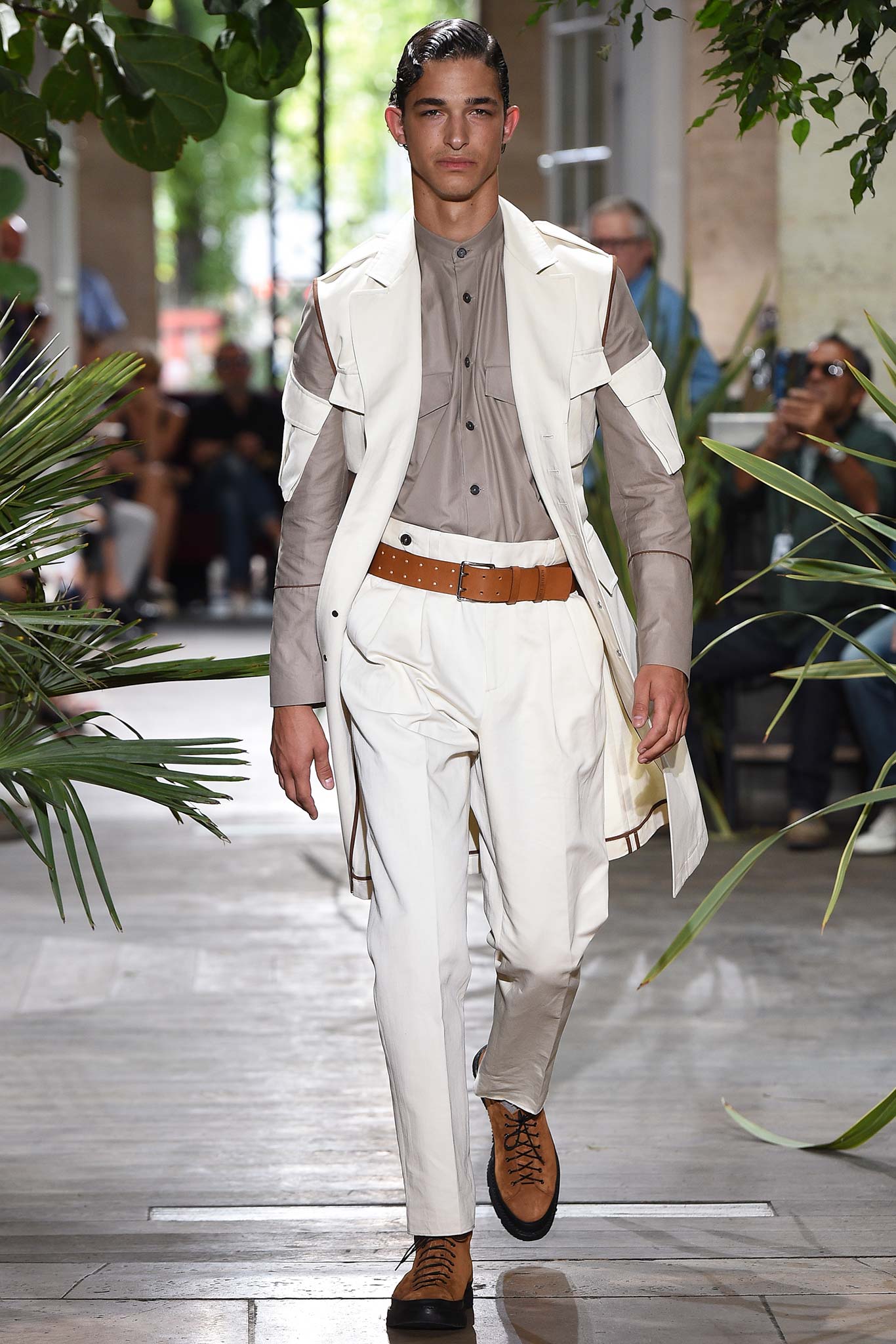 Benan is no slouch in the tailoring department, which makes, say, a jacket look good even when pushed up at the arms. Or when a belt comes to cinch the waist of oversize army pants into a paperbag waist. American smoothness – wide shirt collars laid flat against jacket lapels, opening the neck wide to show that oft-overlooked sensual clavicle. Whip away the foulards they were styled with and you go from valor to “que calor.” And the silk battle dress looked suspiciously like a cop-out by a canny brass in order to maximize downtime. A man’s gotta have dignity, even when going from the bedroom to the war room.
