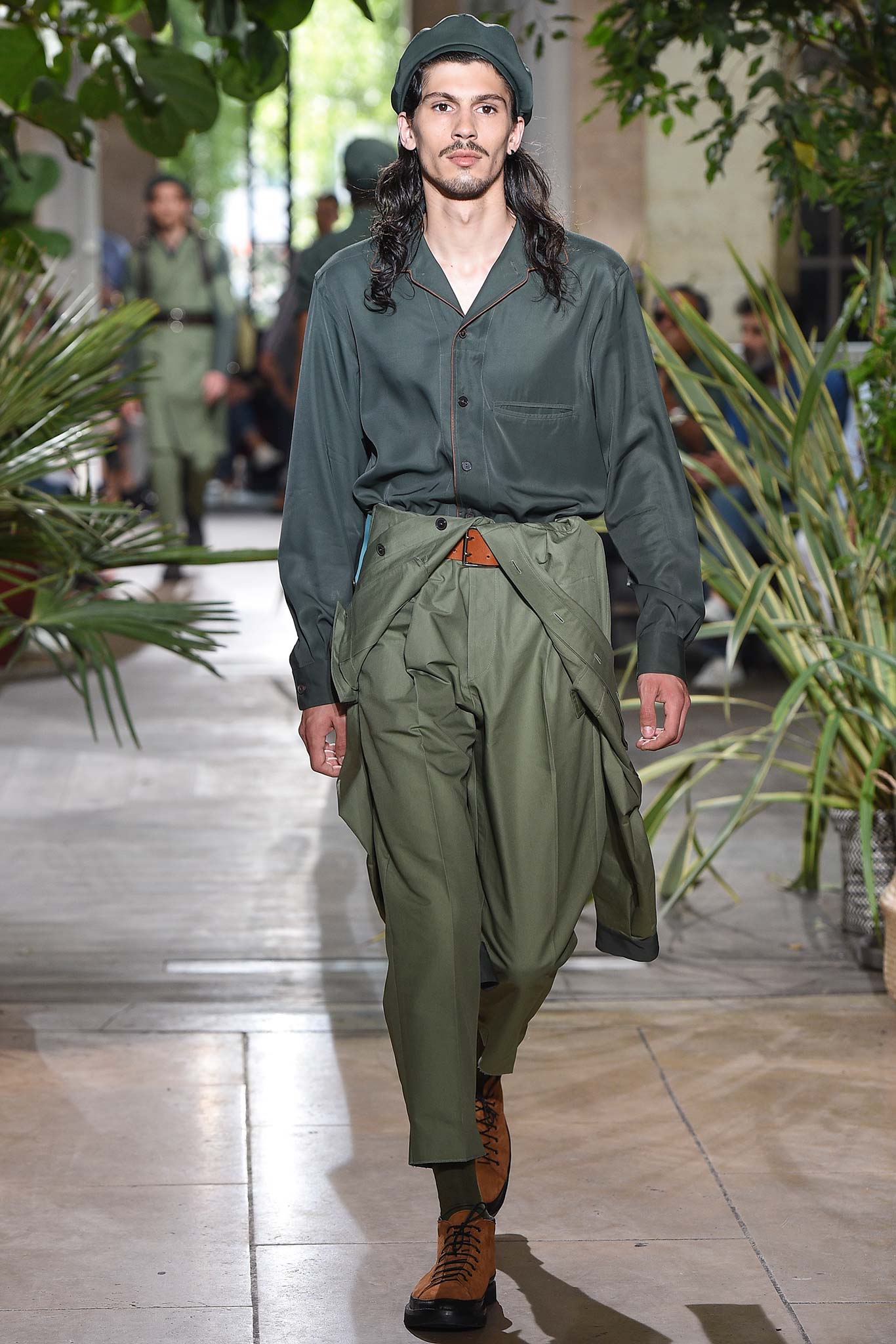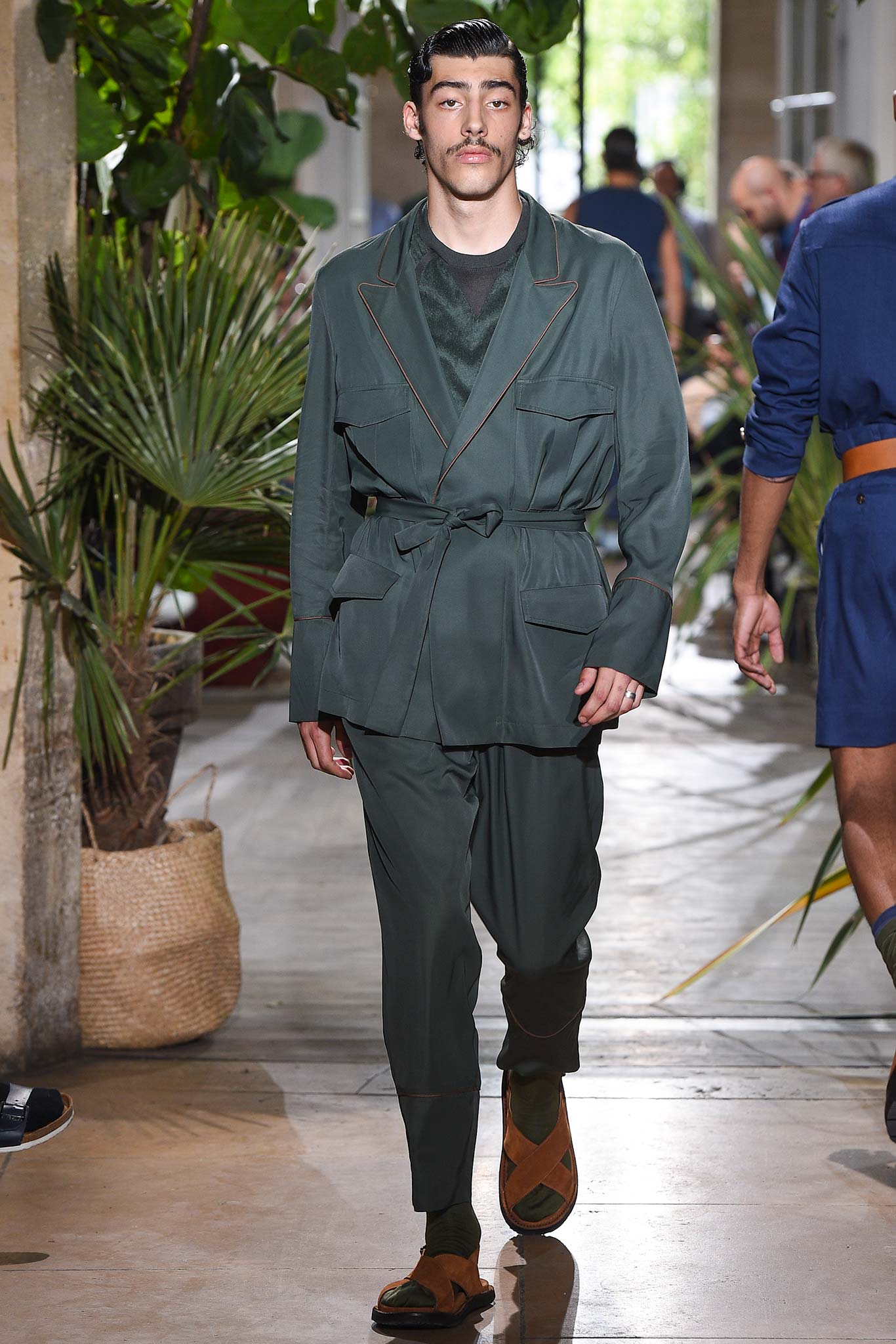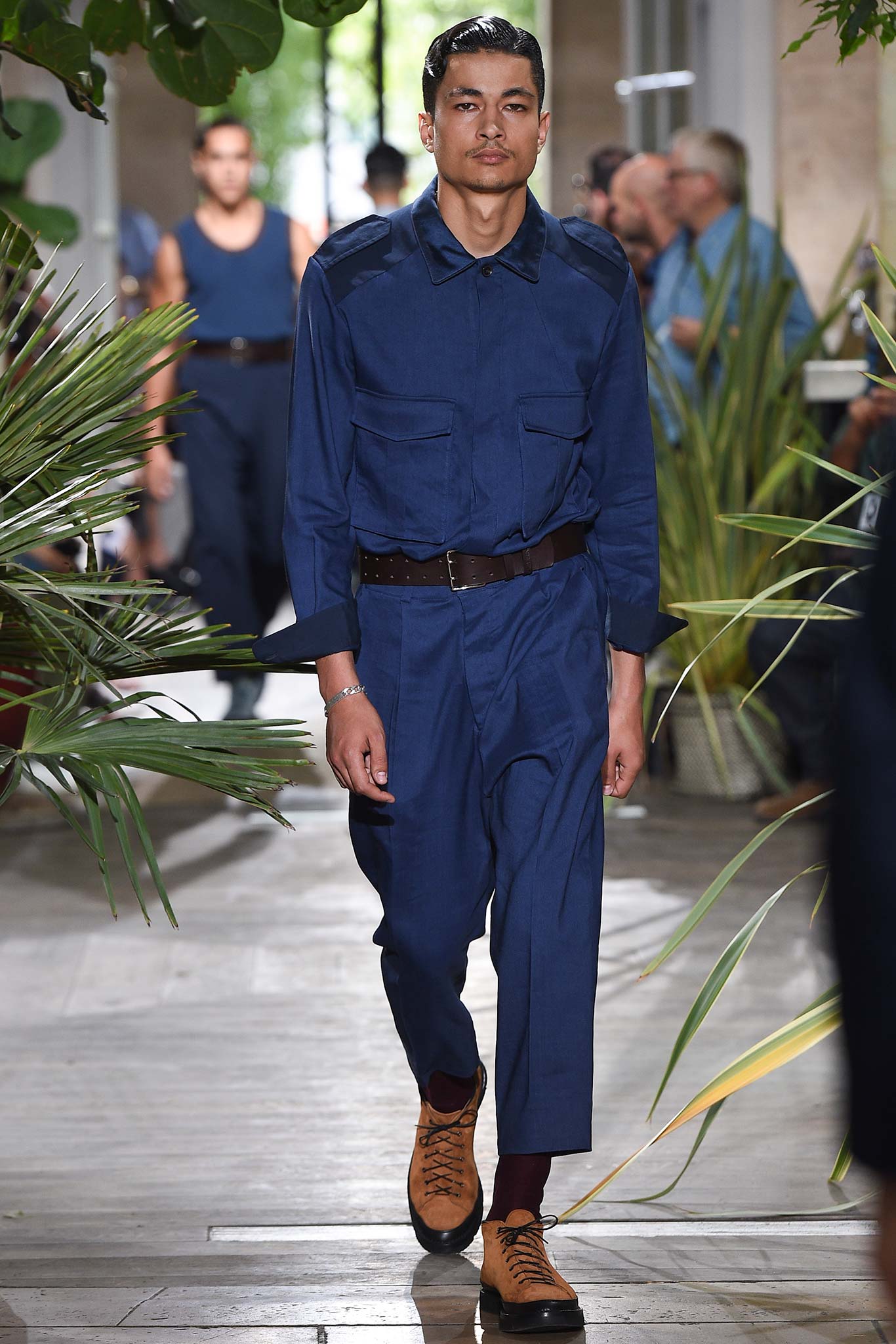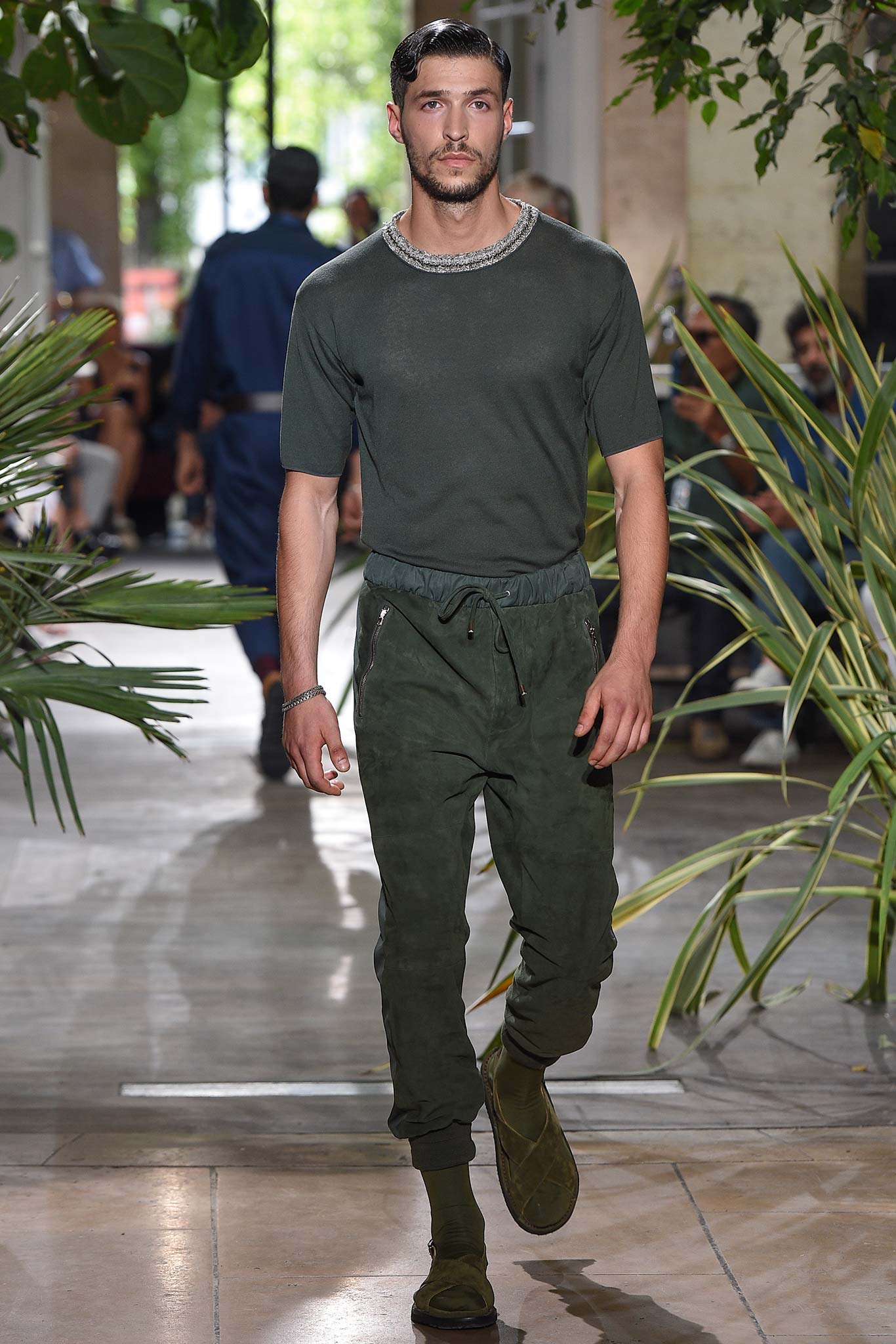 Color-wise, Benan tweaked the hues just enough to make them stand out and pop in a uniform line-up, seeming larger-than-life for their vividness. That was an apt way of viewing his work as a whole, relying heavily on the dichotomy between formalized garments (in this case, the dignity building uniform, as Rick Owens pointed out earlier this week) and leisure wear. Tracksuit bottoms in army green suede don’t get any lusher than this.