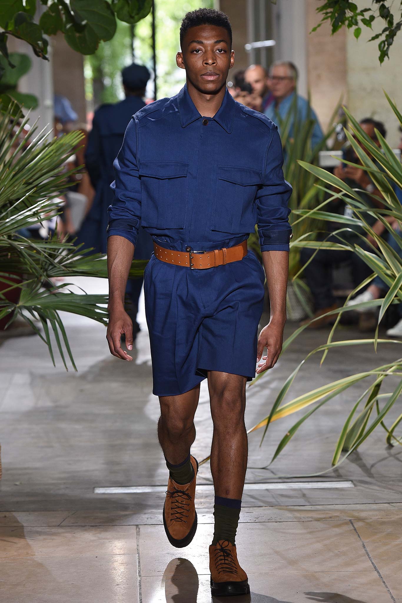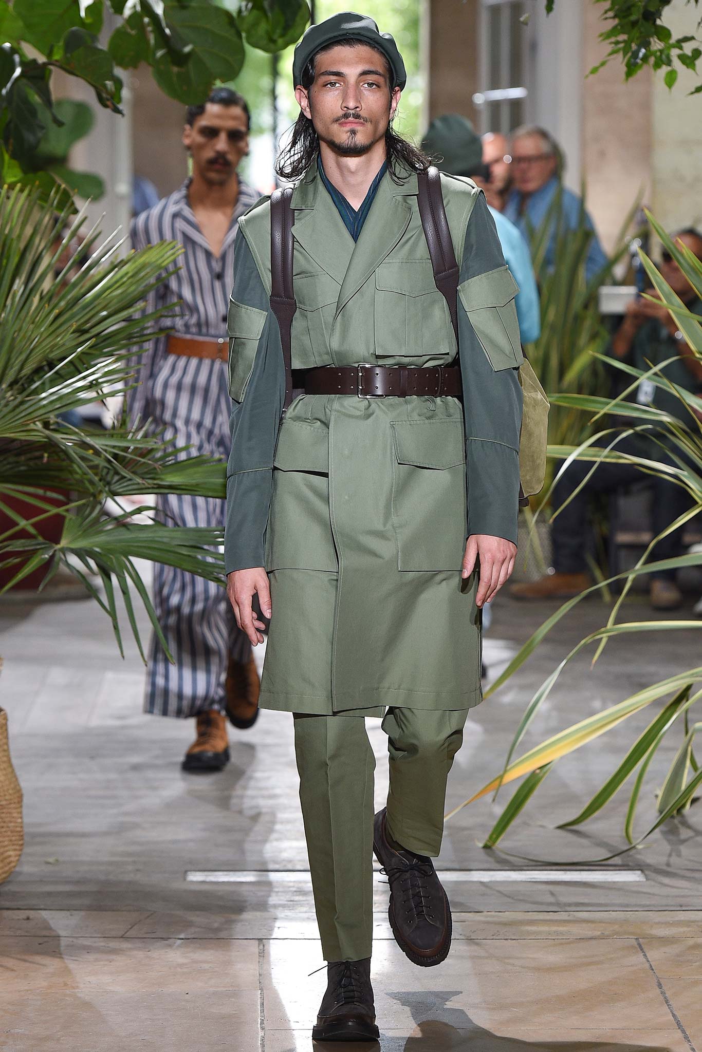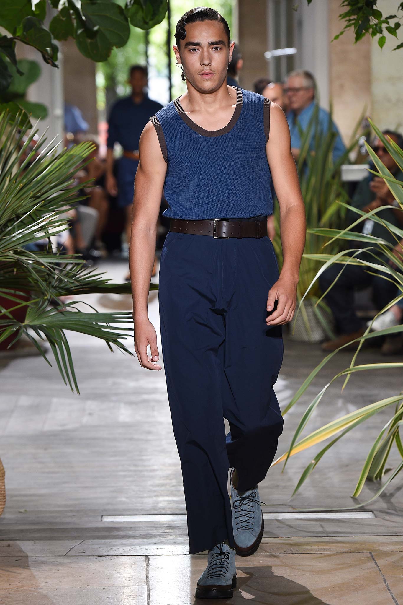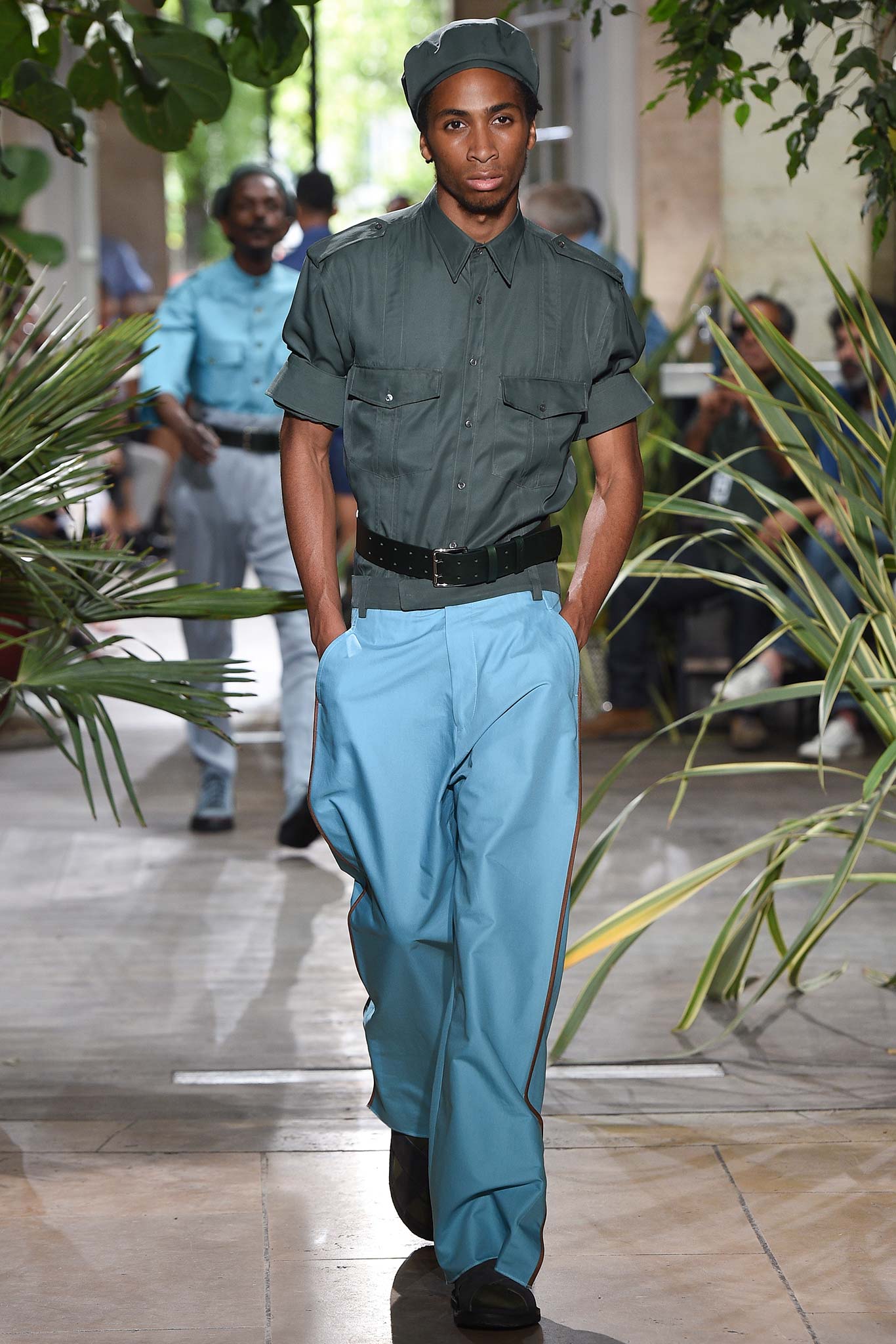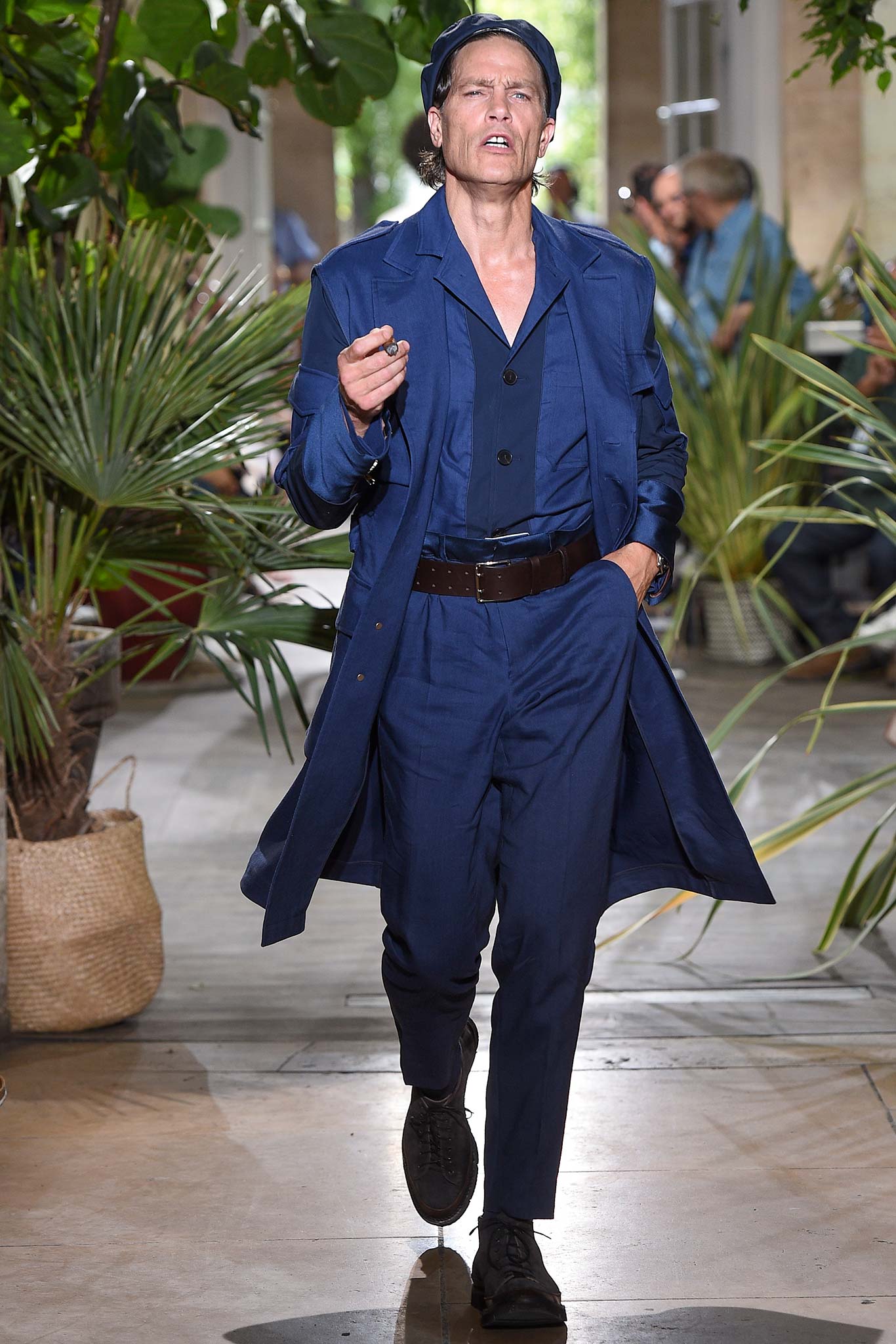 Color-wise, Benan tweaked the hues just enough to make them stand out and pop in a uniform line-up, seeming larger-than-life for their vividness. That was an apt way of viewing his work as a whole, relying heavily on the dichotomy between formalized garments (in this case, the dignity building uniform, as Rick Owens pointed out earlier this week) and leisure wear. Tracksuit bottoms in army green suede don’t get any lusher than this.