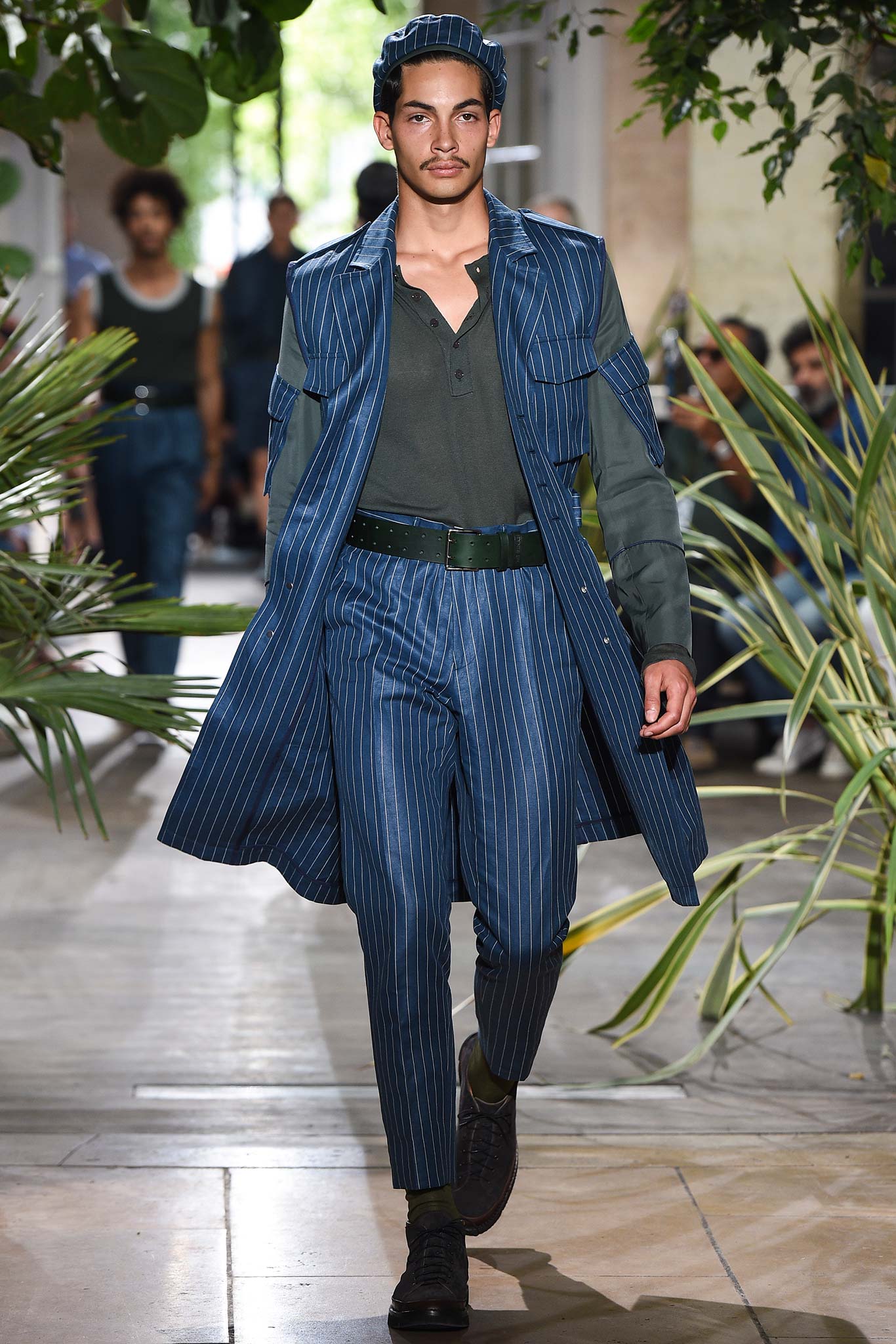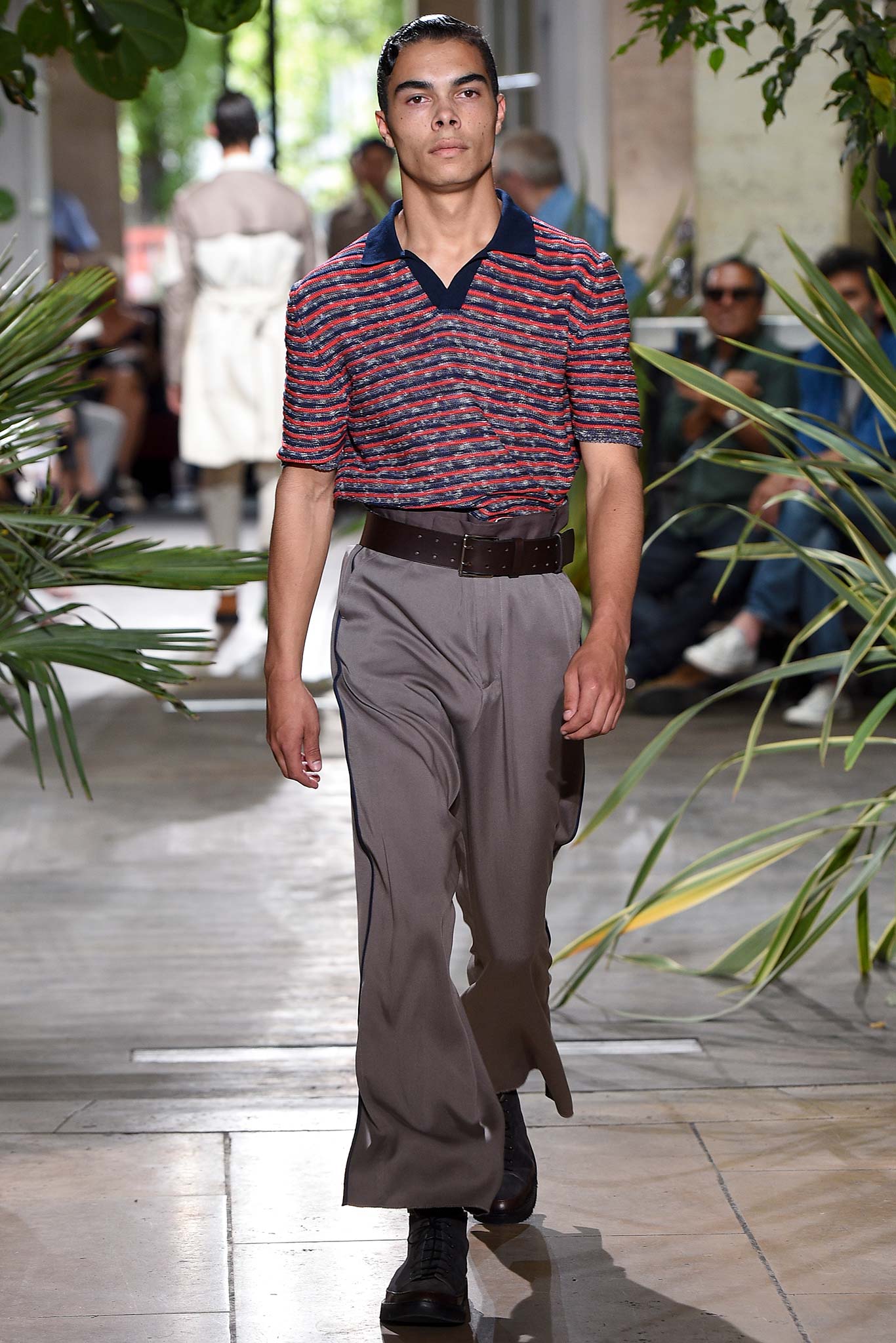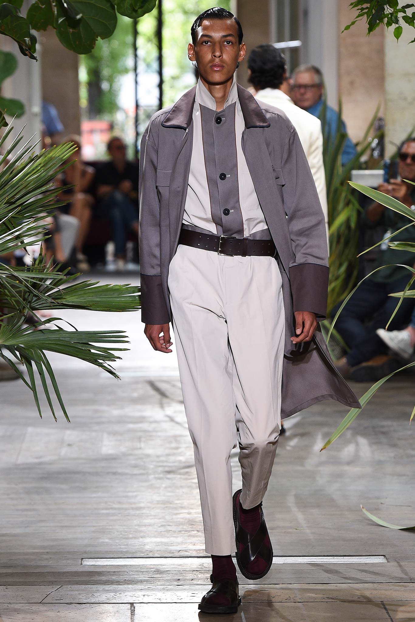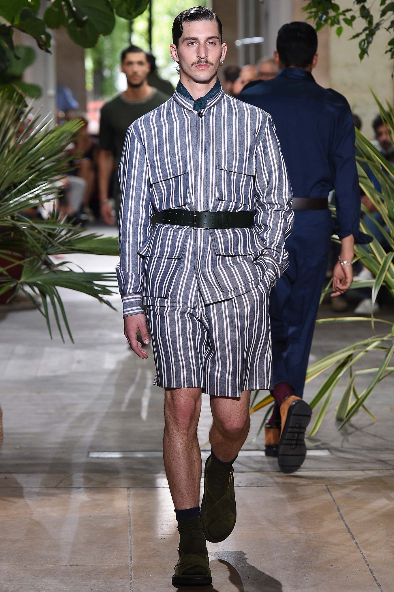 Color-wise, Benan tweaked the hues just enough to make them stand out and pop in a uniform line-up, seeming larger-than-life for their vividness. That was an apt way of viewing his work as a whole, relying heavily on the dichotomy between formalized garments (in this case, the dignity building uniform, as Rick Owens pointed out earlier this week) and leisure wear. Tracksuit bottoms in army green suede don’t get any lusher than this.