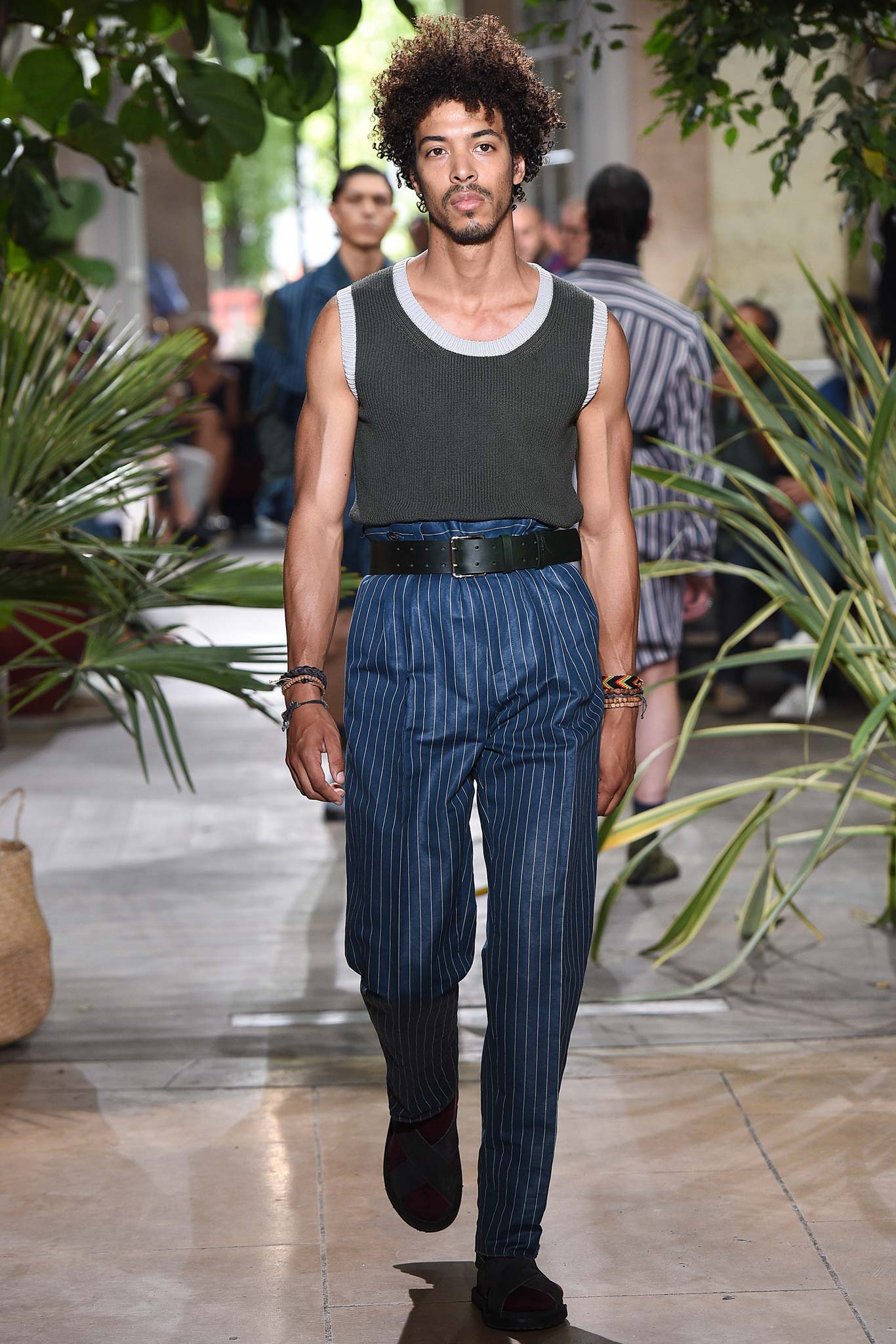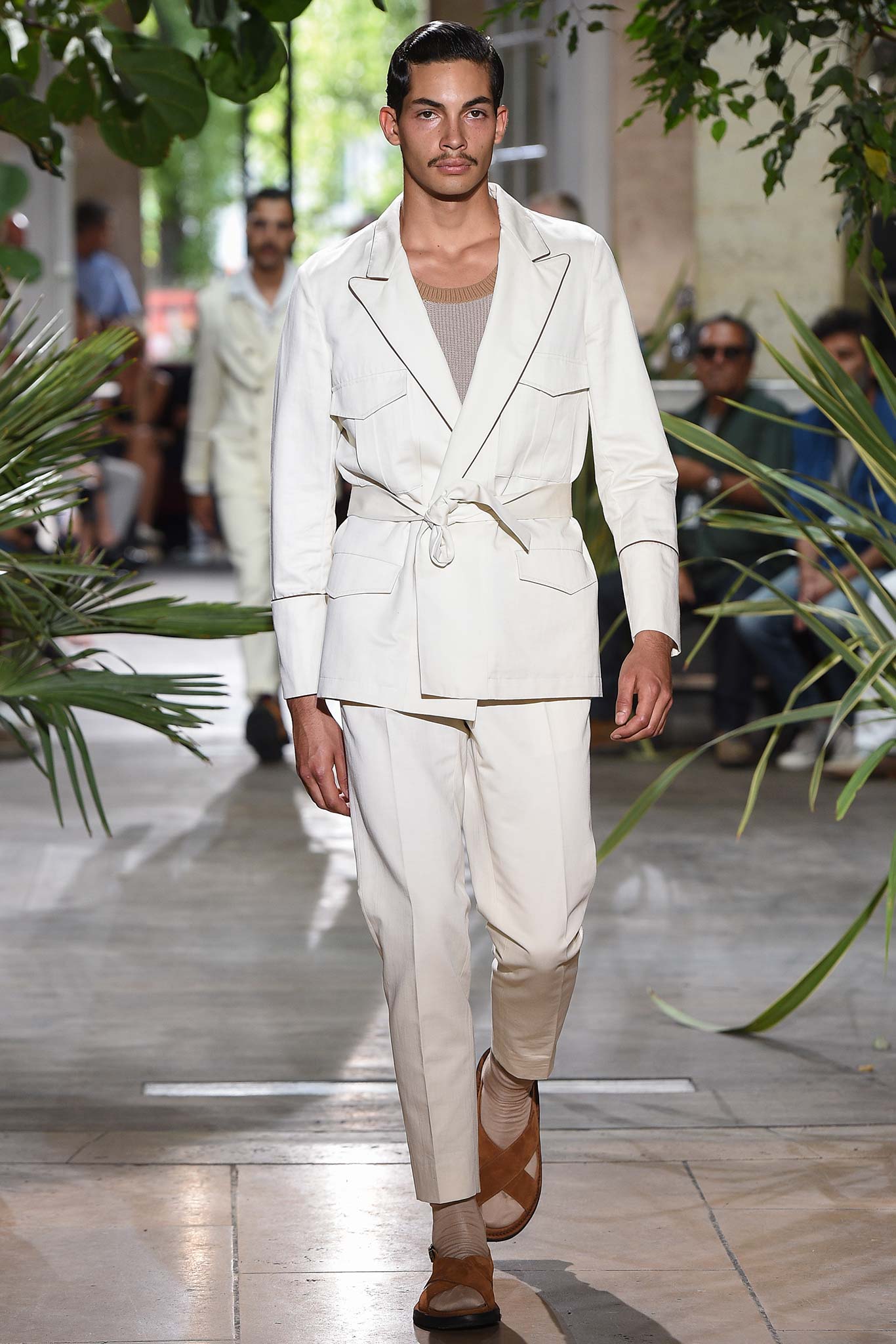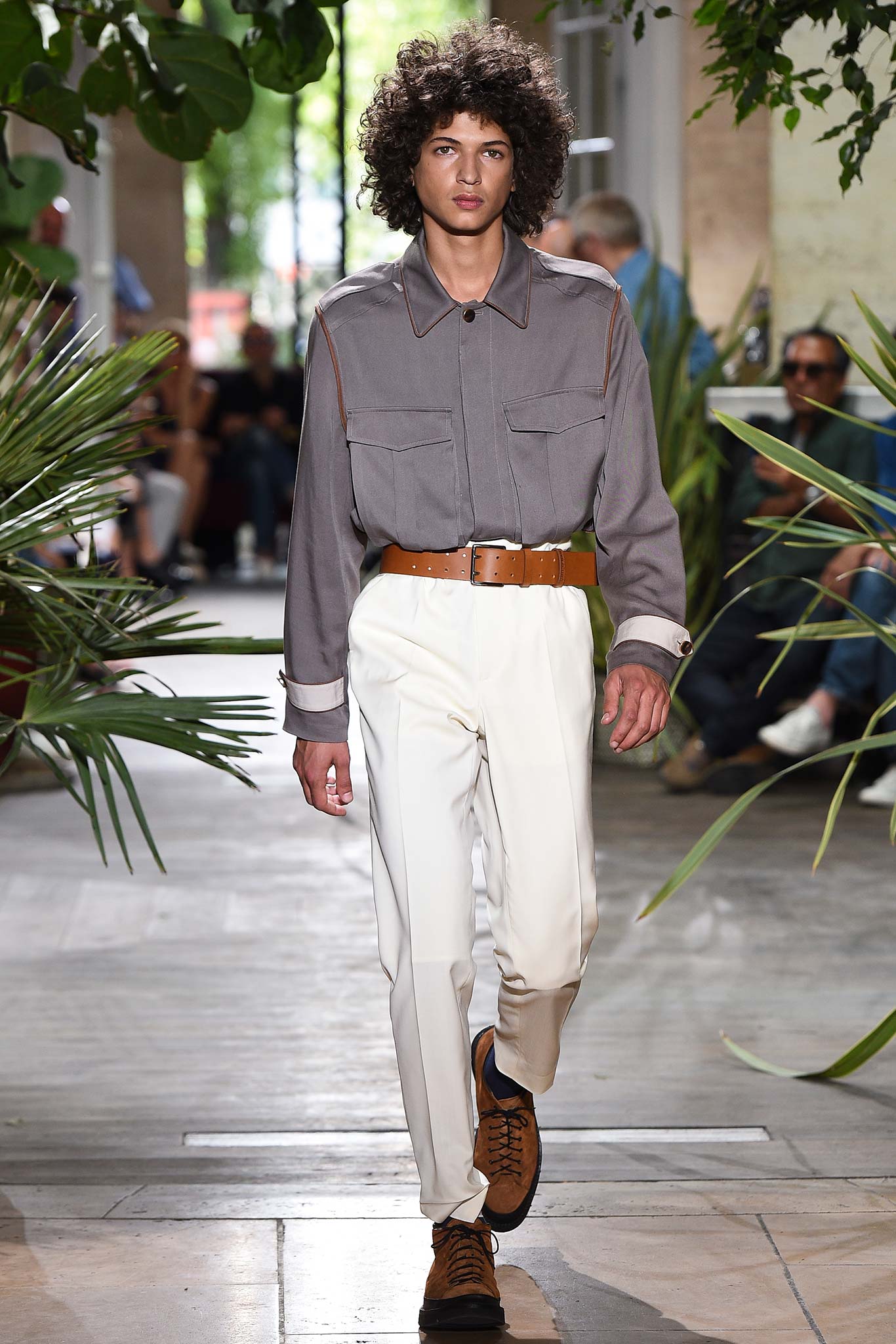 Benan is no slouch in the tailoring department, which makes, say, a jacket look good even when pushed up at the arms. Or when a belt comes to cinch the waist of oversize army pants into a paperbag waist. American smoothness – wide shirt collars laid flat against jacket lapels, opening the neck wide to show that oft-overlooked sensual clavicle. Whip away the foulards they were styled with and you go from valor to “que calor.” And the silk battle dress looked suspiciously like a cop-out by a canny brass in order to maximize downtime. A man’s gotta have dignity, even when going from the bedroom to the war room.