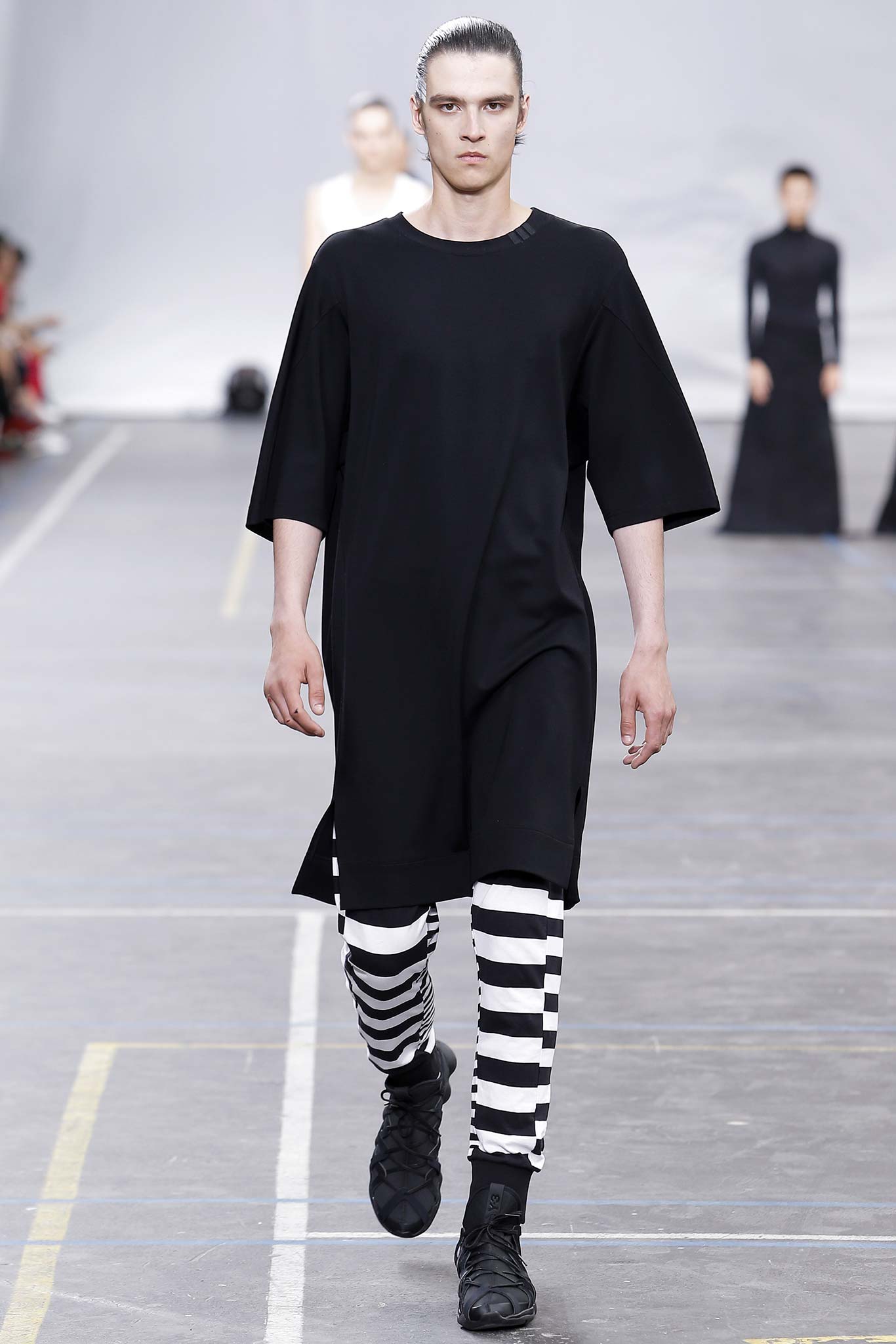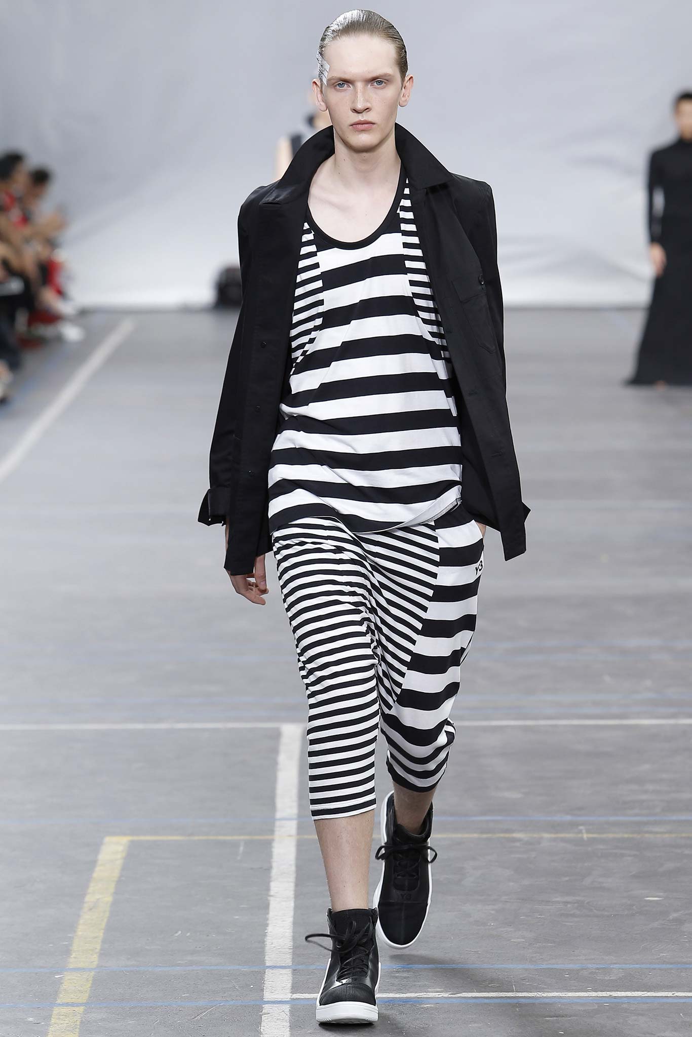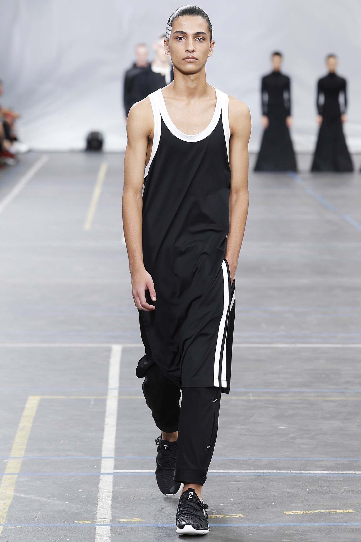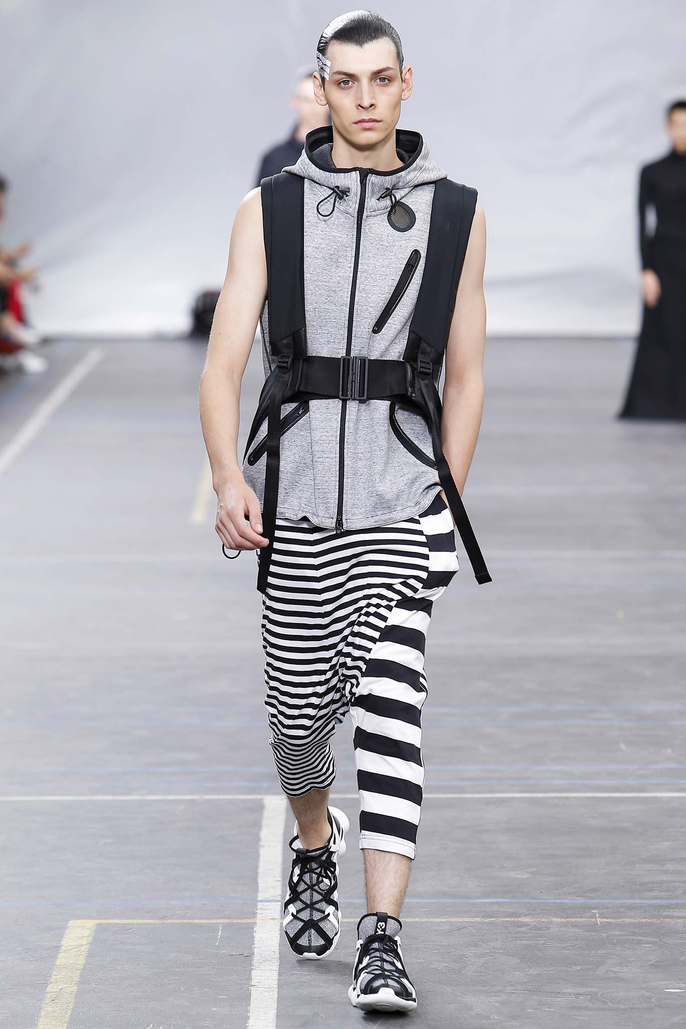The minimal and dark Menswear collection from fashion designer Yohji Yamamoto in its alter ego of Y-3 Spring/Summer 2016 , exploring arquitech stripes, beautiful colorful fluid patterns and stunning collection by Mister Yamamoto.