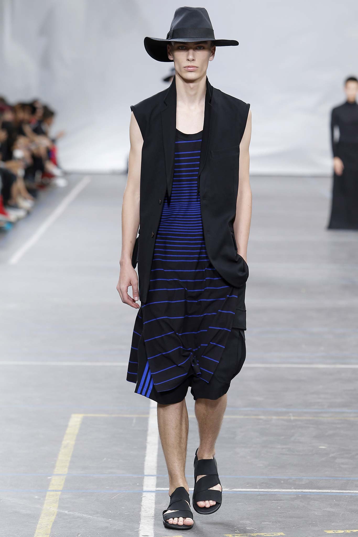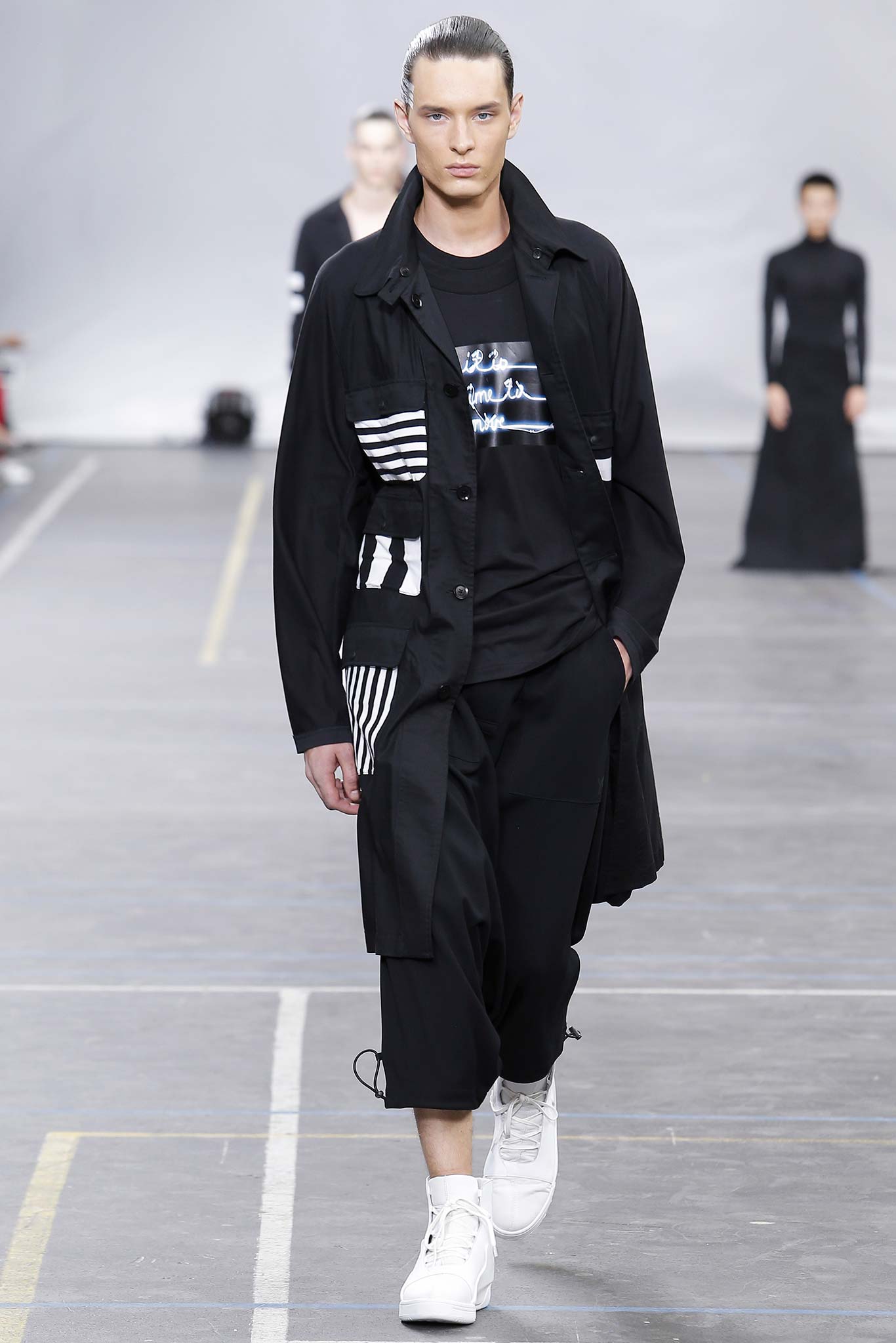 The minimal and dark Menswear collection from fashion designer Yohji Yamamoto in its alter ego of Y-3 Spring/Summer 2016 , exploring arquitech stripes, beautiful colorful fluid patterns and stunning collection by Mister Yamamoto.