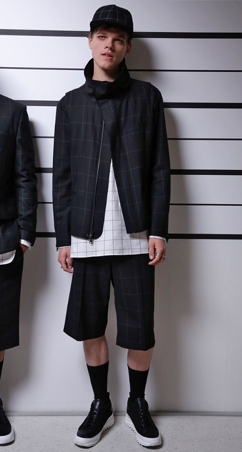 A windowpane grouping included a classic bomber over an elongated pullover shirt and shorts tailored below the knee.