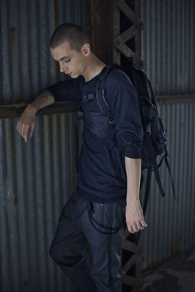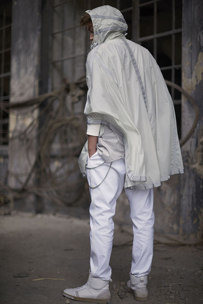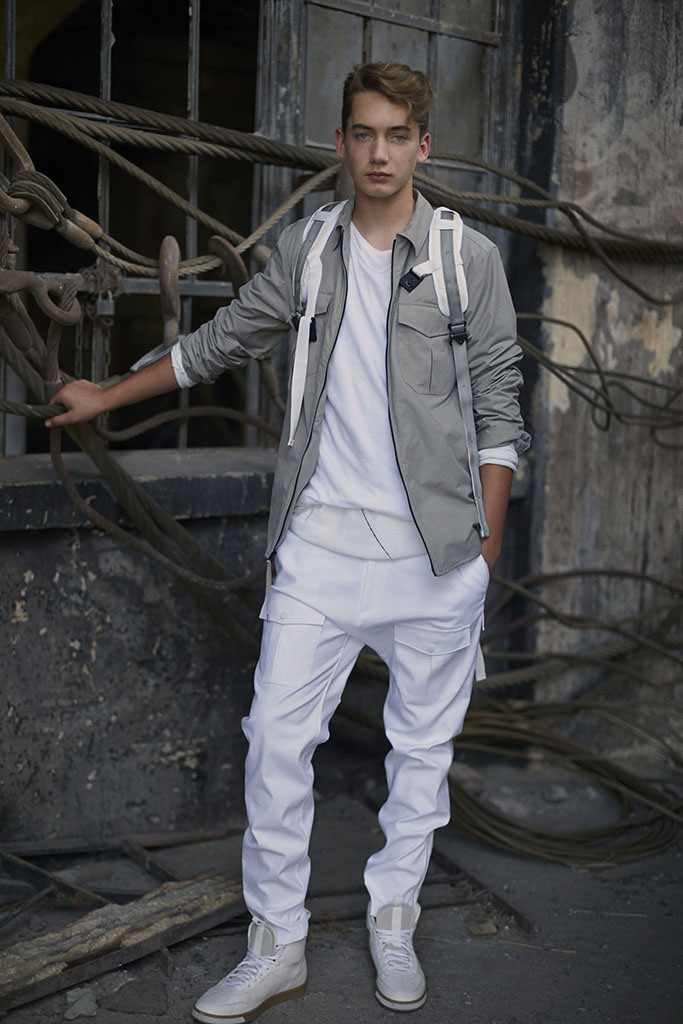 The duo styled the line in a “bike messenger way,” offering up bombers and lightweight nylon rucksacks, military-inspired parkas, cargo pants and a variety of cotton twill track pants. Their heritage in British tailoring was also evident in the cotton-linen blazers and classic field jackets.
