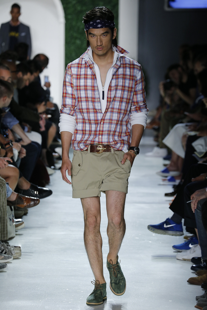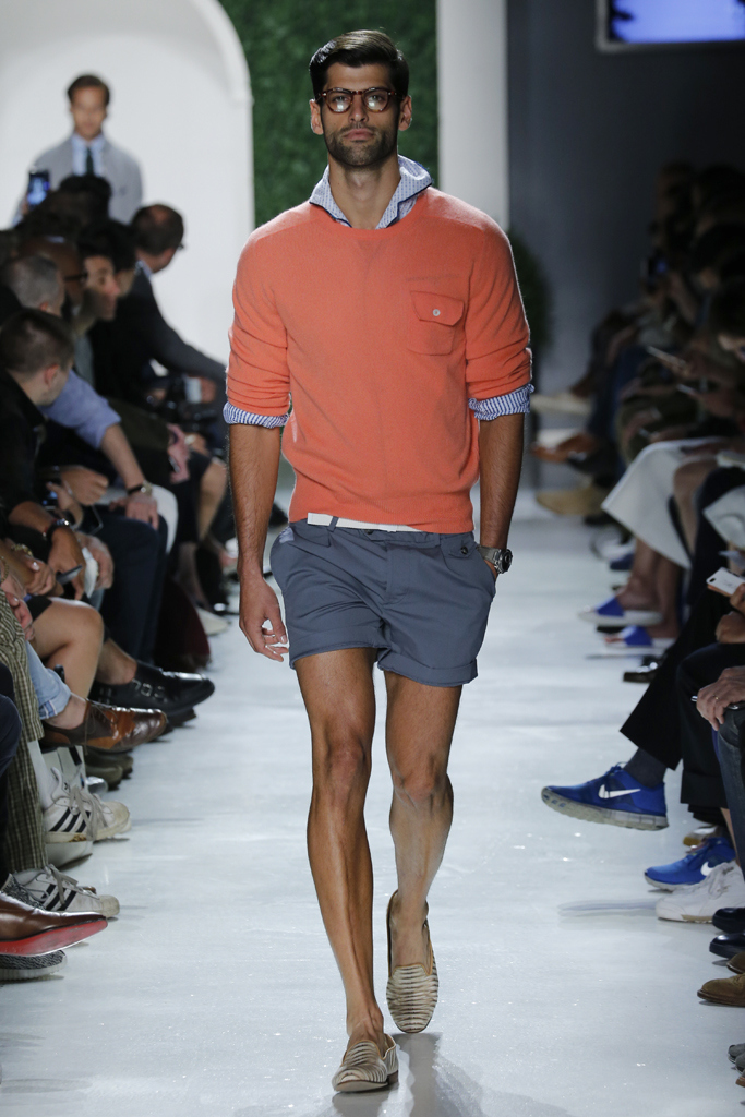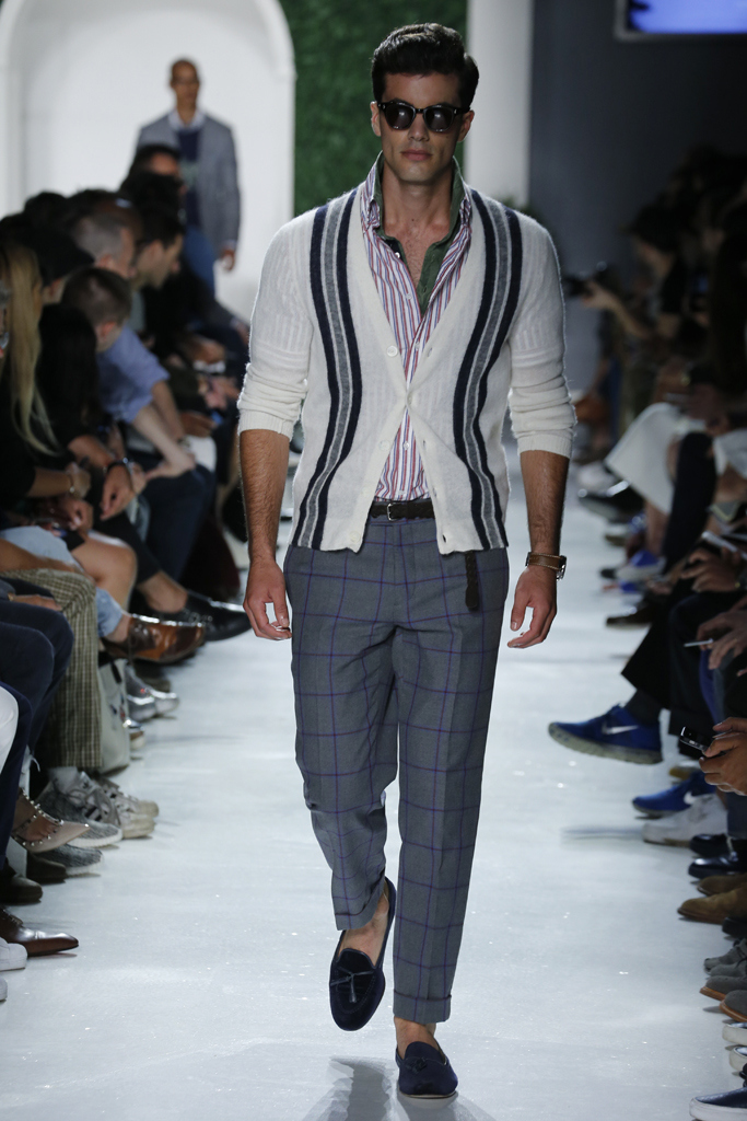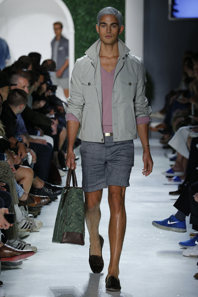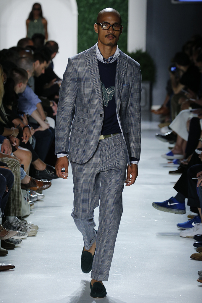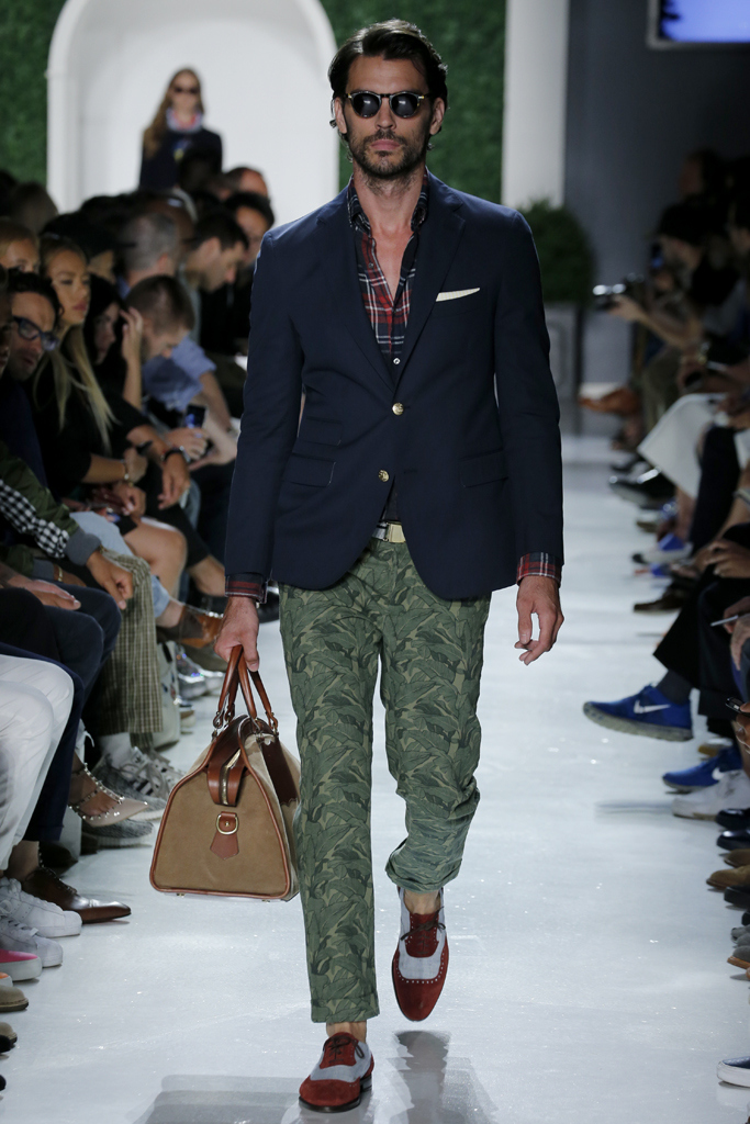 Although the inspiration was Southern California, Michael Bastian’s spring collection still offered up his signature uptown preppy aesthetic. The use of a banana leaf camouflage print throughout added a twist of newness to the classics. The print worked best as the element on the pants in suit separates paired with a navy blazer, as well as on a safari jacket paired with denim short shorts and as graphic elements in intarsia sweaters.
