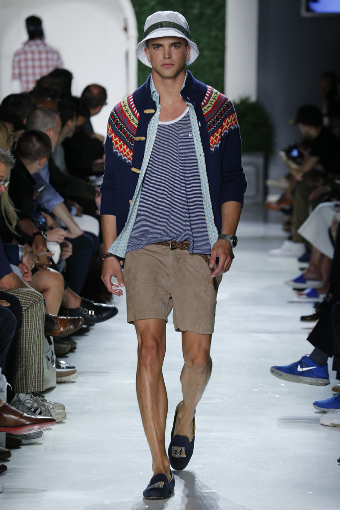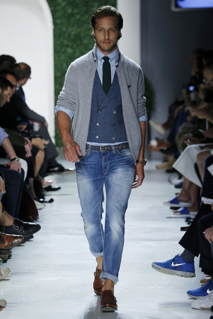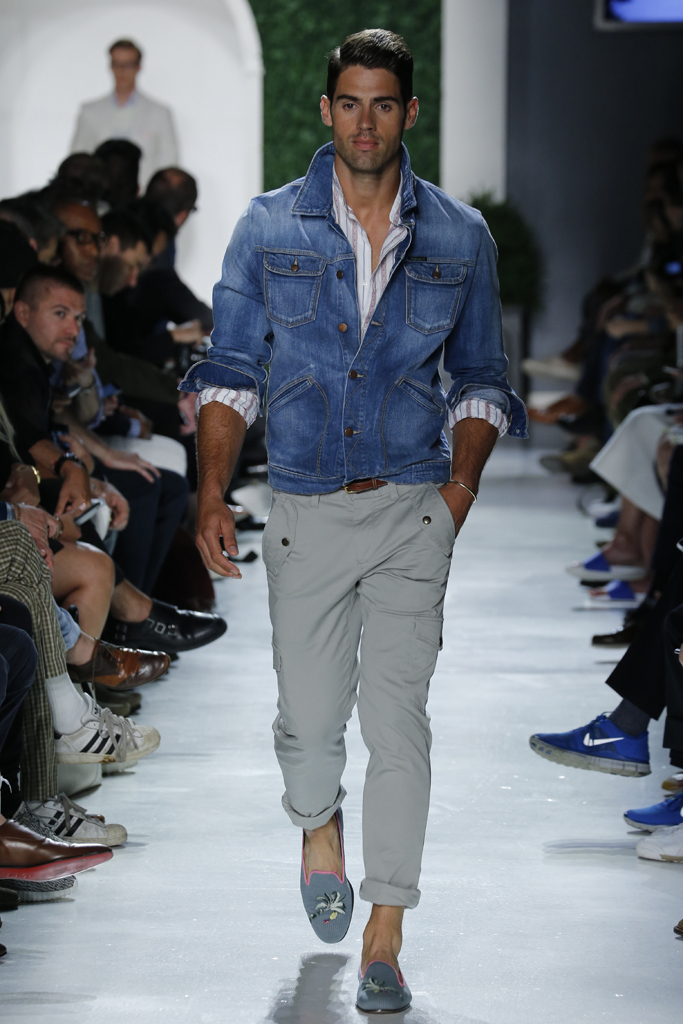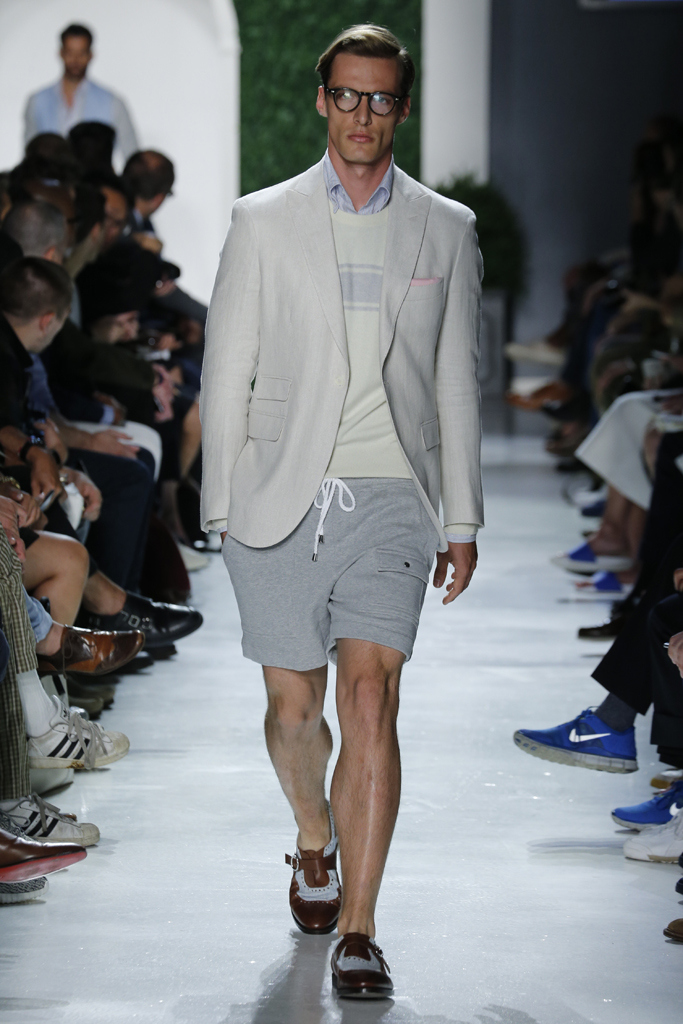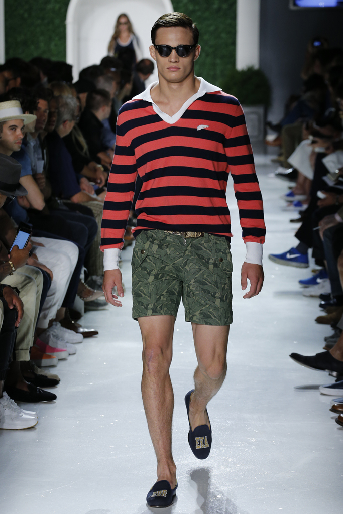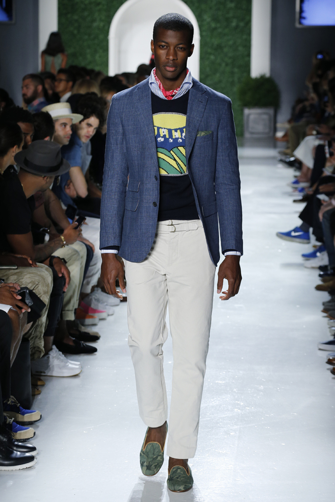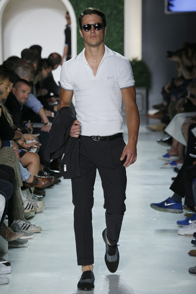 Although the inspiration was Southern California, Michael Bastian’s spring collection still offered up his signature uptown preppy aesthetic. The use of a banana leaf camouflage print throughout added a twist of newness to the classics. The print worked best as the element on the pants in suit separates paired with a navy blazer, as well as on a safari jacket paired with denim short shorts and as graphic elements in intarsia sweaters.