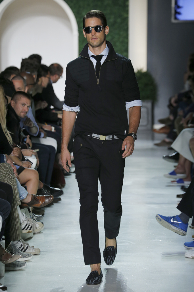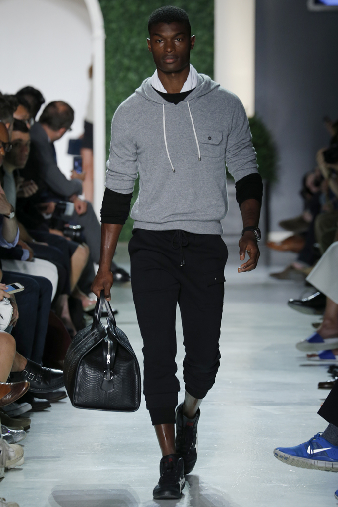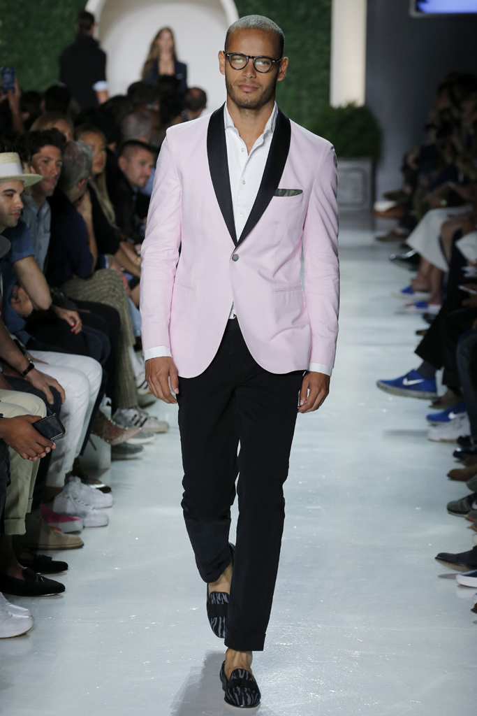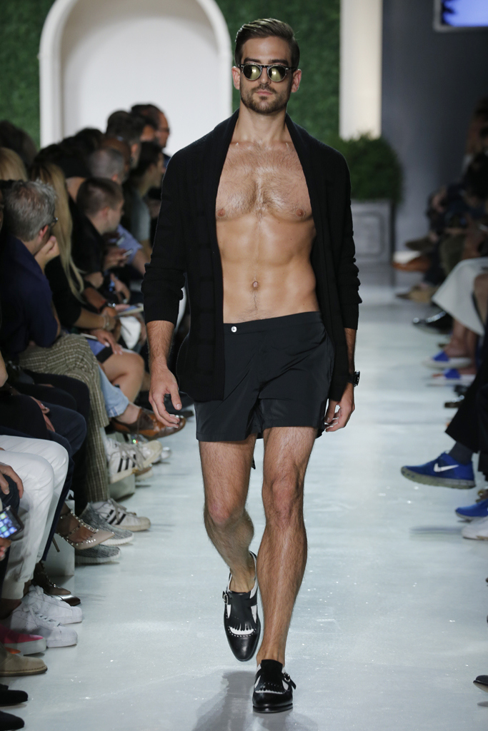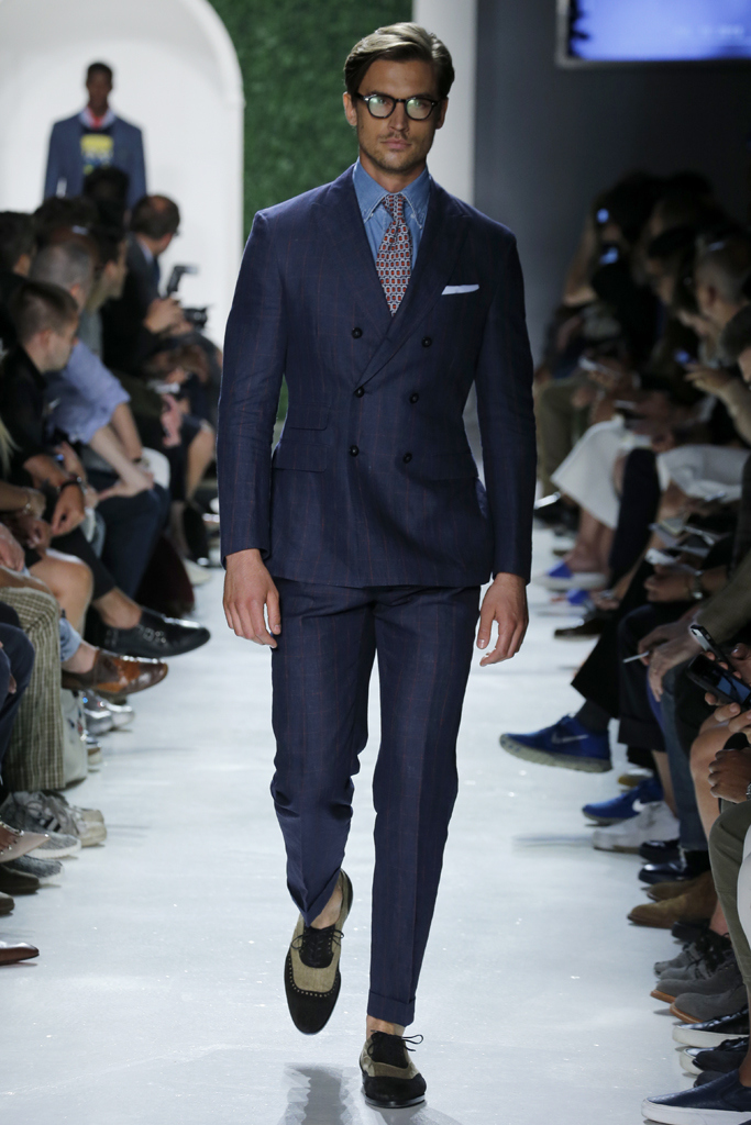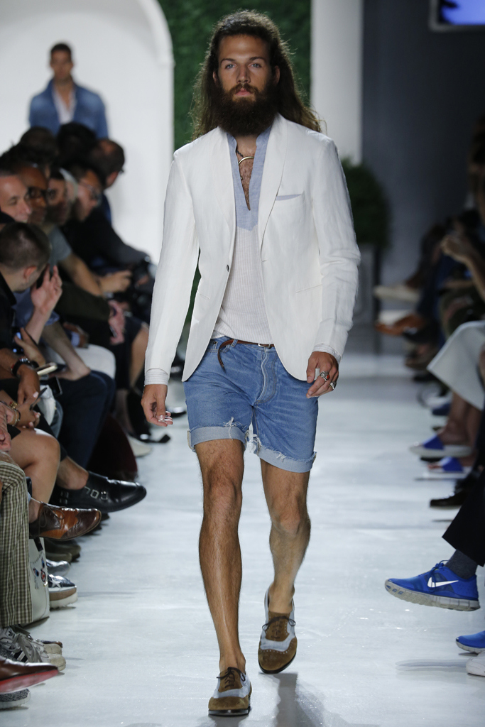 Although the inspiration was Southern California, Michael Bastian’s spring collection still offered up his signature uptown preppy aesthetic. The use of a banana leaf camouflage print throughout added a twist of newness to the classics. The print worked best as the element on the pants in suit separates paired with a navy blazer, as well as on a safari jacket paired with denim short shorts and as graphic elements in intarsia sweaters.