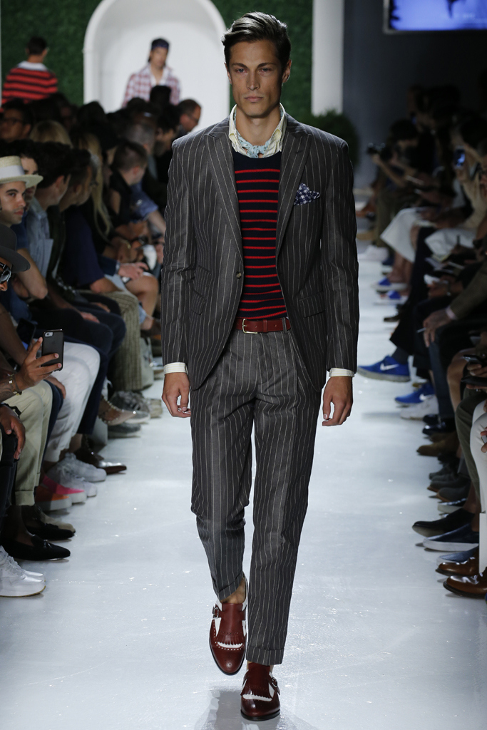Although the inspiration was Southern California, Michael Bastian’s spring collection still offered up his signature uptown preppy aesthetic. The use of a banana leaf camouflage print throughout added a twist of newness to the classics. The print worked best as the element on the pants in suit separates paired with a navy blazer, as well as on a safari jacket paired with denim short shorts and as graphic elements in intarsia sweaters.
