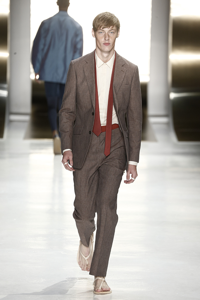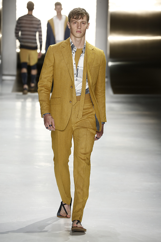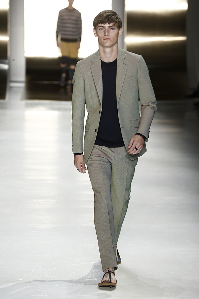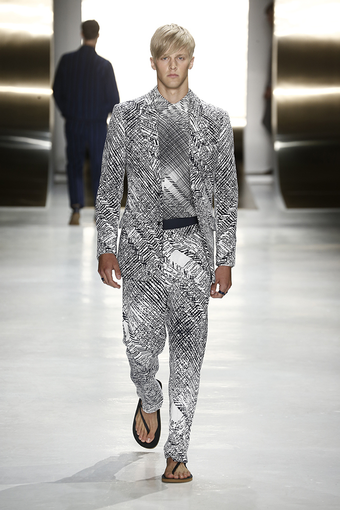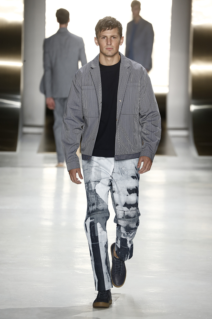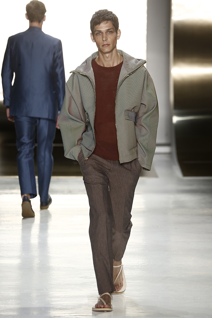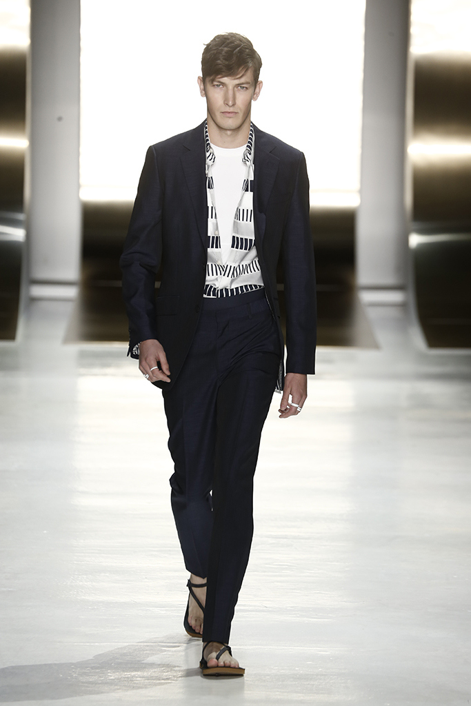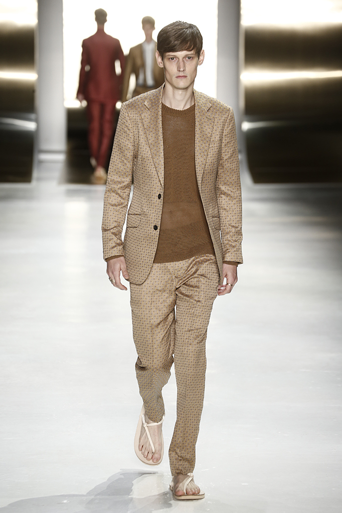 Playful prints in sweaters and jackets ranged from explosive weaves to painterly graphics, while the suit silhouette was very structured. The shoulder became more powerful, pants were fuller and the jackets were elongated. “I’m tired of seeing short jackets,” Maccari said.