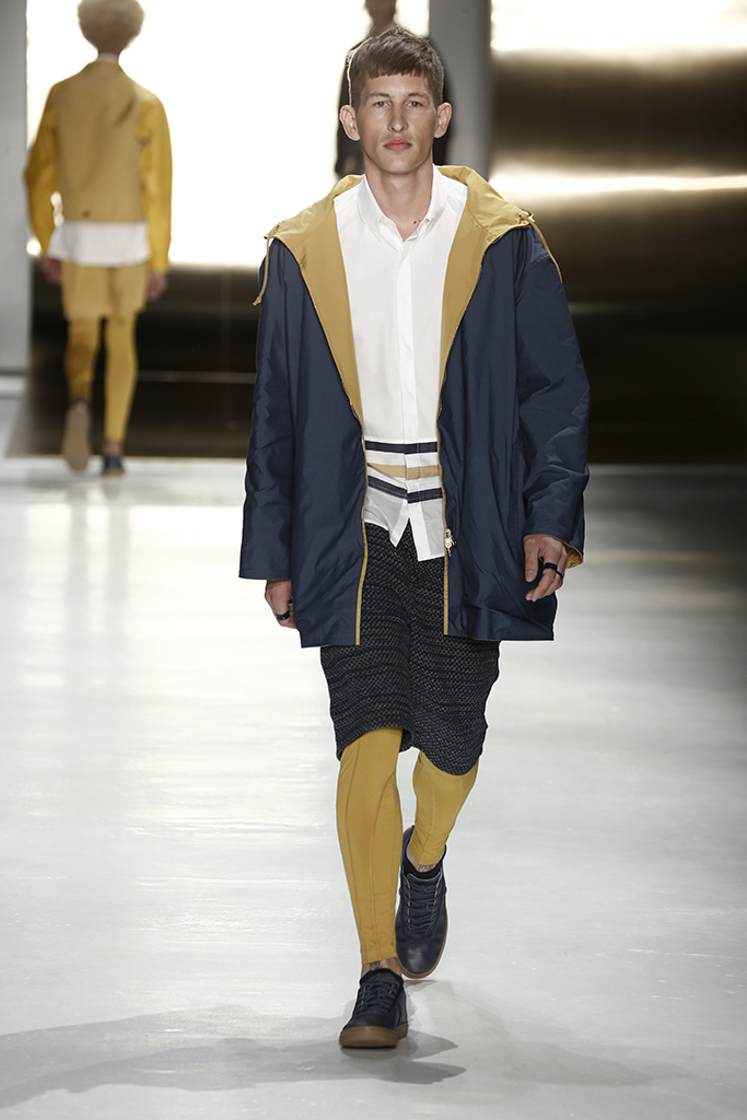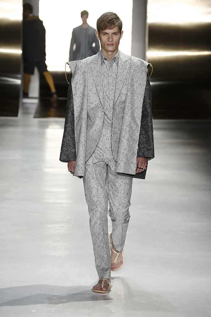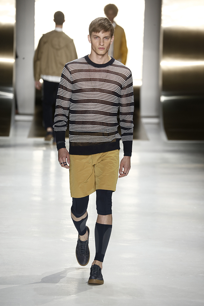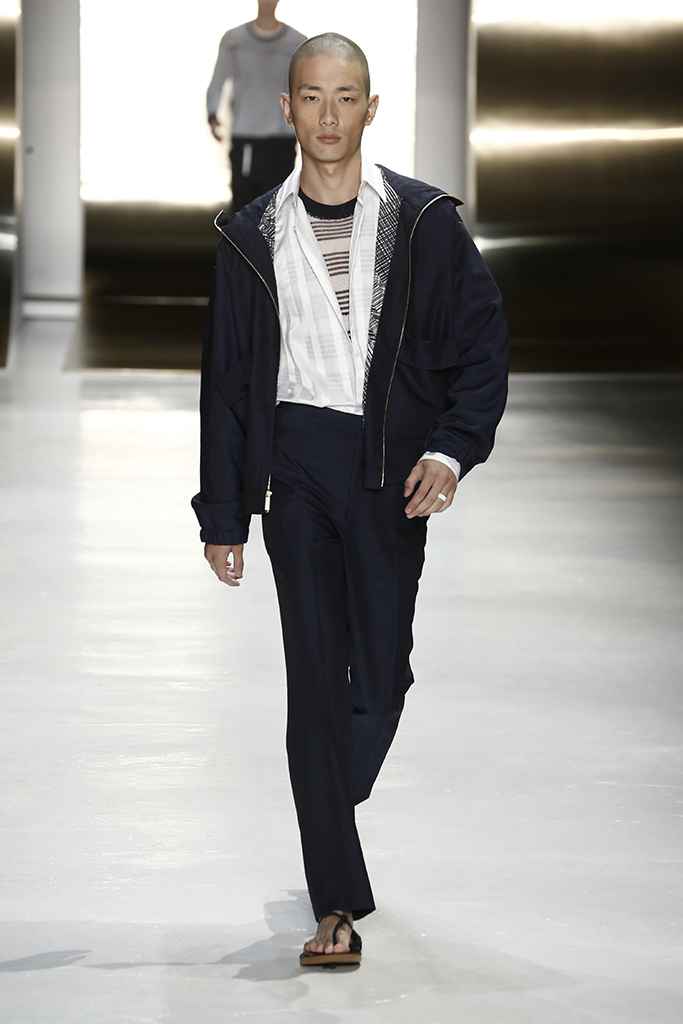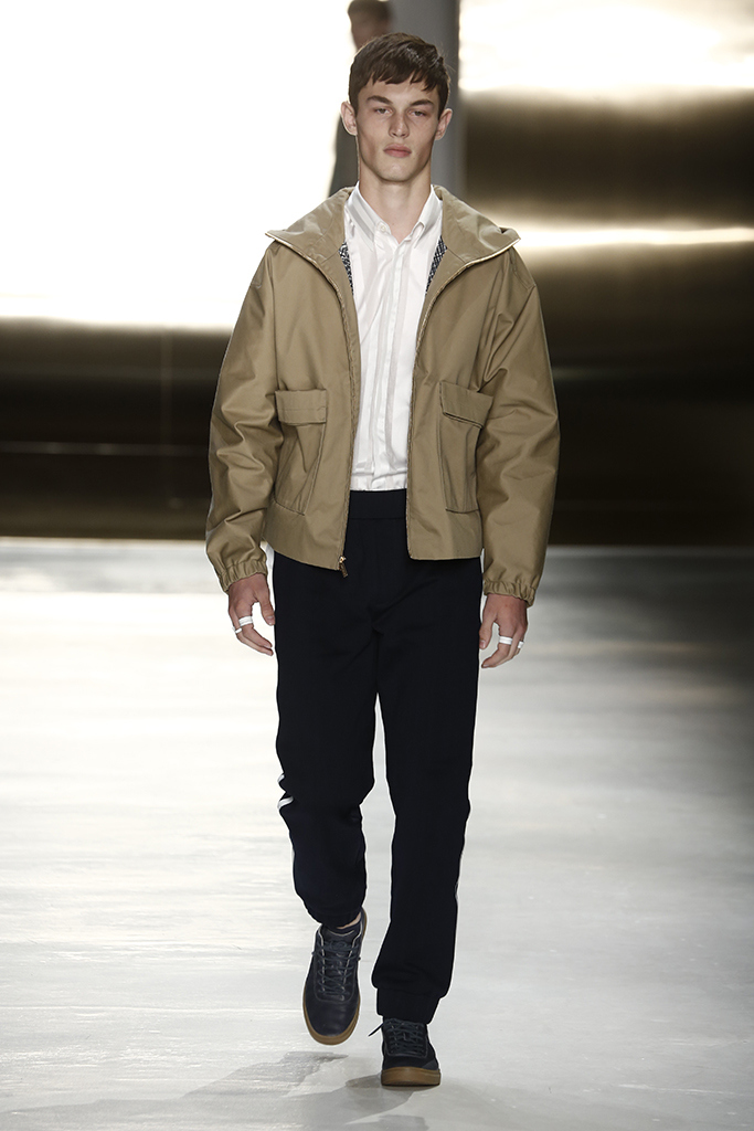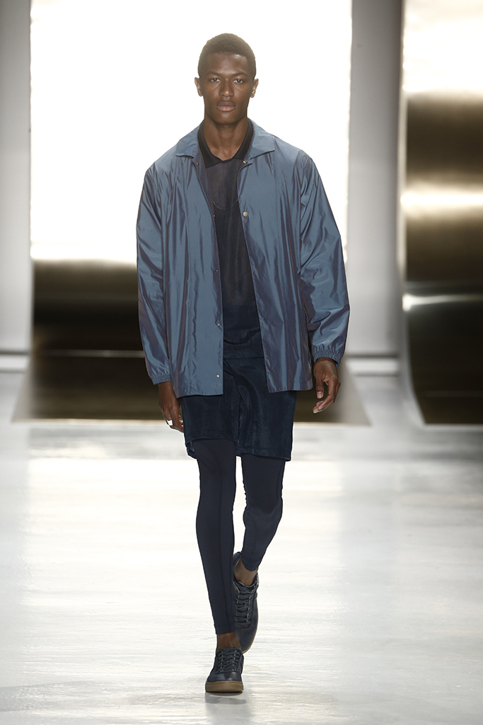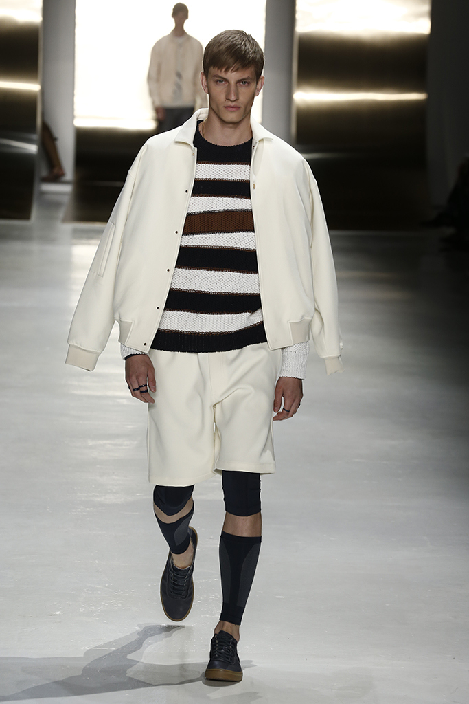 “I was inspired by guys coming to and from the gym,” he said, pointing to the open shirts, compression tights under baggy shorts and cropped bombers.
