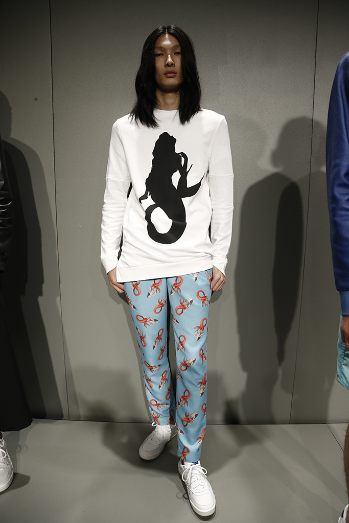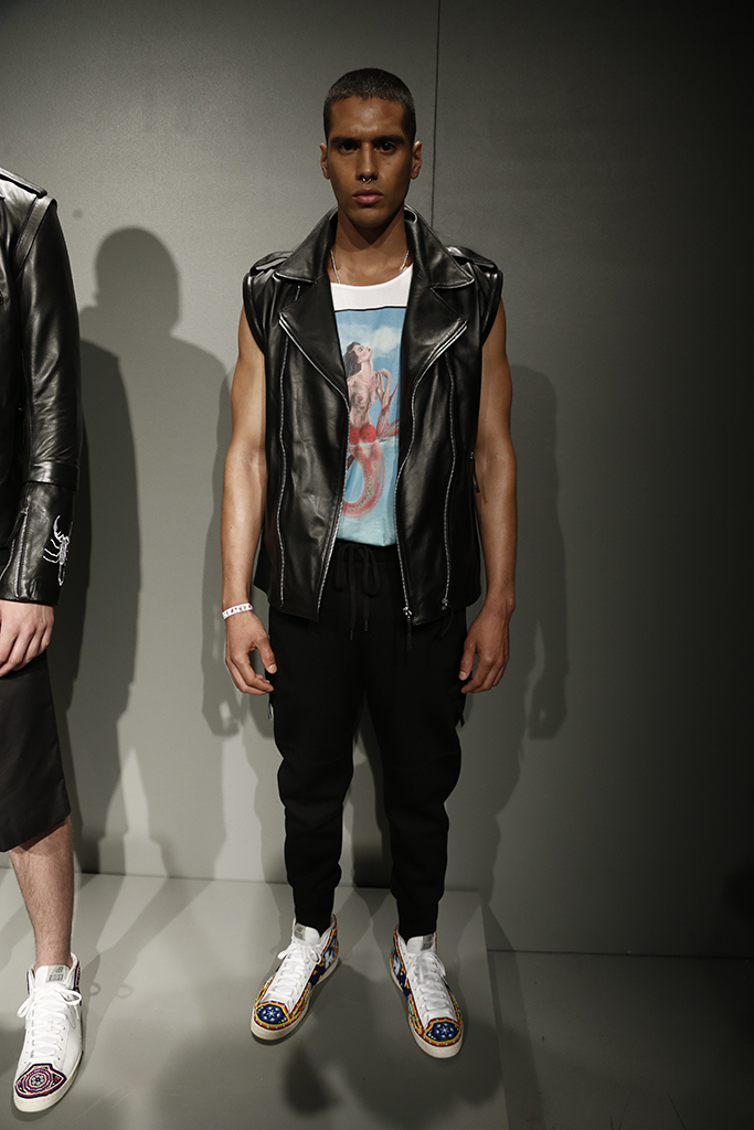 Seco used the Mexican card game “La Loteria” as the starting point for the offering, which was created around four cards from the game: the heart, the mermaid, the Scorpio and the palm leaf. These symbols showed up on matching bomber jackets and board shorts, blazers and graphic T-shirts. The hard edge of a leather moto vest was softened with a palm print embroidered on the back.
