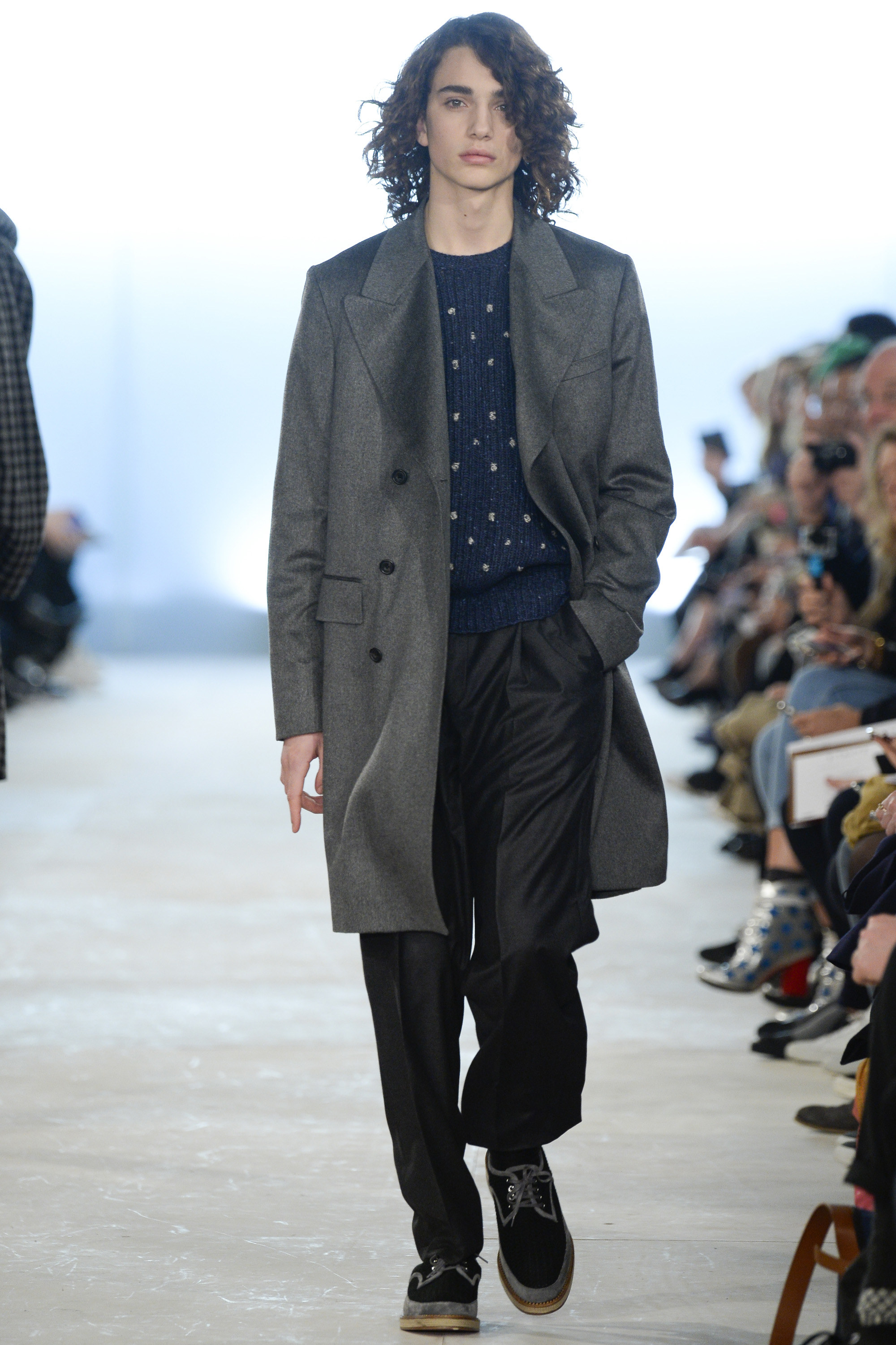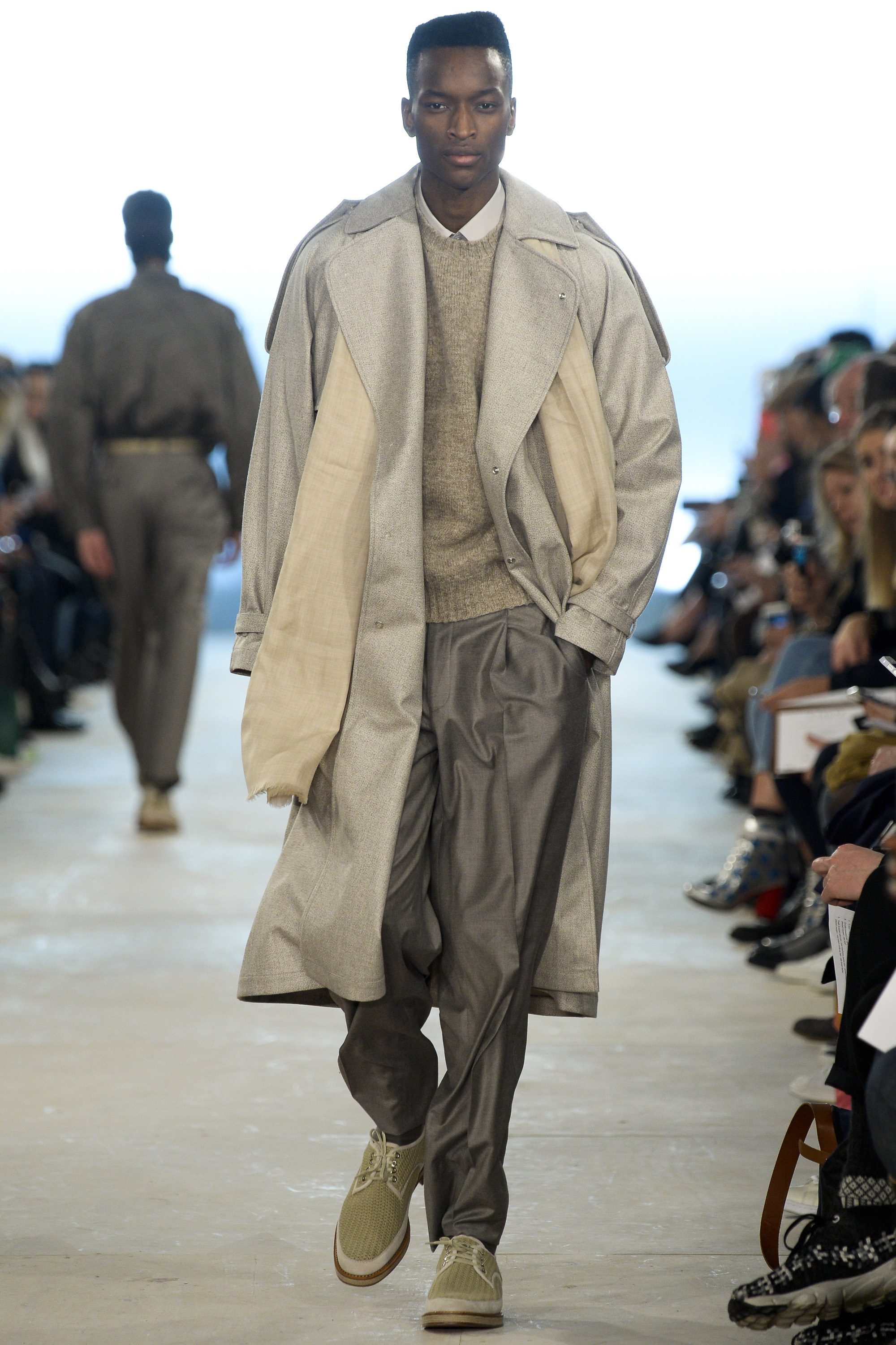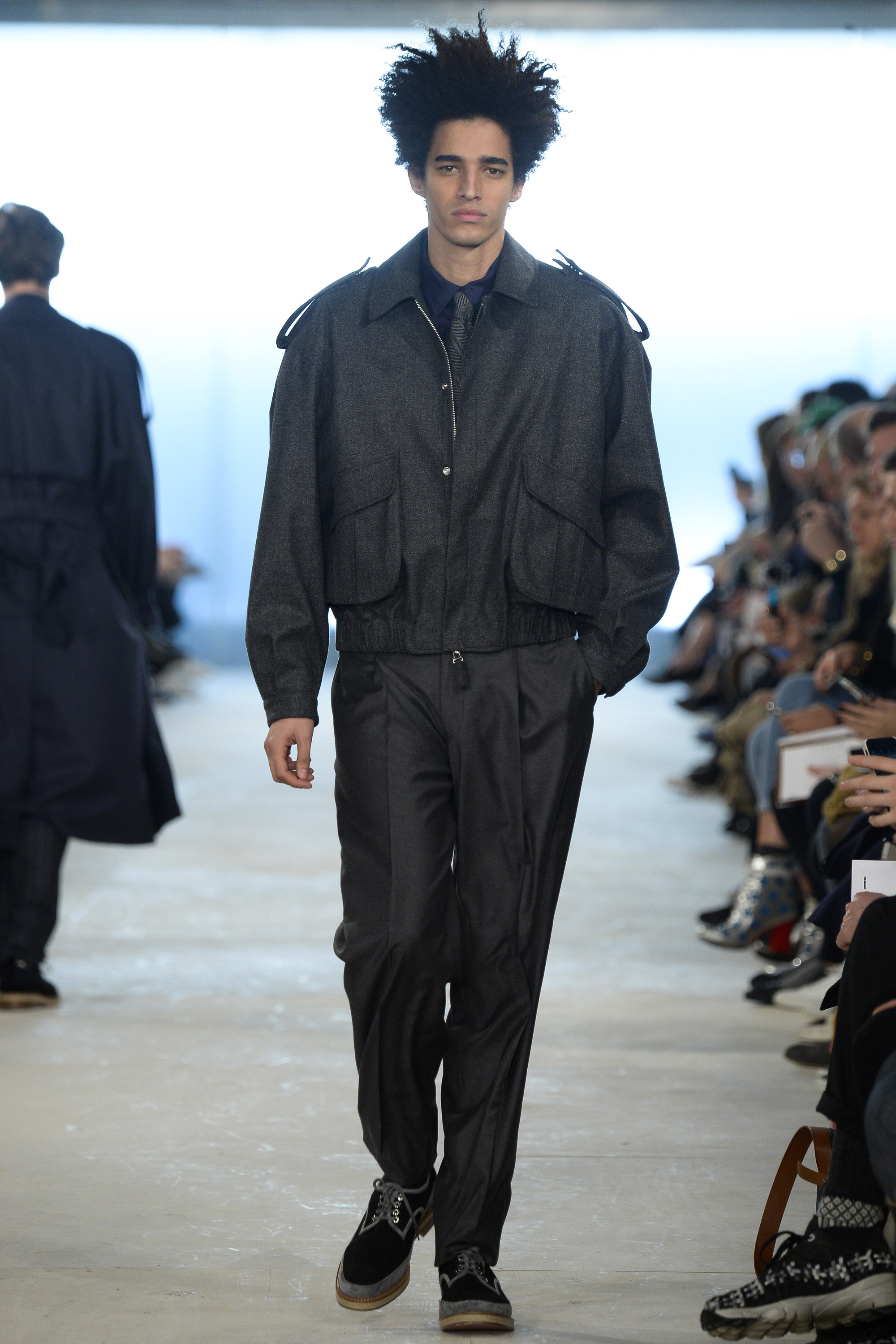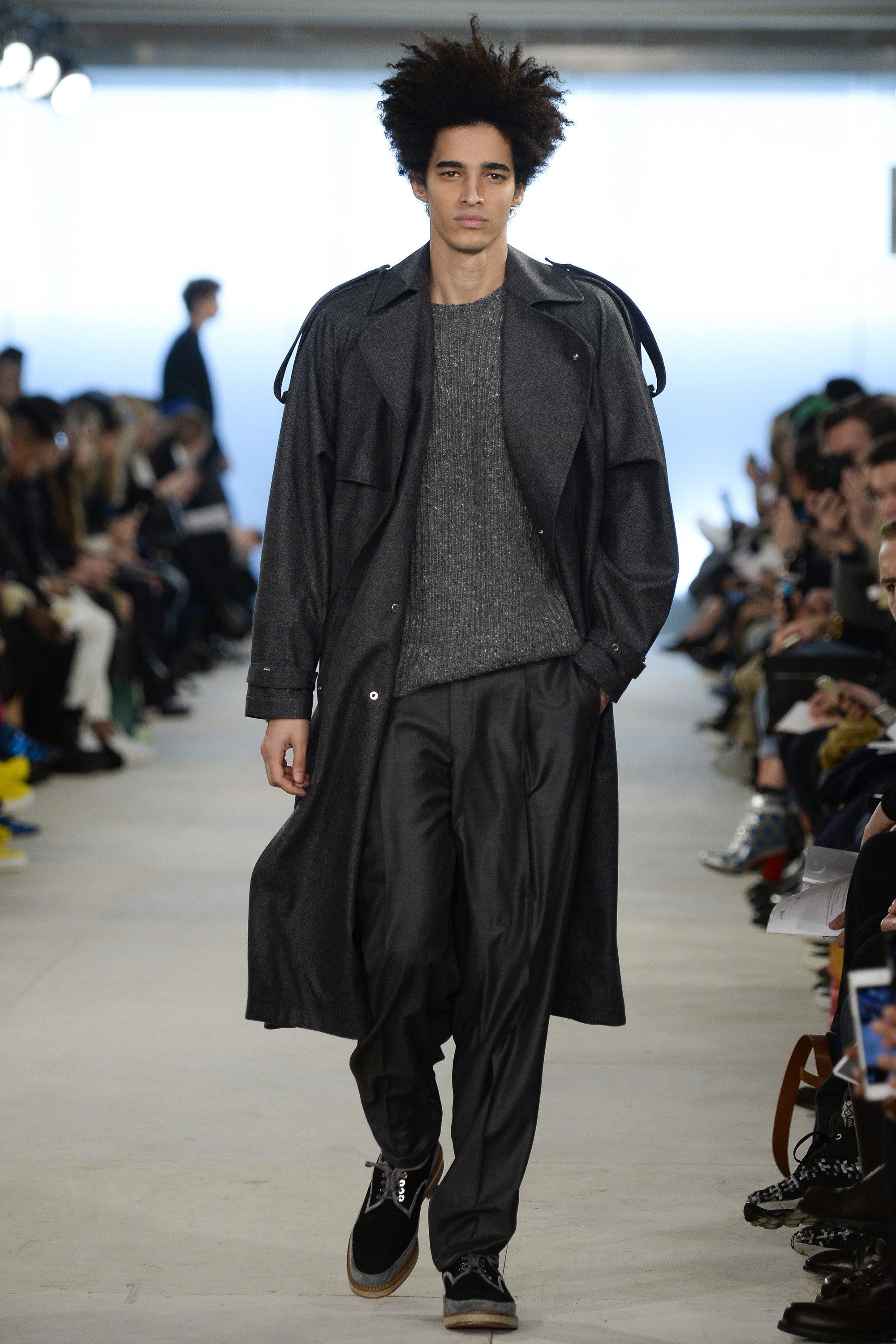 Which is why this E. Tautz collection presented Grant’s imagined ’80s as filtered via his label’s valiant mission to bring a Savile Row sensibility to seasonal fashion. There were plenty of recognizable tics from the time. Soft-shouldered, double-breasted wool trenchcoats in navy and gray featured tricep-tickling elongated epaulets. Black suit and black pocket shirt ensembles worn with clashing ties demanded reference to Gary Numan. A pullover top in a wool and nylon mix came with an off-kilter diagonal zipper at the neckline that Grant said was drawn from that reviled-in-retrospect garment, the shell suit (British English for the nylon paneled tracksuits of the ’80s and ’90s). There was a great deal of authentic, carefully observed billow above Grant’s high-waisted, single-pleat pants. It was nearly all perfectly lovely, which was perhaps the problem. Sylvester’s mighty 1984 release “Rock the Box” was featured on Grant’s soundtrack. Check it on YouTube for confirmation of just how queasy contemporary tastes really were. Grant is too much of an aesthete to go ugly—and these were fine clothes, indeed—but a flash or two of less filtered source material would have upped the impact of this collection.