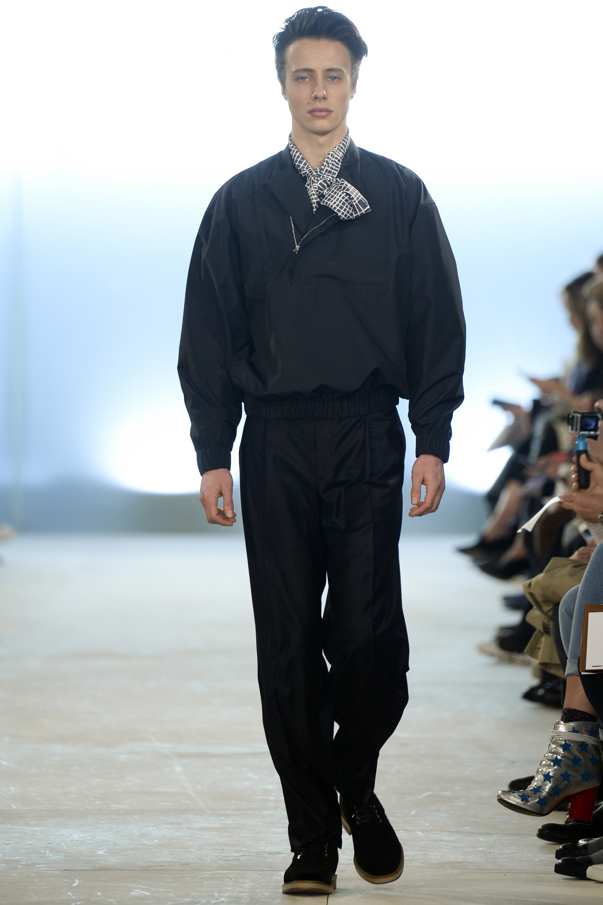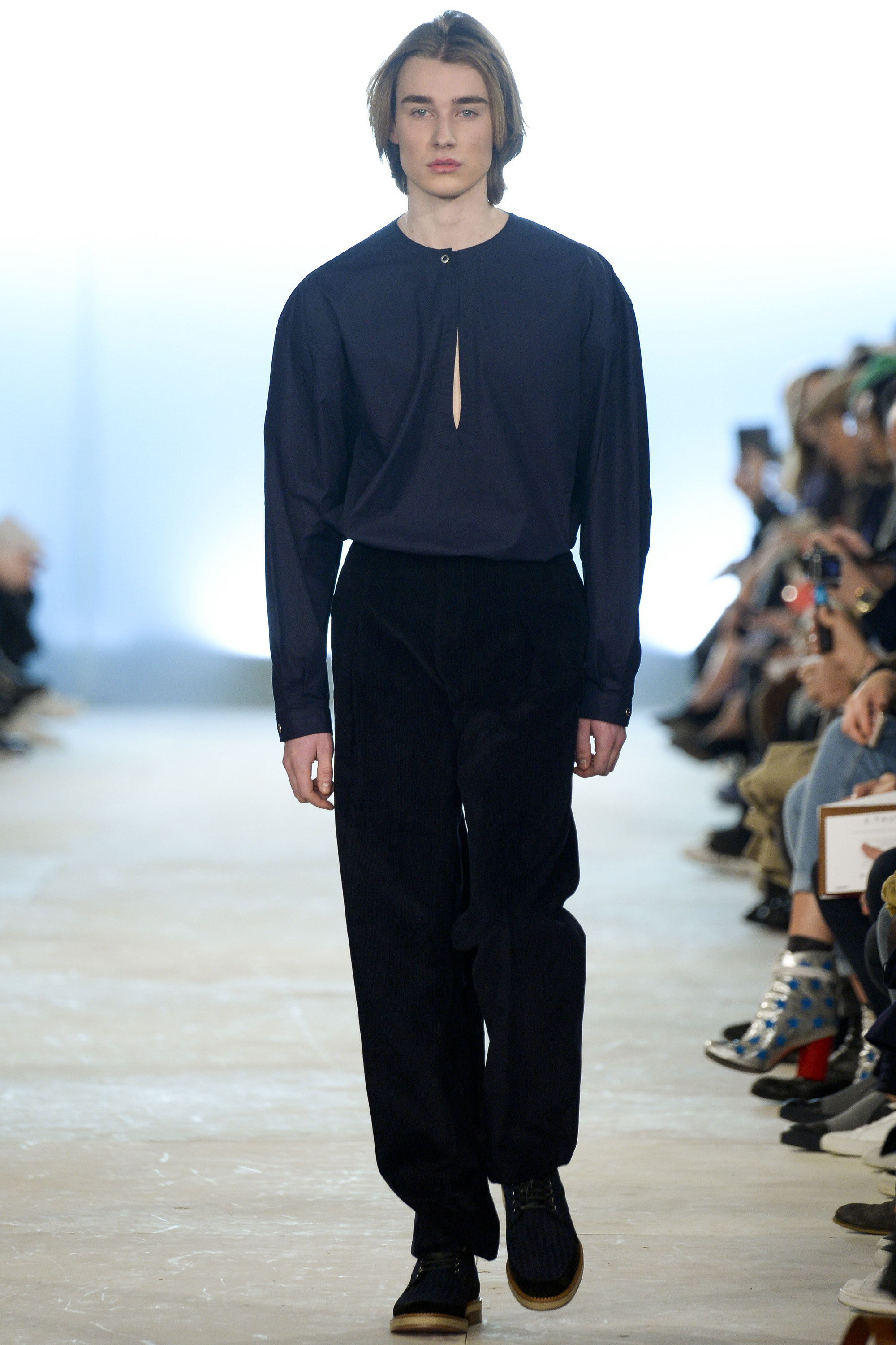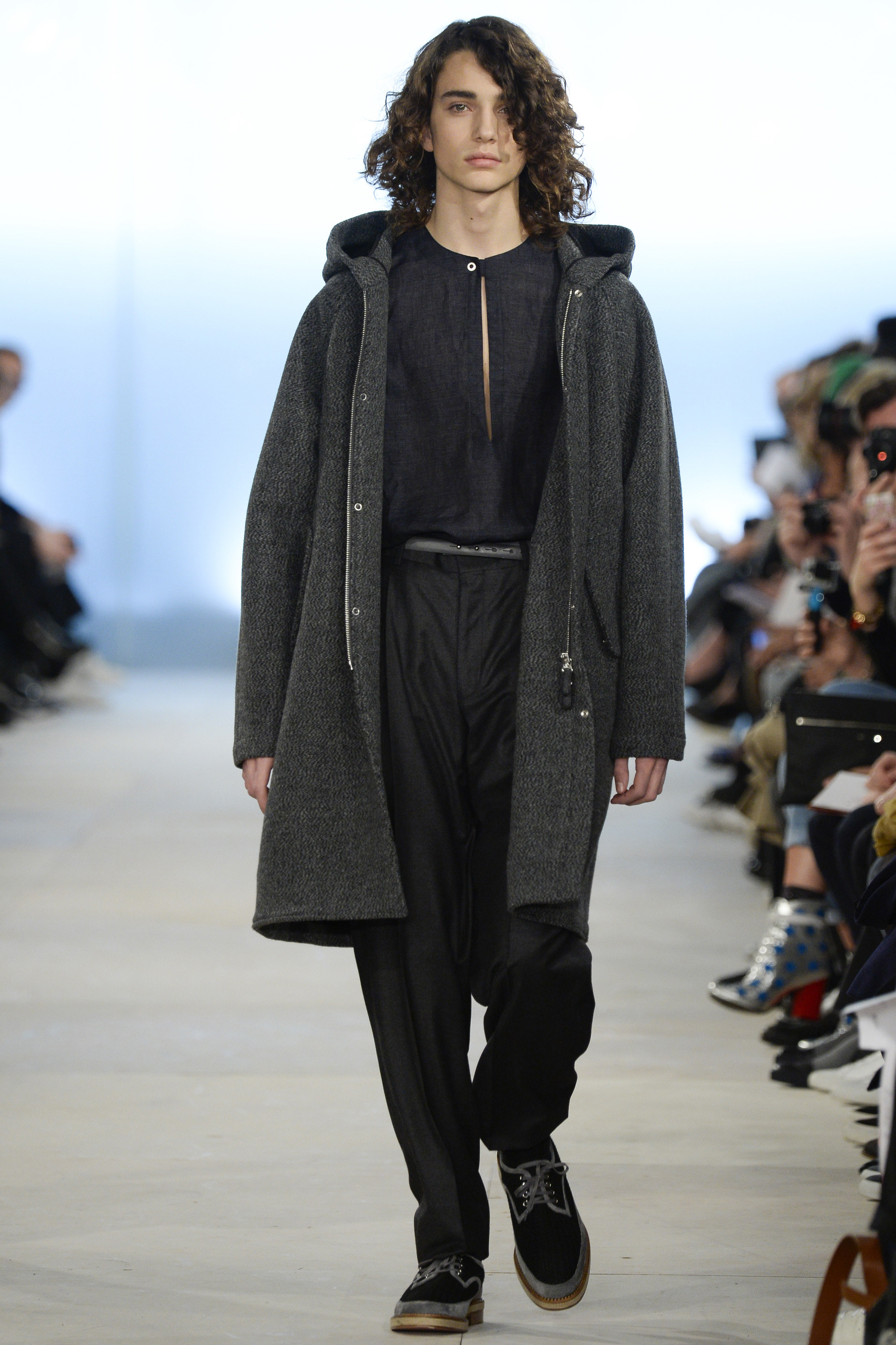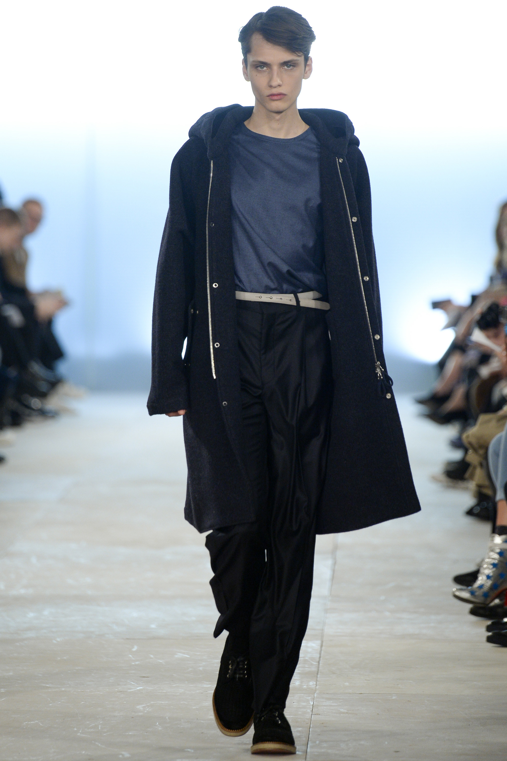Which is why this E. Tautz collection presented Grant’s imagined ’80s as filtered via his label’s valiant mission to bring a Savile Row sensibility to seasonal fashion. There were plenty of recognizable tics from the time. Soft-shouldered, double-breasted wool trenchcoats in navy and gray featured tricep-tickling elongated epaulets. Black suit and black pocket shirt ensembles worn with clashing ties demanded reference to Gary Numan. A pullover top in a wool and nylon mix came with an off-kilter diagonal zipper at the neckline that Grant said was drawn from that reviled-in-retrospect garment, the shell suit (British English for the nylon paneled tracksuits of the ’80s and ’90s). There was a great deal of authentic, carefully observed billow above Grant’s high-waisted, single-pleat pants. It was nearly all perfectly lovely, which was perhaps the problem. Sylvester’s mighty 1984 release “Rock the Box” was featured on Grant’s soundtrack. Check it on YouTube for confirmation of just how queasy contemporary tastes really were. Grant is too much of an aesthete to go ugly—and these were fine clothes, indeed—but a flash or two of less filtered source material would have upped the impact of this collection.