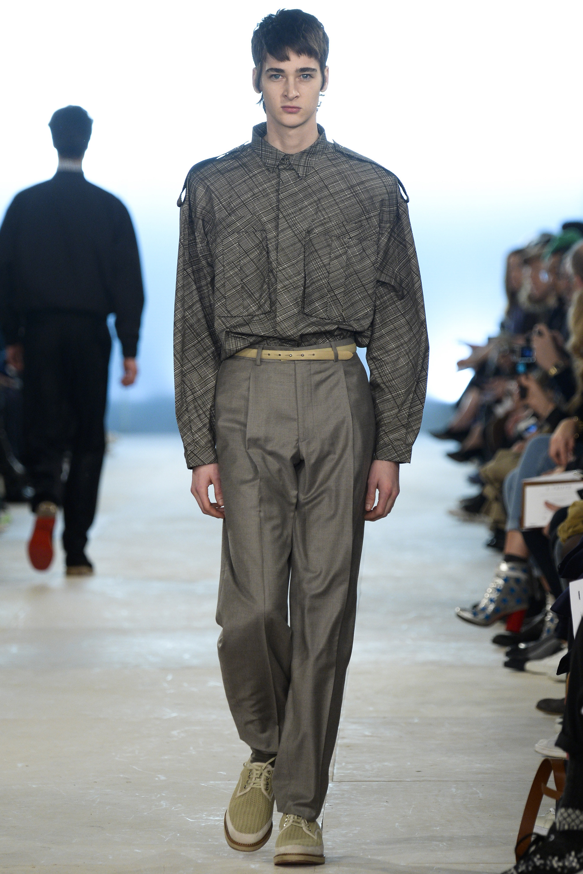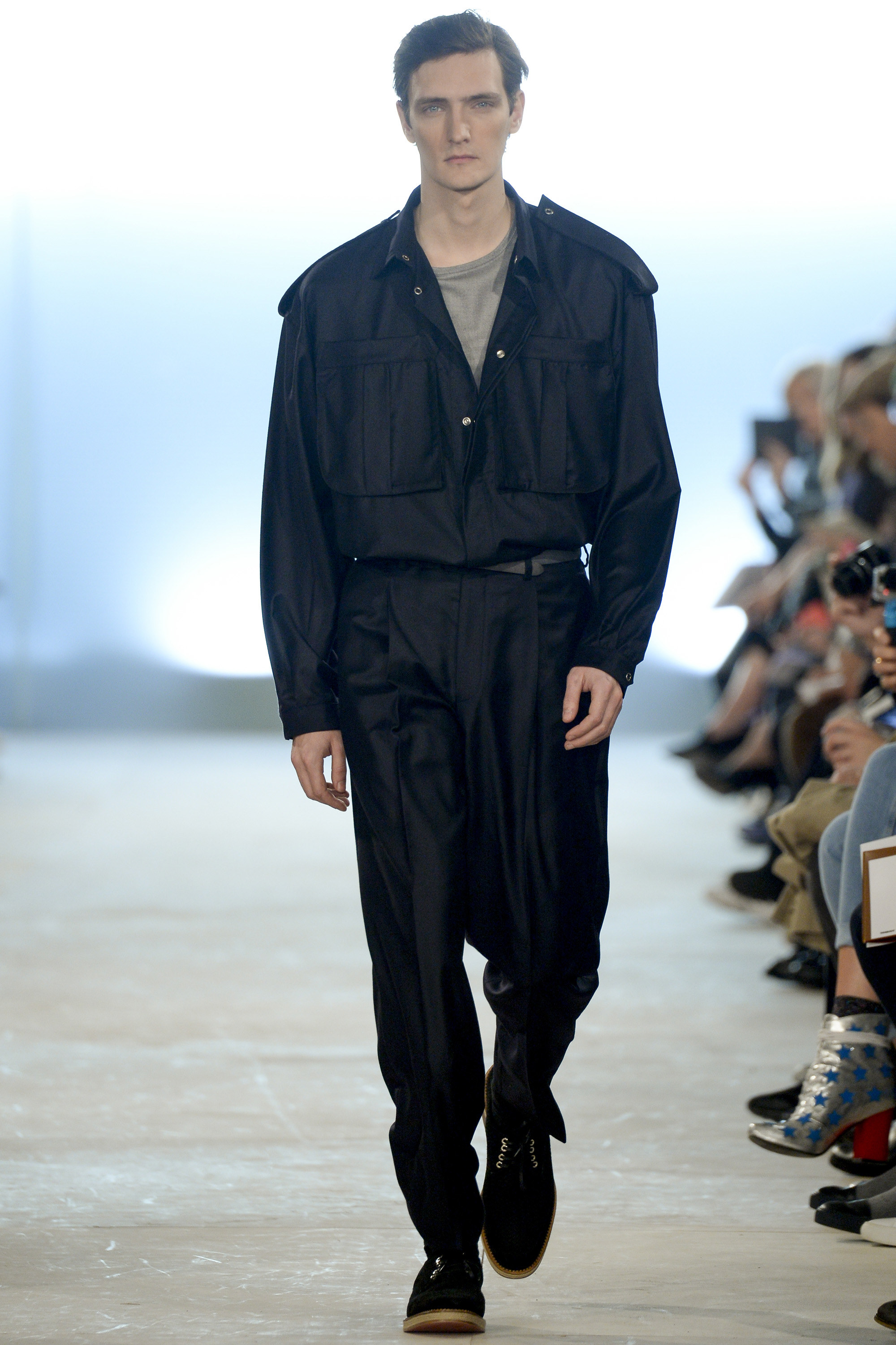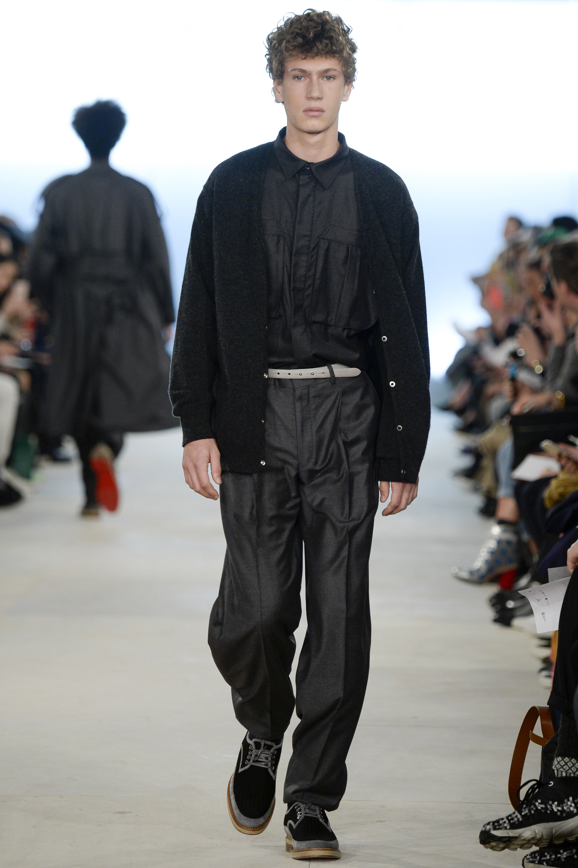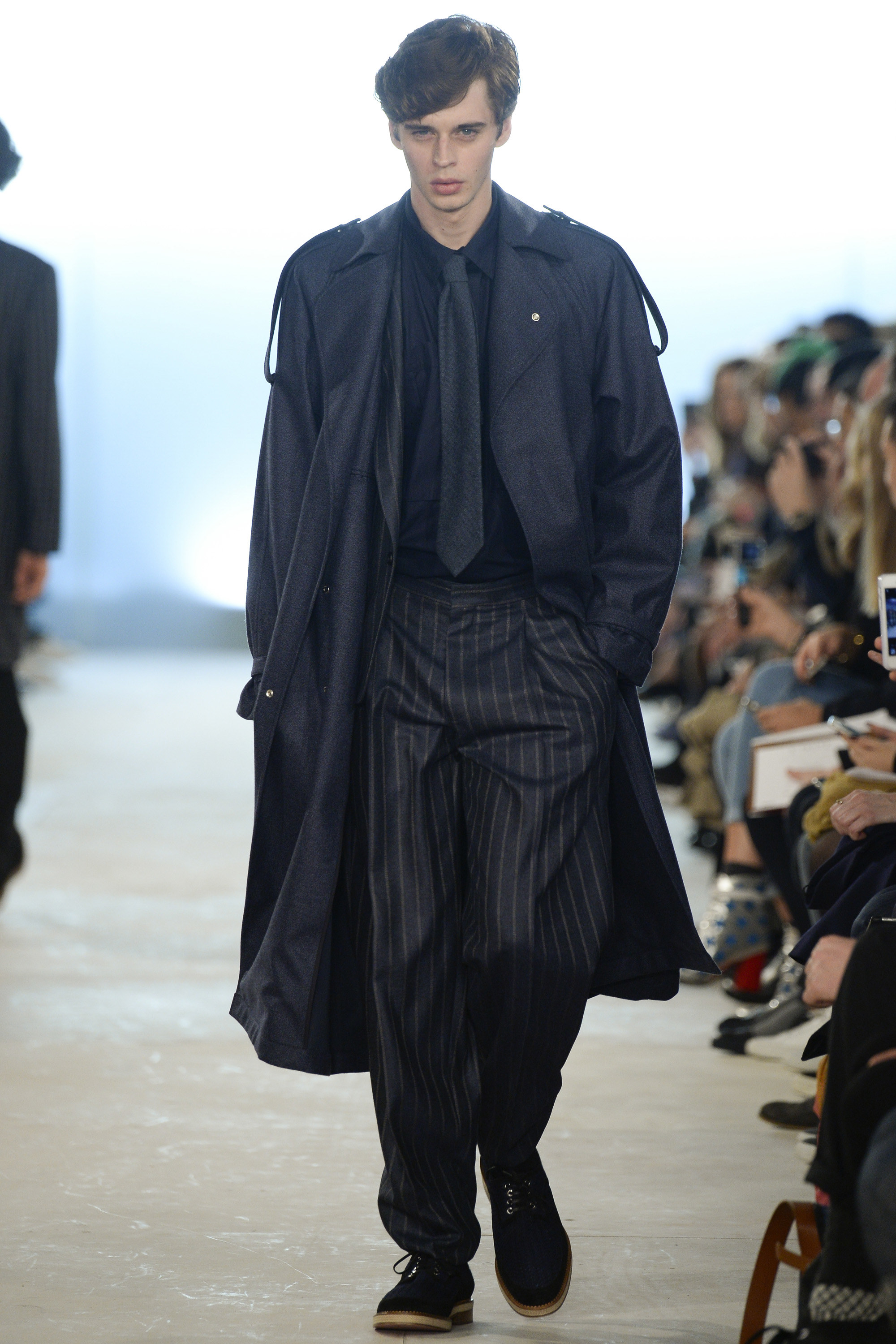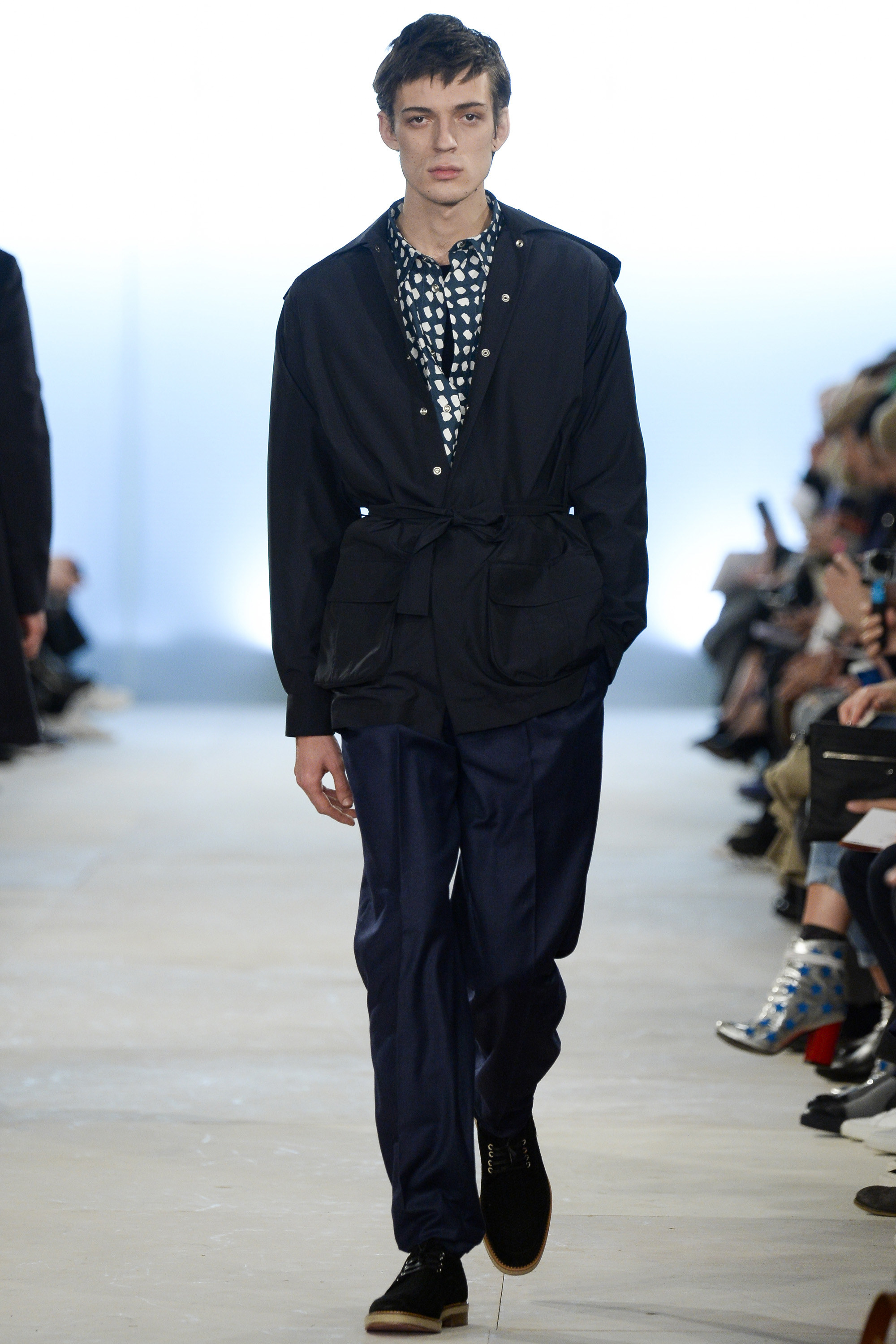 Which is why this E. Tautz collection presented Grant’s imagined ’80s as filtered via his label’s valiant mission to bring a Savile Row sensibility to seasonal fashion. There were plenty of recognizable tics from the time. Soft-shouldered, double-breasted wool trenchcoats in navy and gray featured tricep-tickling elongated epaulets. Black suit and black pocket shirt ensembles worn with clashing ties demanded reference to Gary Numan. A pullover top in a wool and nylon mix came with an off-kilter diagonal zipper at the neckline that Grant said was drawn from that reviled-in-retrospect garment, the shell suit (British English for the nylon paneled tracksuits of the ’80s and ’90s). There was a great deal of authentic, carefully observed billow above Grant’s high-waisted, single-pleat pants. It was nearly all perfectly lovely, which was perhaps the problem. Sylvester’s mighty 1984 release “Rock the Box” was featured on Grant’s soundtrack. Check it on YouTube for confirmation of just how queasy contemporary tastes really were. Grant is too much of an aesthete to go ugly—and these were fine clothes, indeed—but a flash or two of less filtered source material would have upped the impact of this collection.