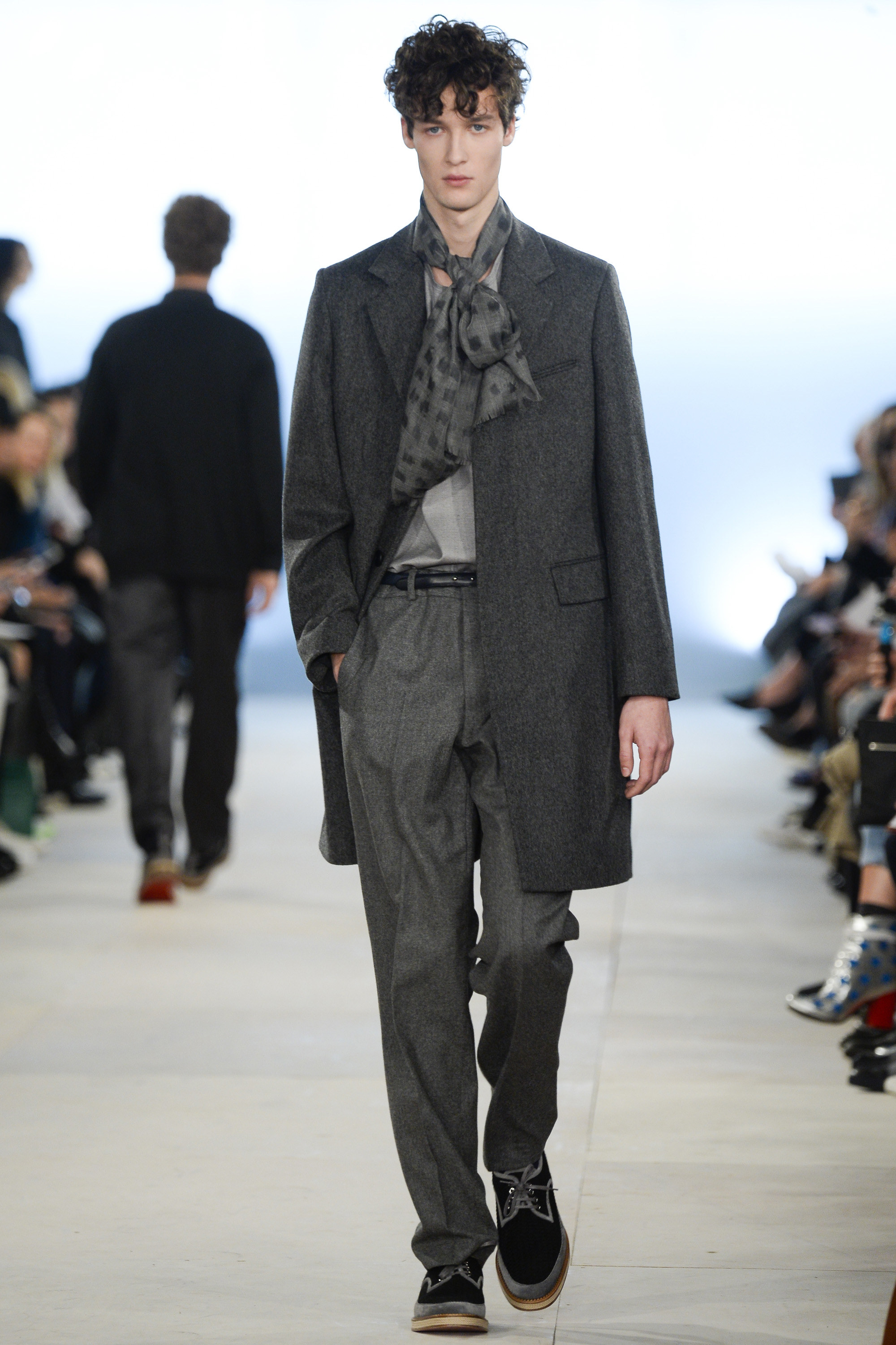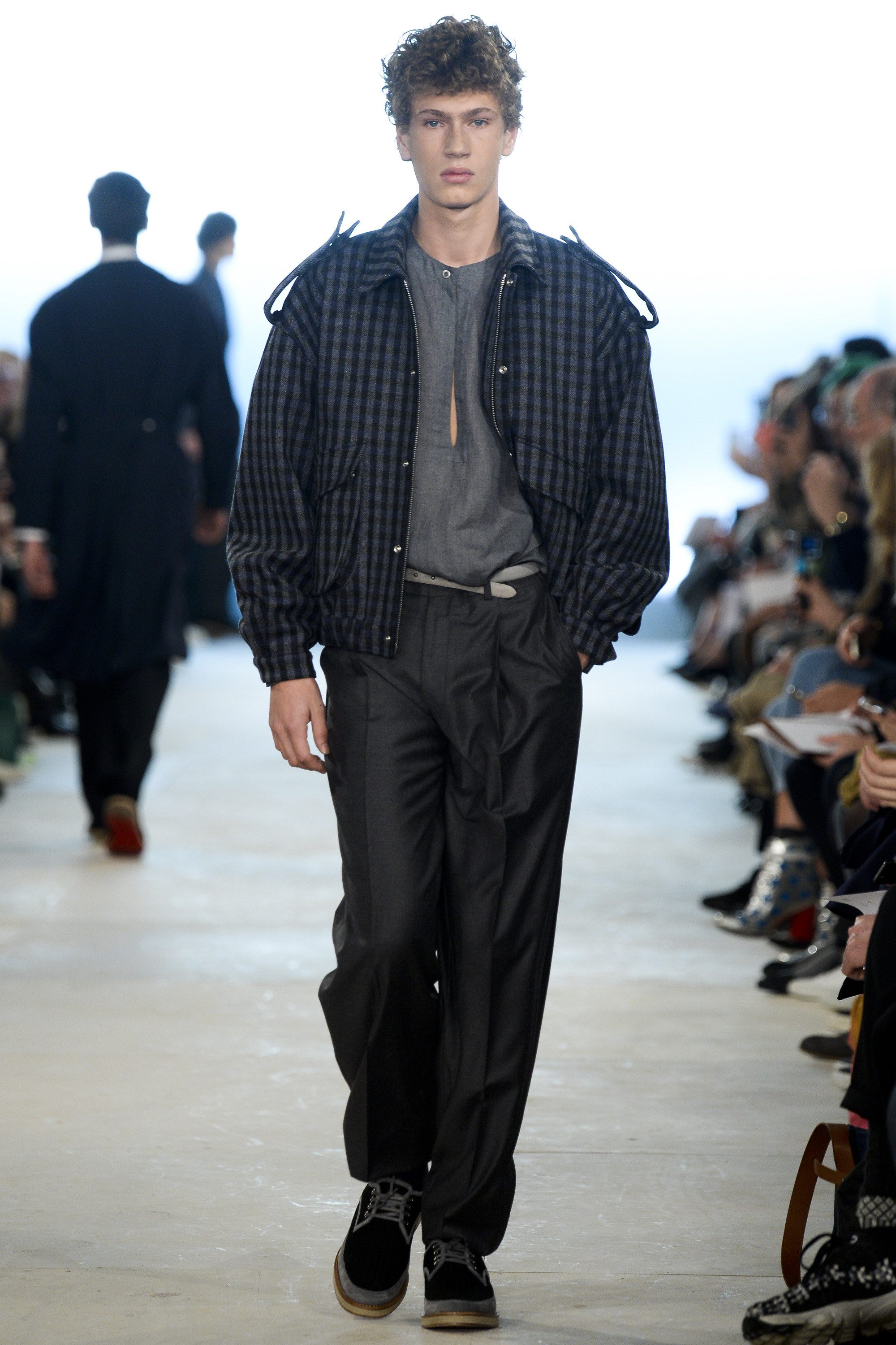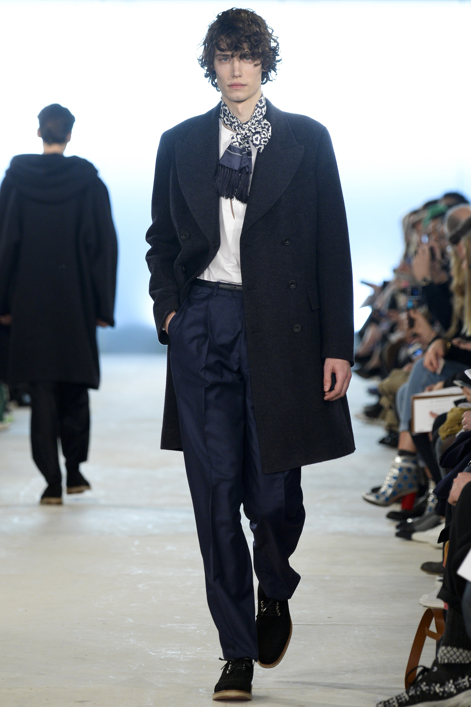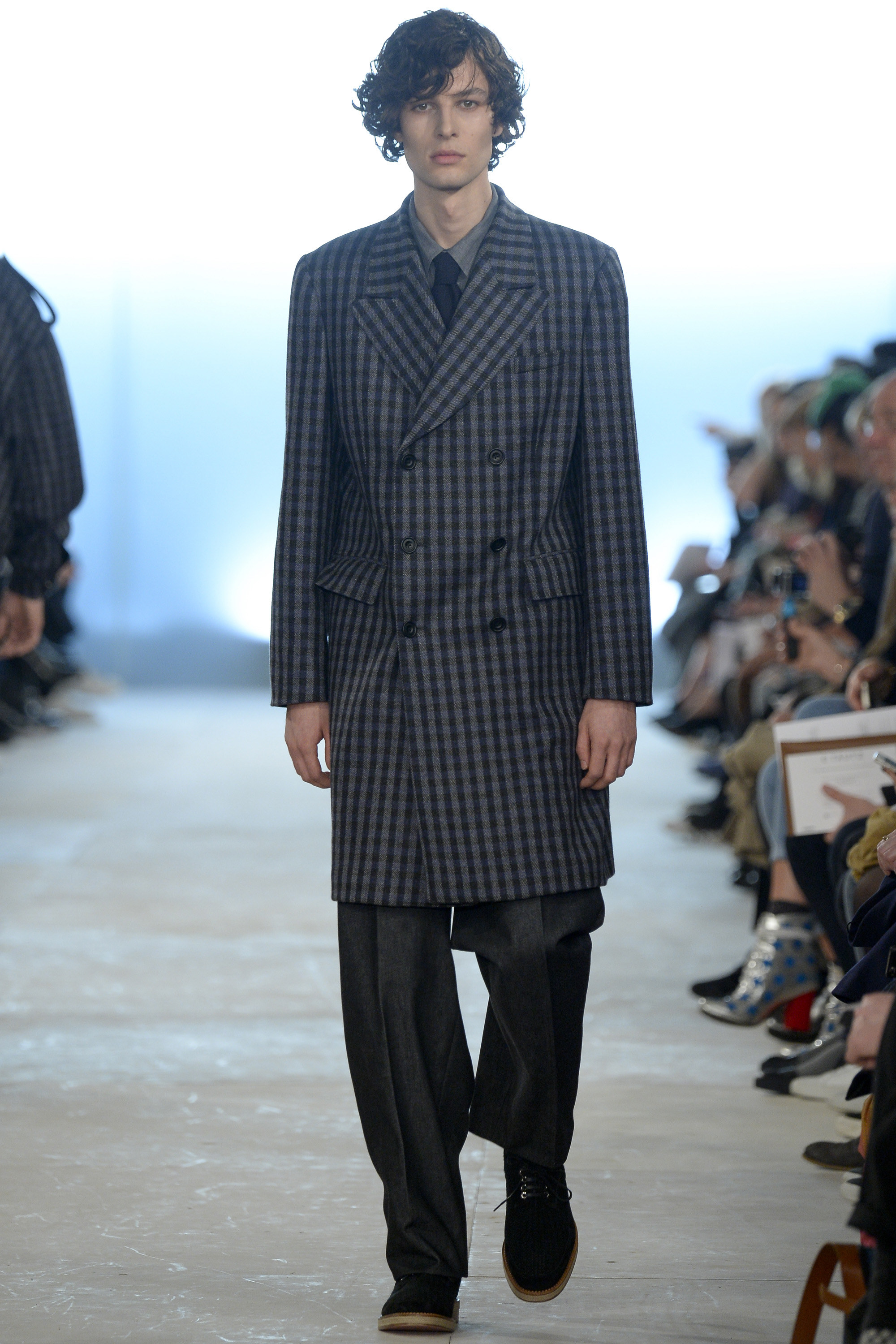 Which is why this E. Tautz collection presented Grant’s imagined ’80s as filtered via his label’s valiant mission to bring a Savile Row sensibility to seasonal fashion. There were plenty of recognizable tics from the time. Soft-shouldered, double-breasted wool trenchcoats in navy and gray featured tricep-tickling elongated epaulets. Black suit and black pocket shirt ensembles worn with clashing ties demanded reference to Gary Numan. A pullover top in a wool and nylon mix came with an off-kilter diagonal zipper at the neckline that Grant said was drawn from that reviled-in-retrospect garment, the shell suit (British English for the nylon paneled tracksuits of the ’80s and ’90s). There was a great deal of authentic, carefully observed billow above Grant’s high-waisted, single-pleat pants. It was nearly all perfectly lovely, which was perhaps the problem. Sylvester’s mighty 1984 release “Rock the Box” was featured on Grant’s soundtrack. Check it on YouTube for confirmation of just how queasy contemporary tastes really were. Grant is too much of an aesthete to go ugly—and these were fine clothes, indeed—but a flash or two of less filtered source material would have upped the impact of this collection.